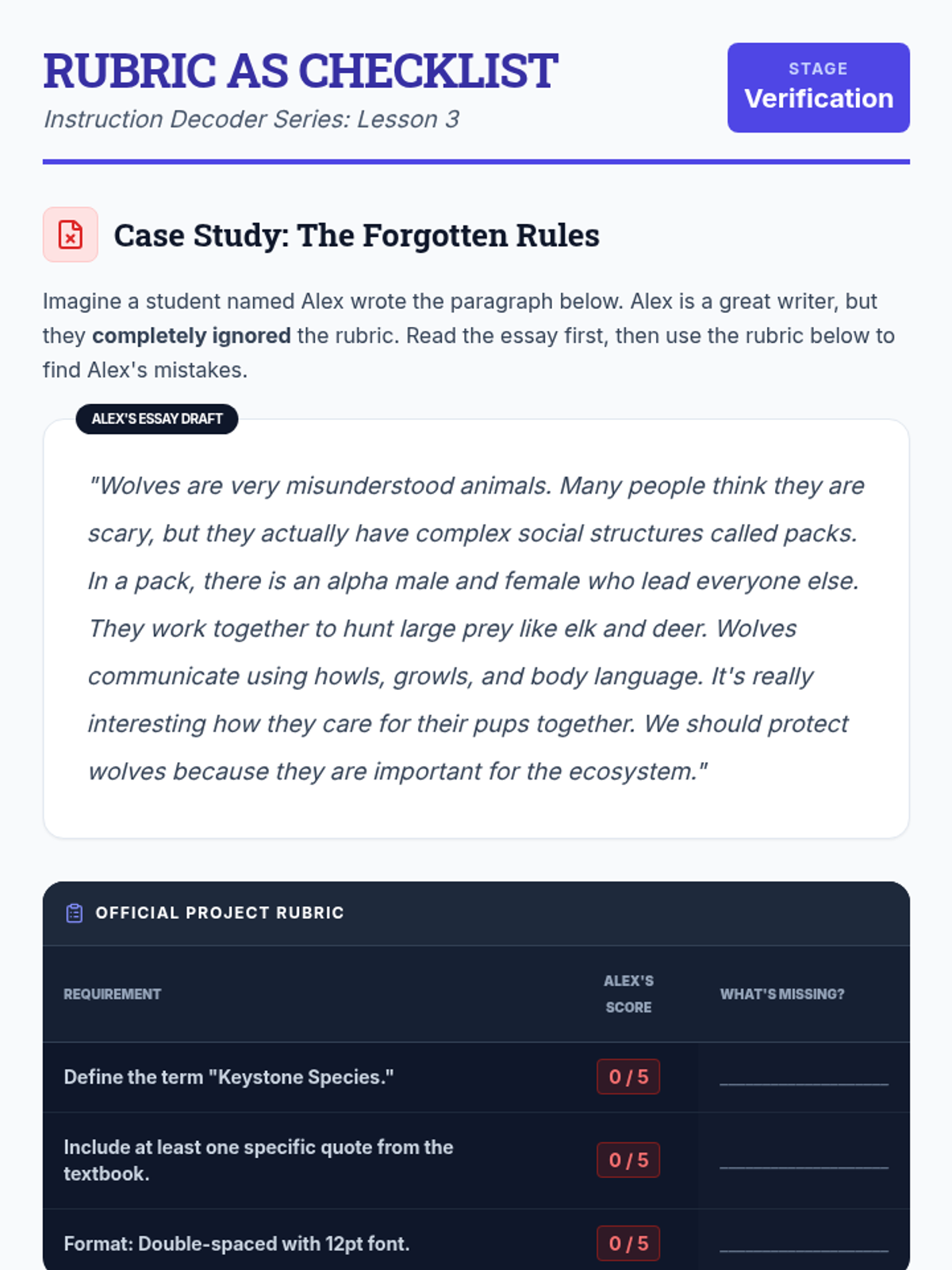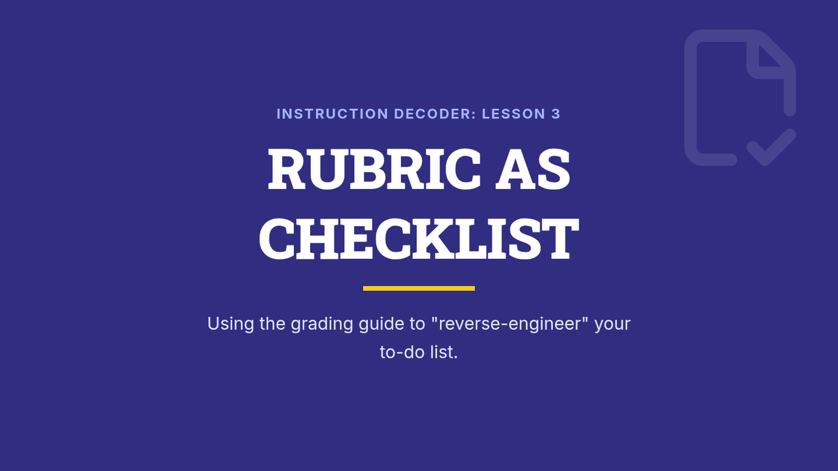 Students learn to use a grading rubric as a reverse-engineered checklist, practicing cross-referencing their output against specific criteria to ensure all instructions are followed.