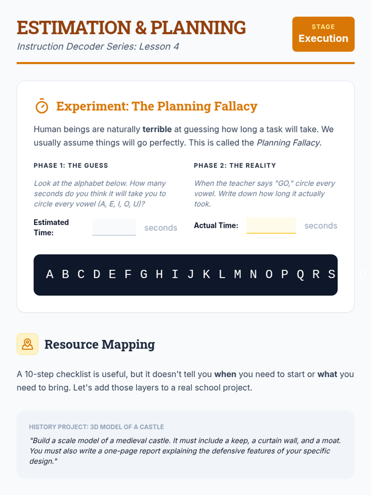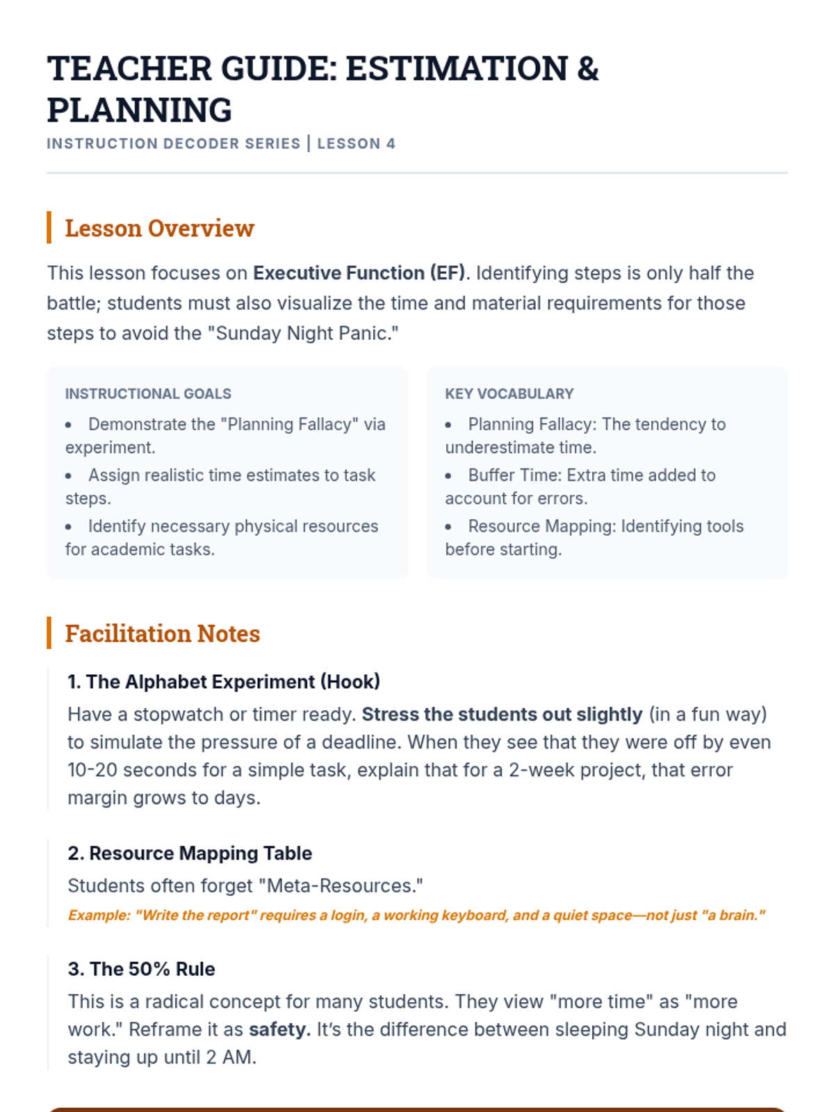 Students estimate the time and resources needed for identified steps, adding executive function layers to sequencing to prevent the planning fallacy.