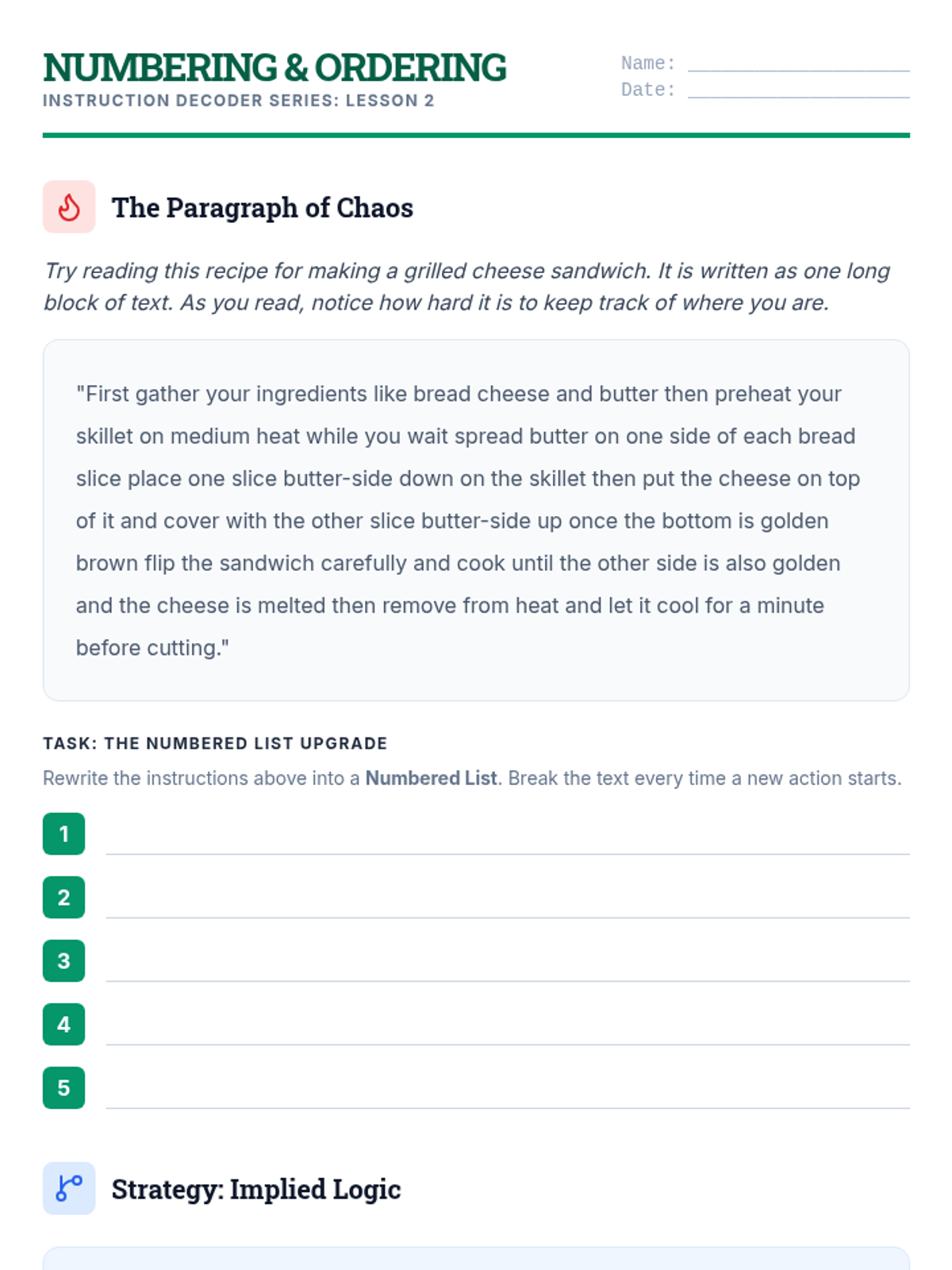 Students practice converting unformatted blocks of text instructions into numbered lists, identifying implied sequences where the order matters but isn't explicitly stated.
