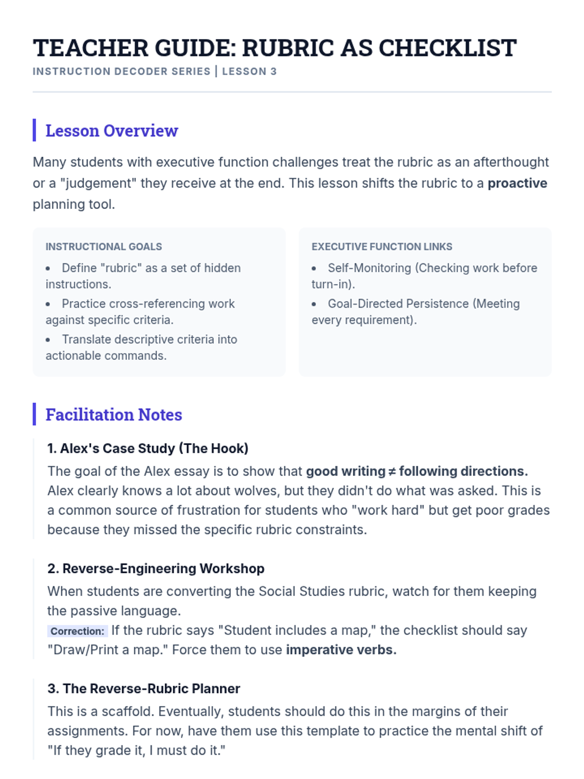 A lesson focused on teaching and tracking specific academic habits such as workspace organization, planner usage, and text annotation to increase student independence in the general education setting.