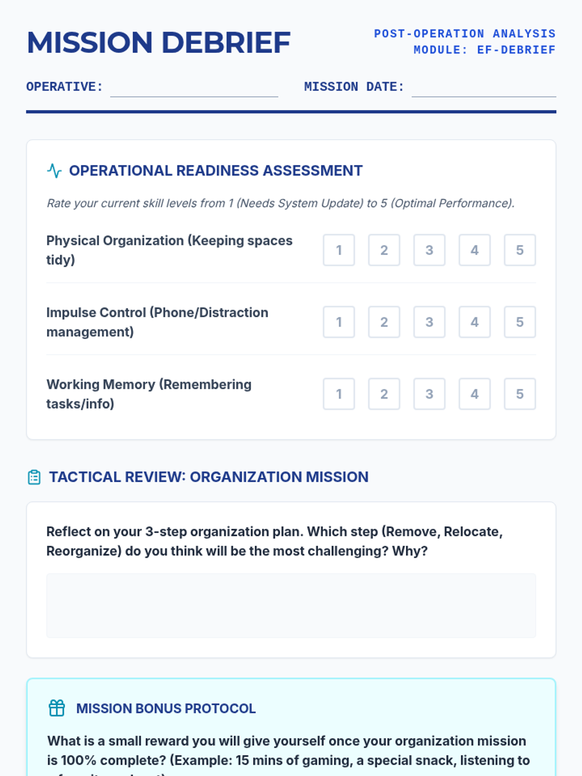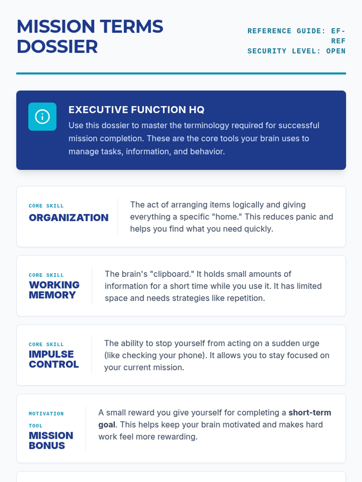 A comprehensive set of tools designed to help teenagers master executive functioning skills, focusing on task management, environmental organization, and self-monitoring using a high-tech, tactical aesthetic.