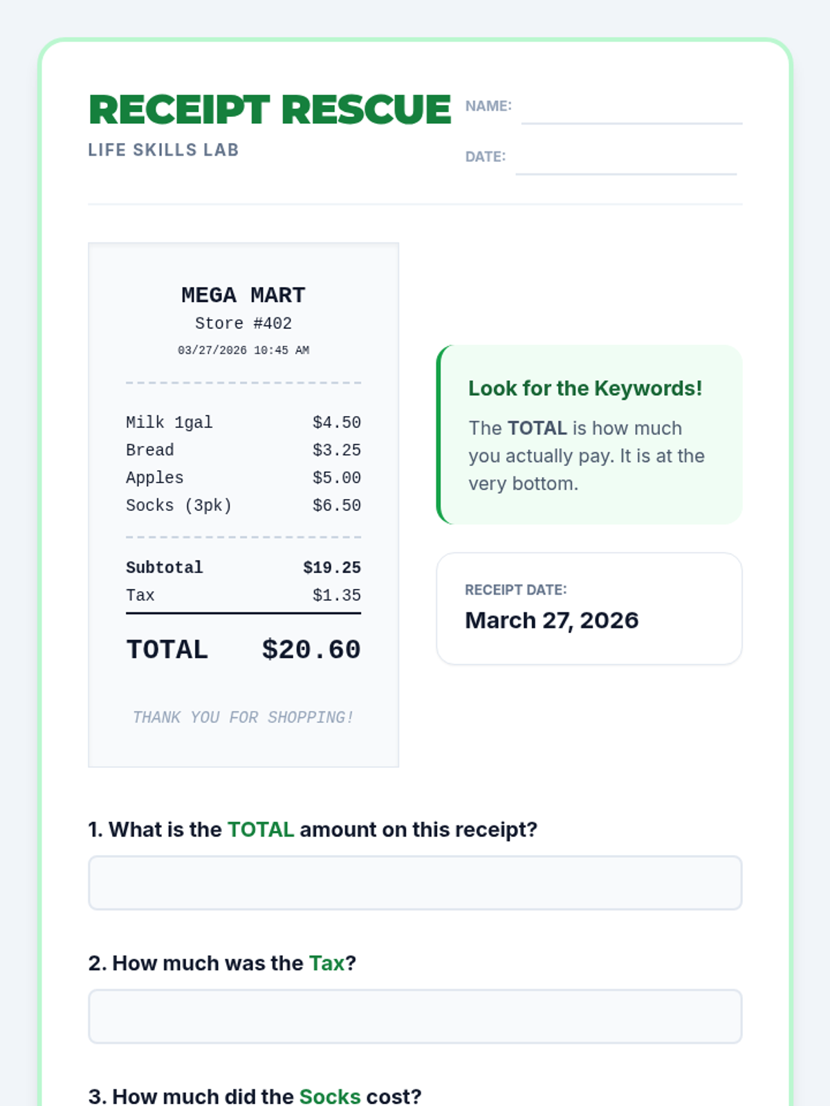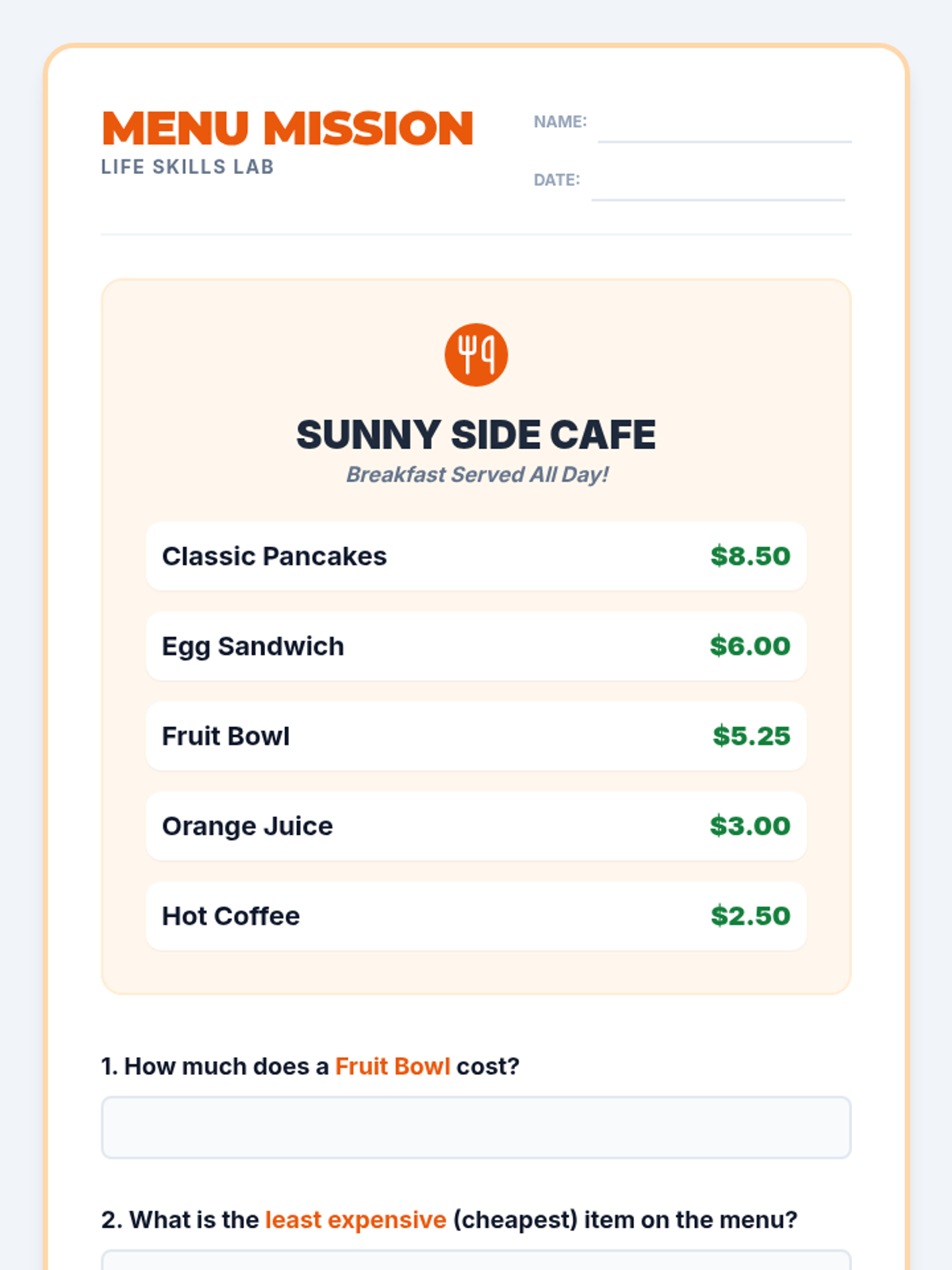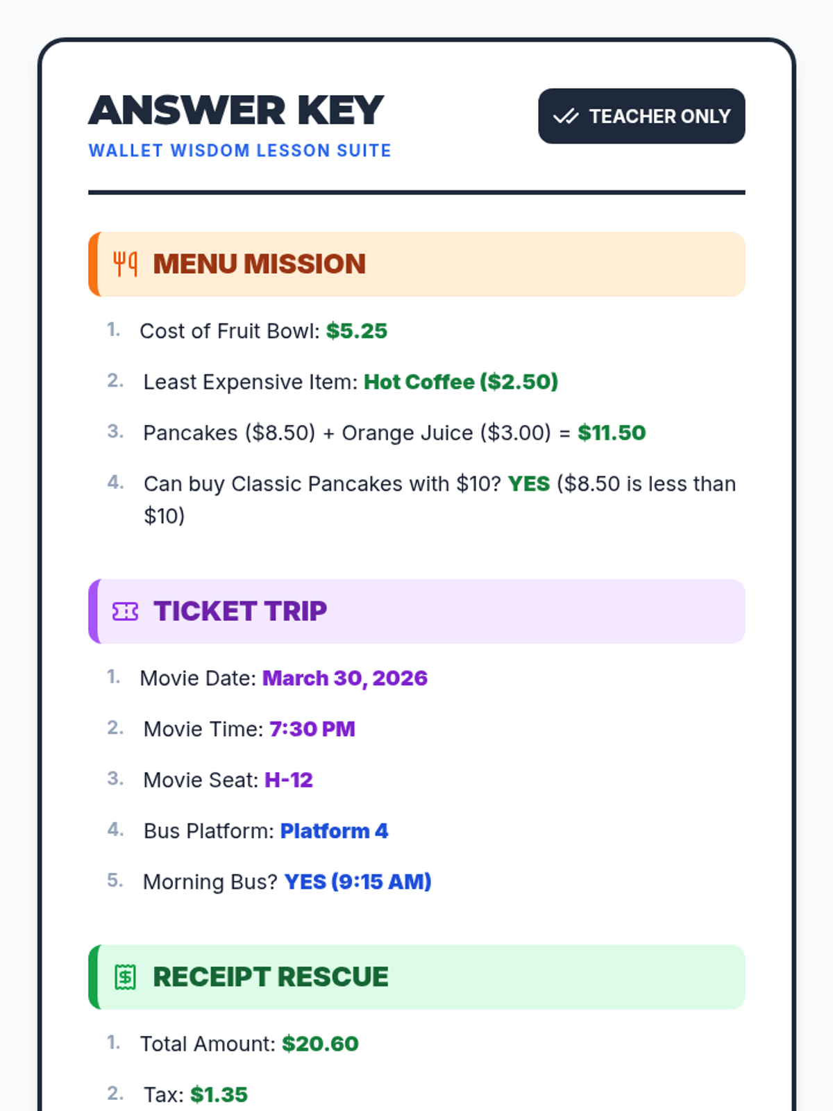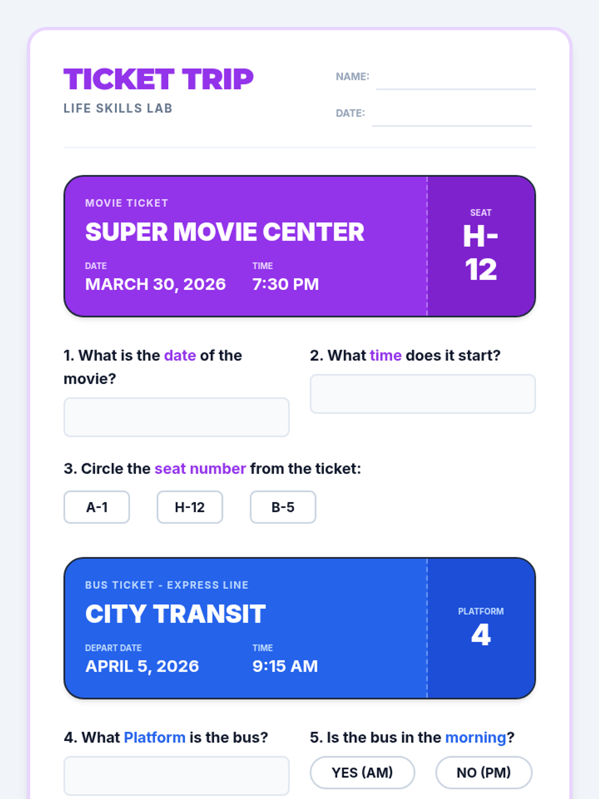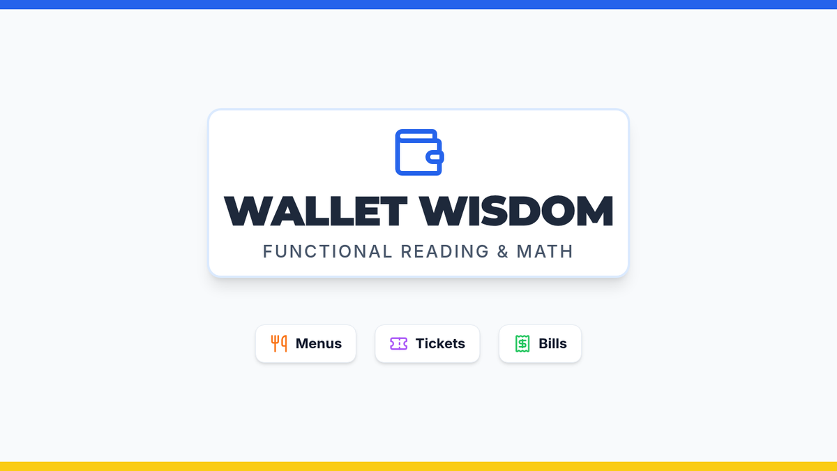 A practical lesson for high school students with special needs, focusing on functional reading and math skills needed for navigating menus, event tickets, and shopping receipts. Students will practice locating key information like dates, seat numbers, and prices to build independence in community settings.