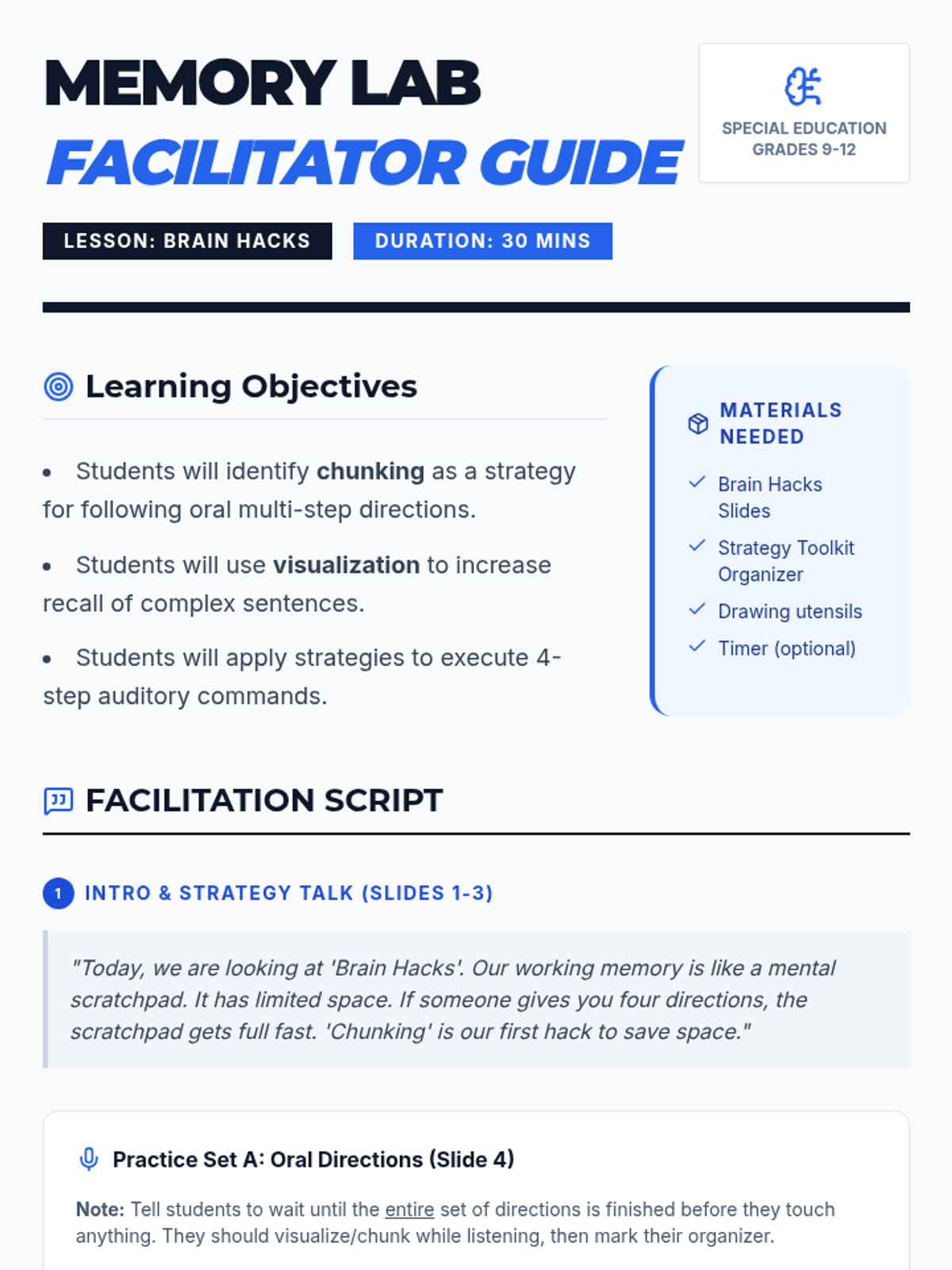 A 30-minute high school special education lesson focused on strengthening auditory and reading working memory through 'chunking' and 'visualizing' strategies. Students practice following multi-step directions and retaining information from complex sentences.