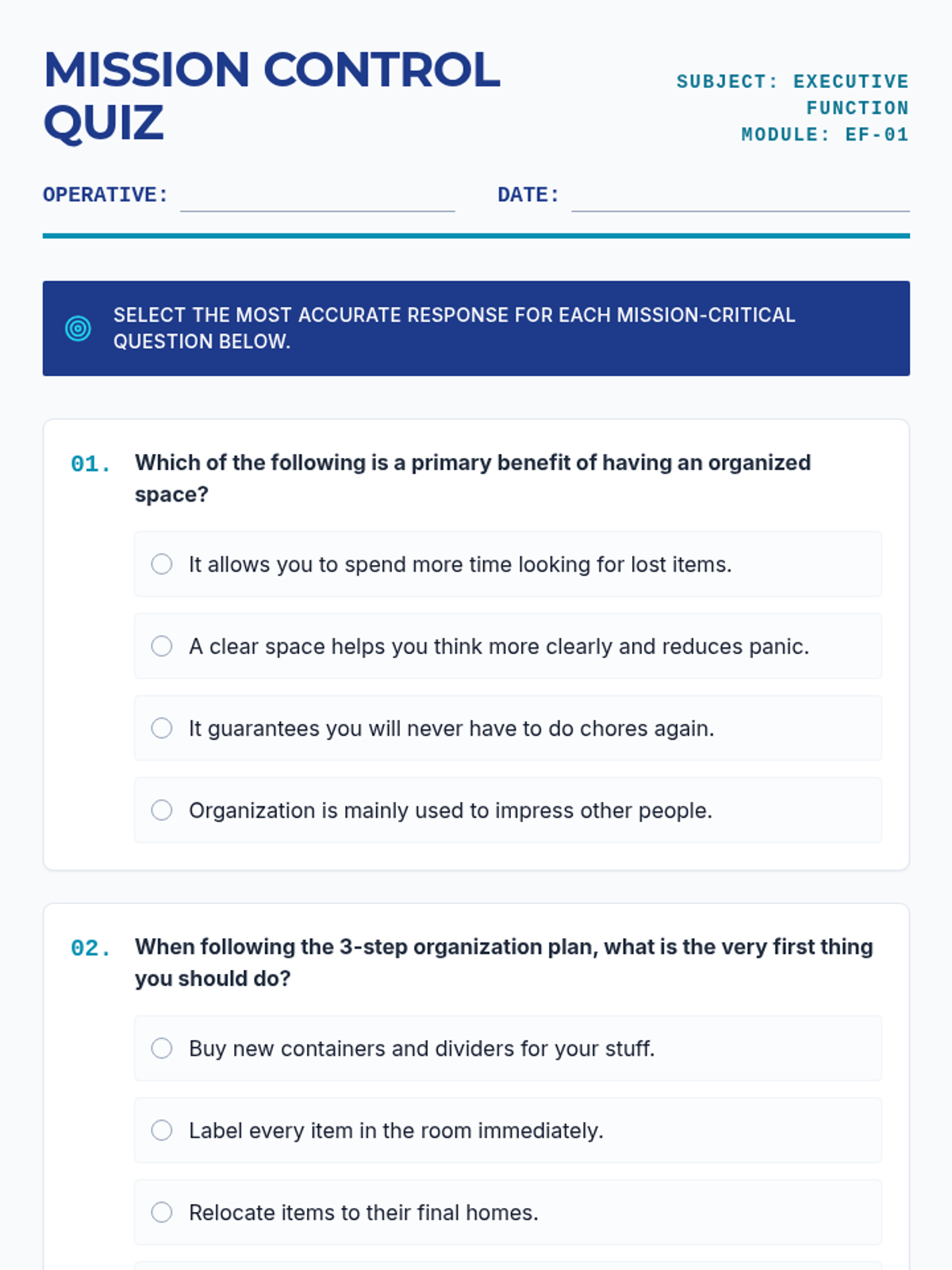 A lesson focusing on key executive function skills including organization, planning, working memory, and impulse control, featuring a 'Mission Control' theme.