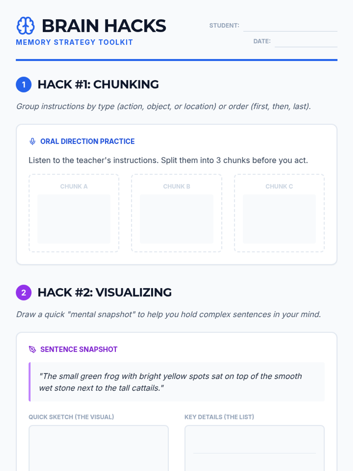 Mnemonic strategies, information chunking, and visual supports for processing and retaining classroom information. Strengthens focus on complex tasks and multi-step directions through organized note-taking and graphic organizers.