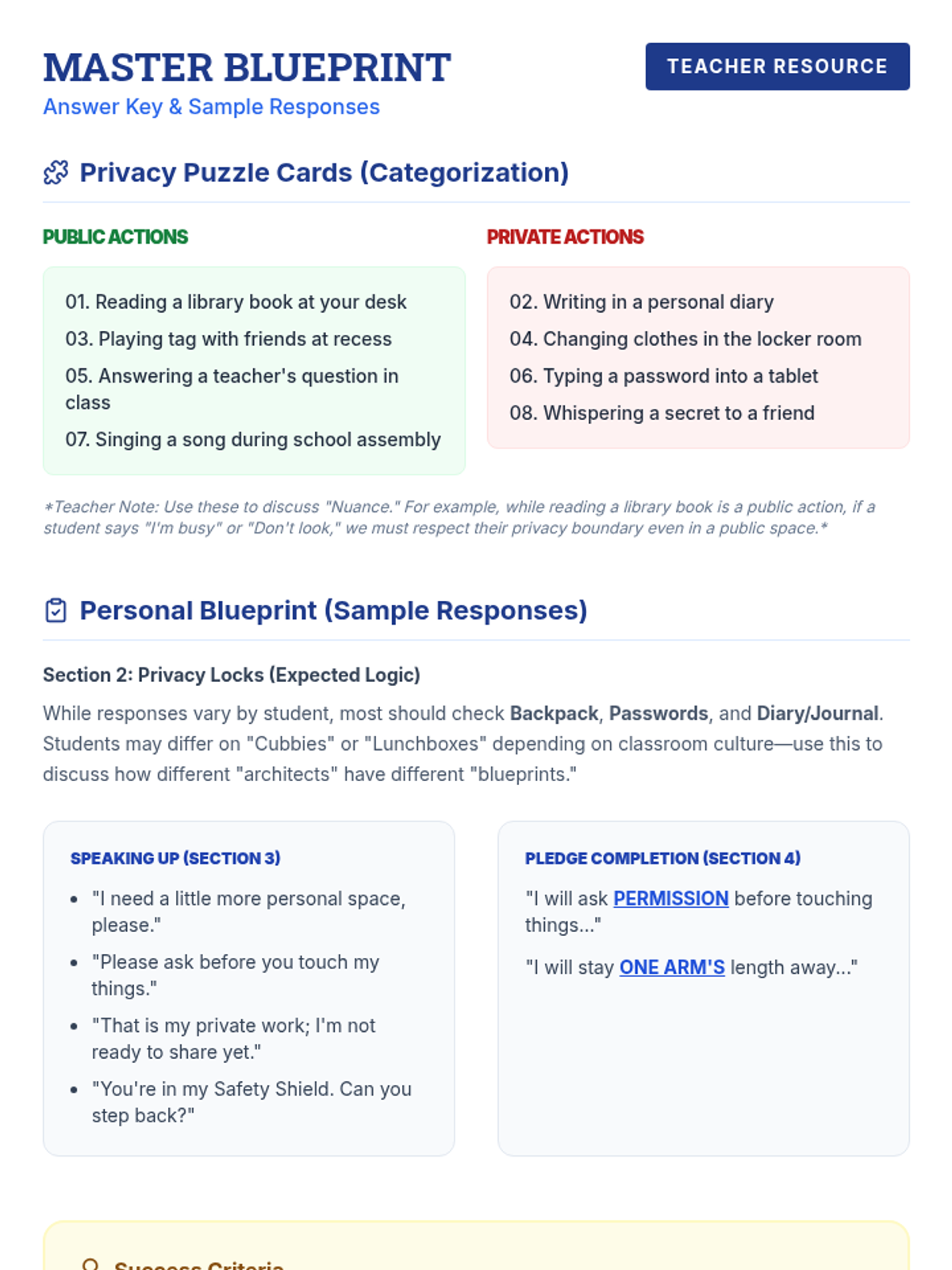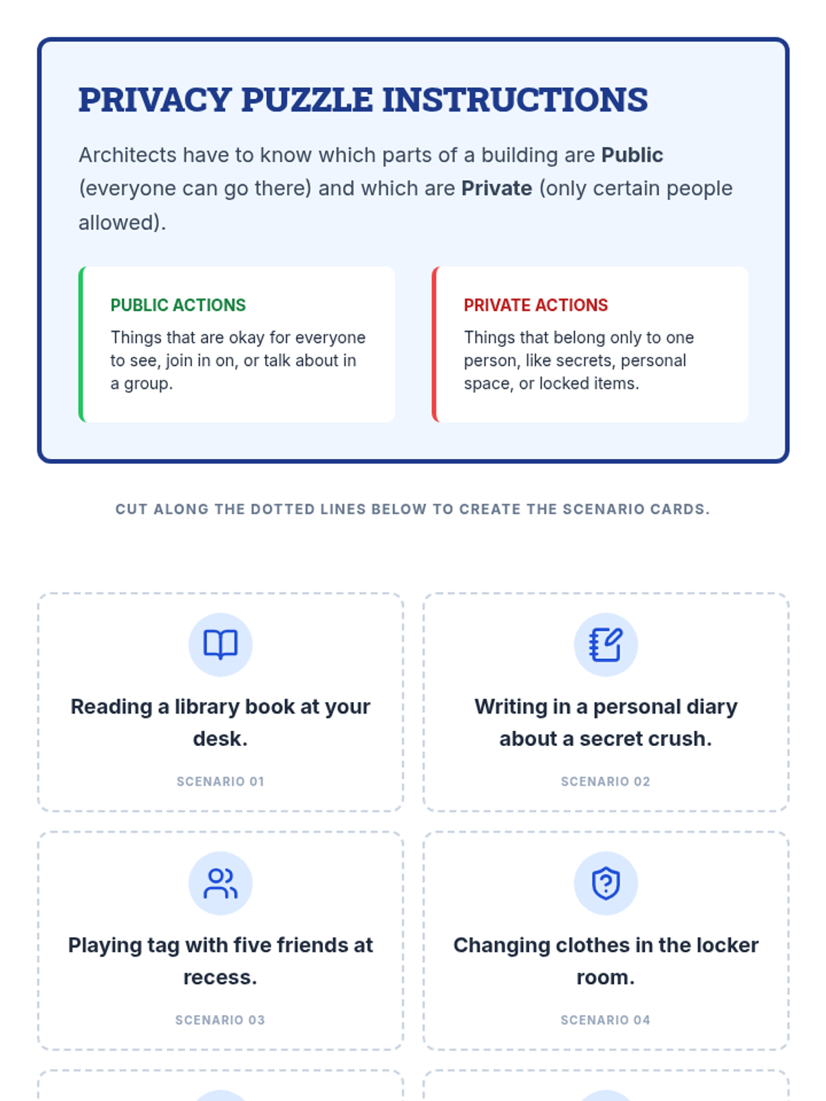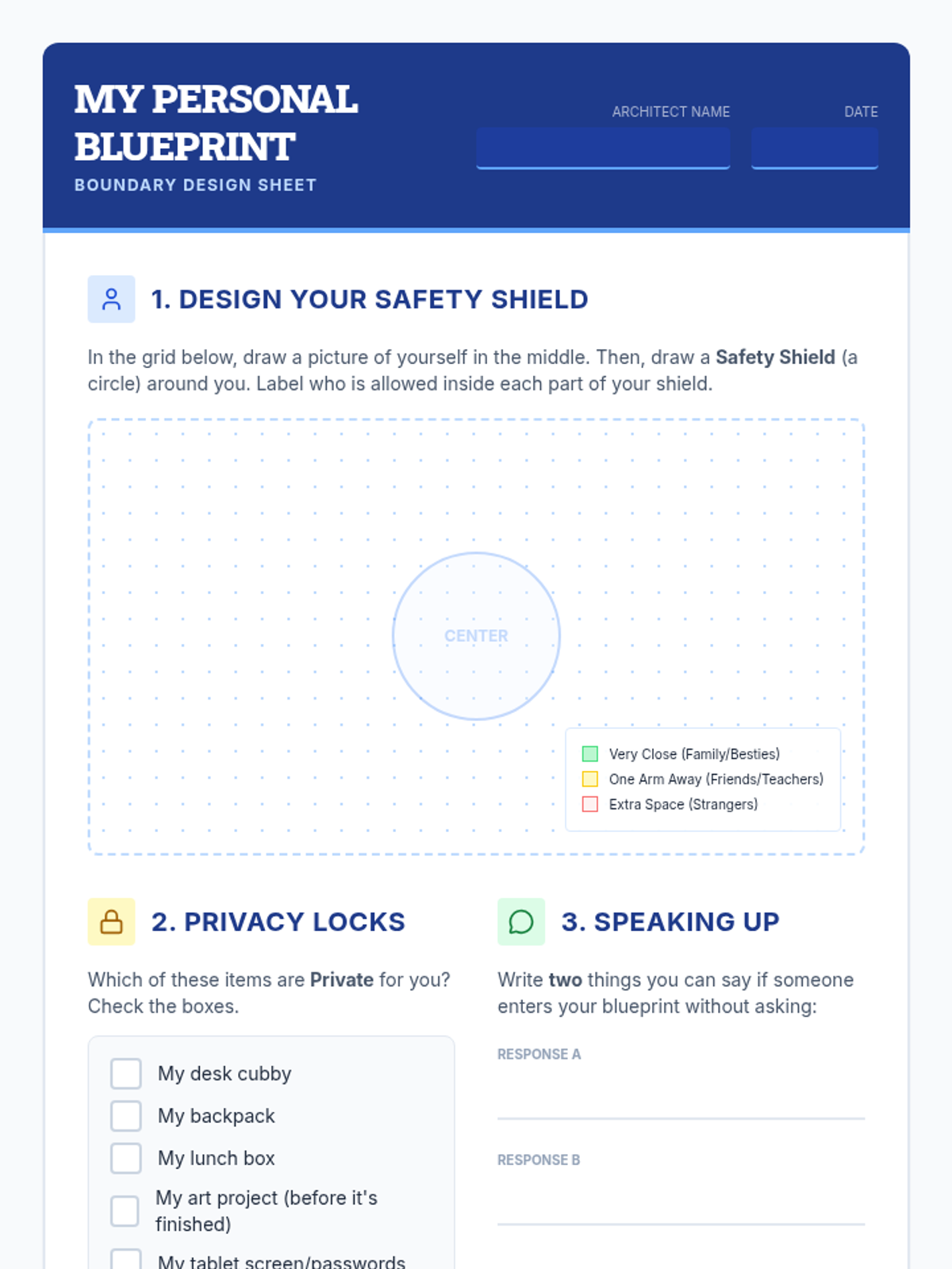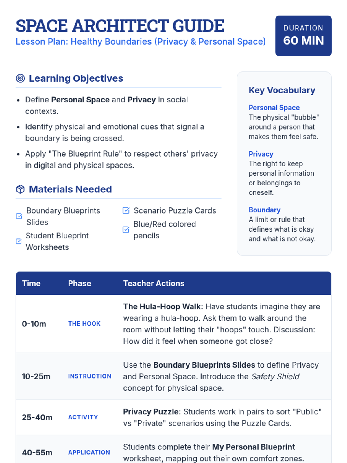 A comprehensive 60-minute SEL lesson focused on understanding and respecting privacy and personal space through the metaphor of architectural blueprints. Students will learn to identify their own boundaries and practice respecting the 'invisible walls' of others.