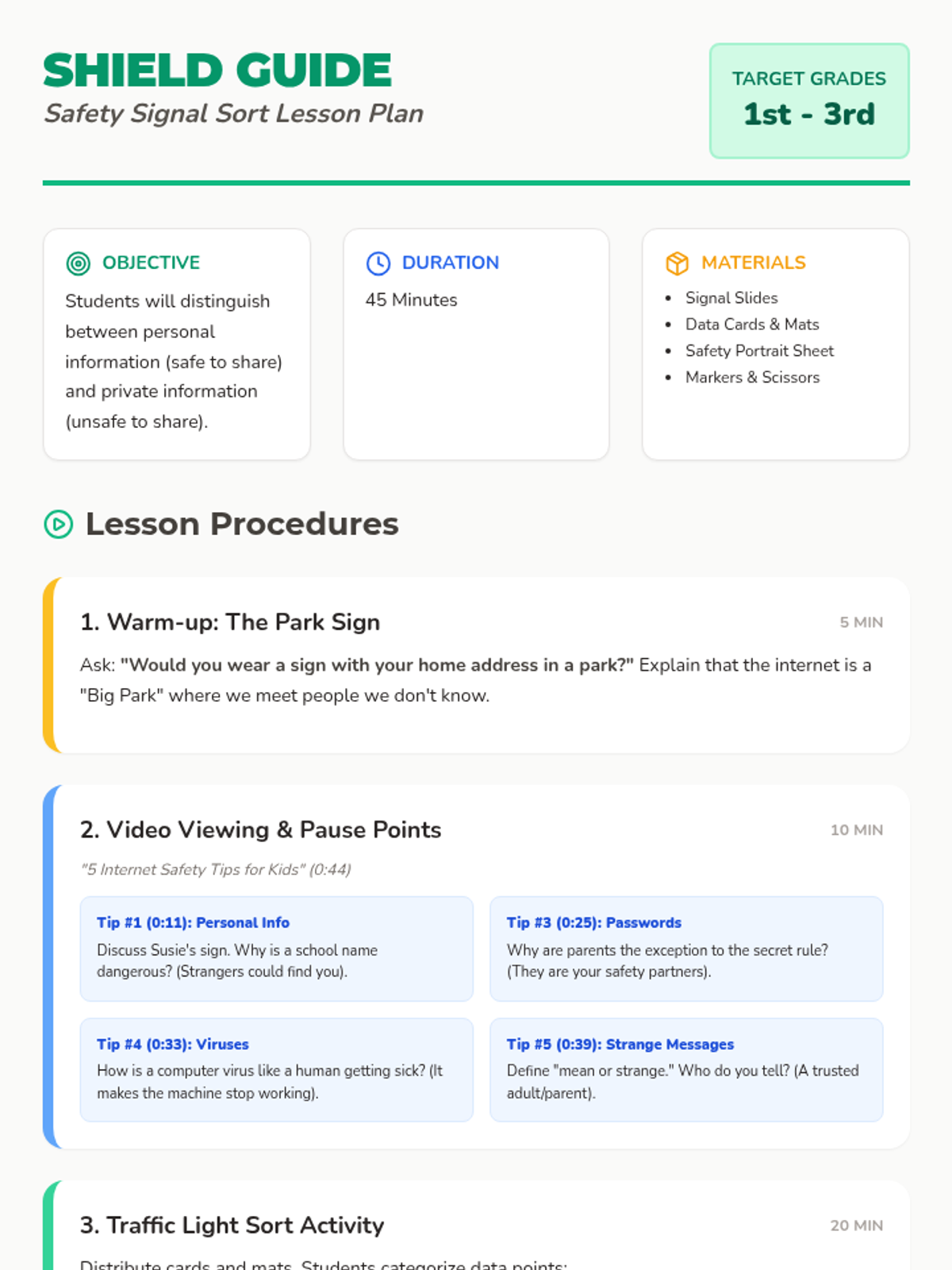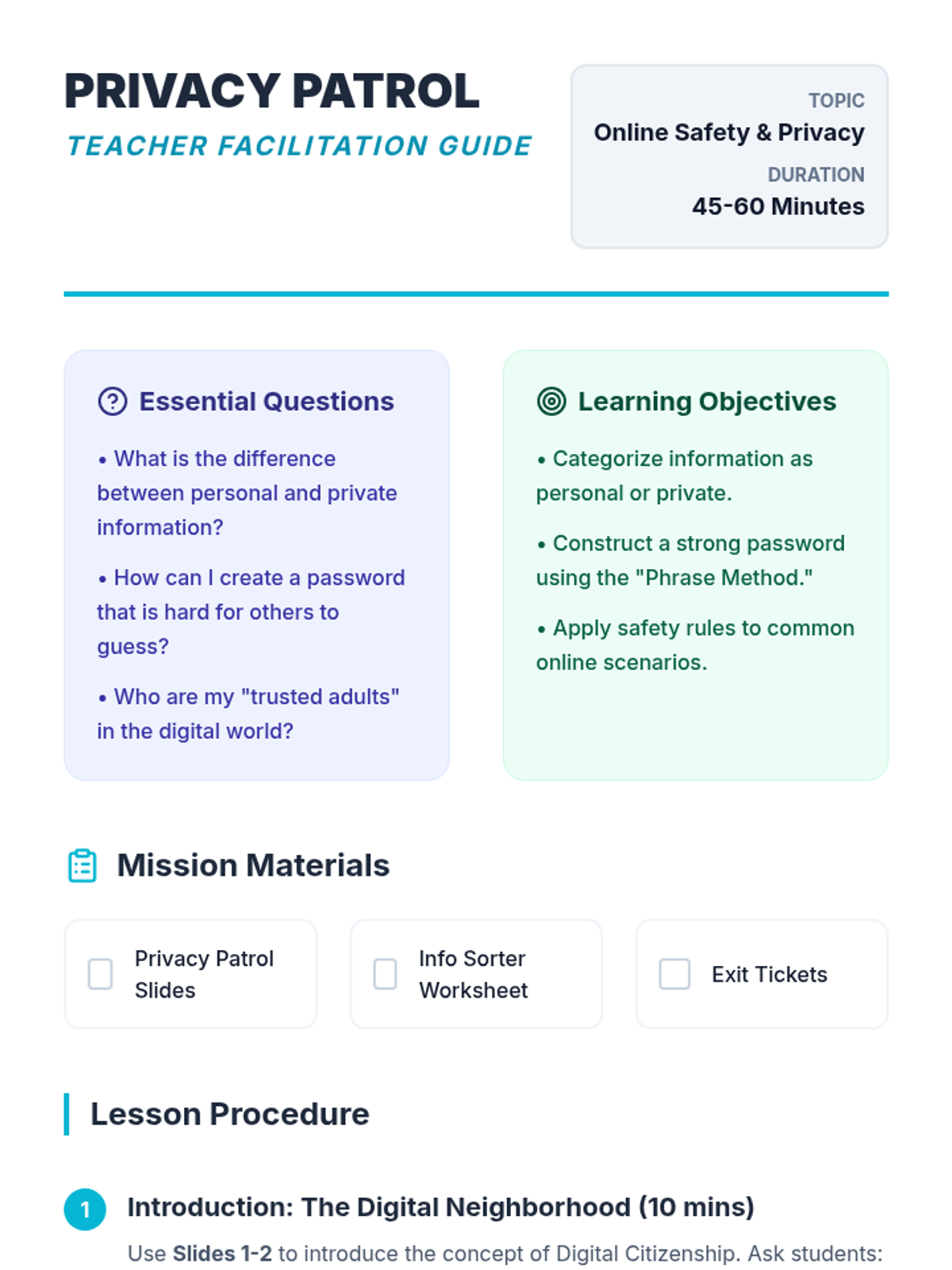 A 30-minute introductory lesson for K-2 students on internet safety. It covers distinguishing private from public information, practicing the 'Pause & Think' method, and promoting digital kindness through interactive slides and a sorting activity.