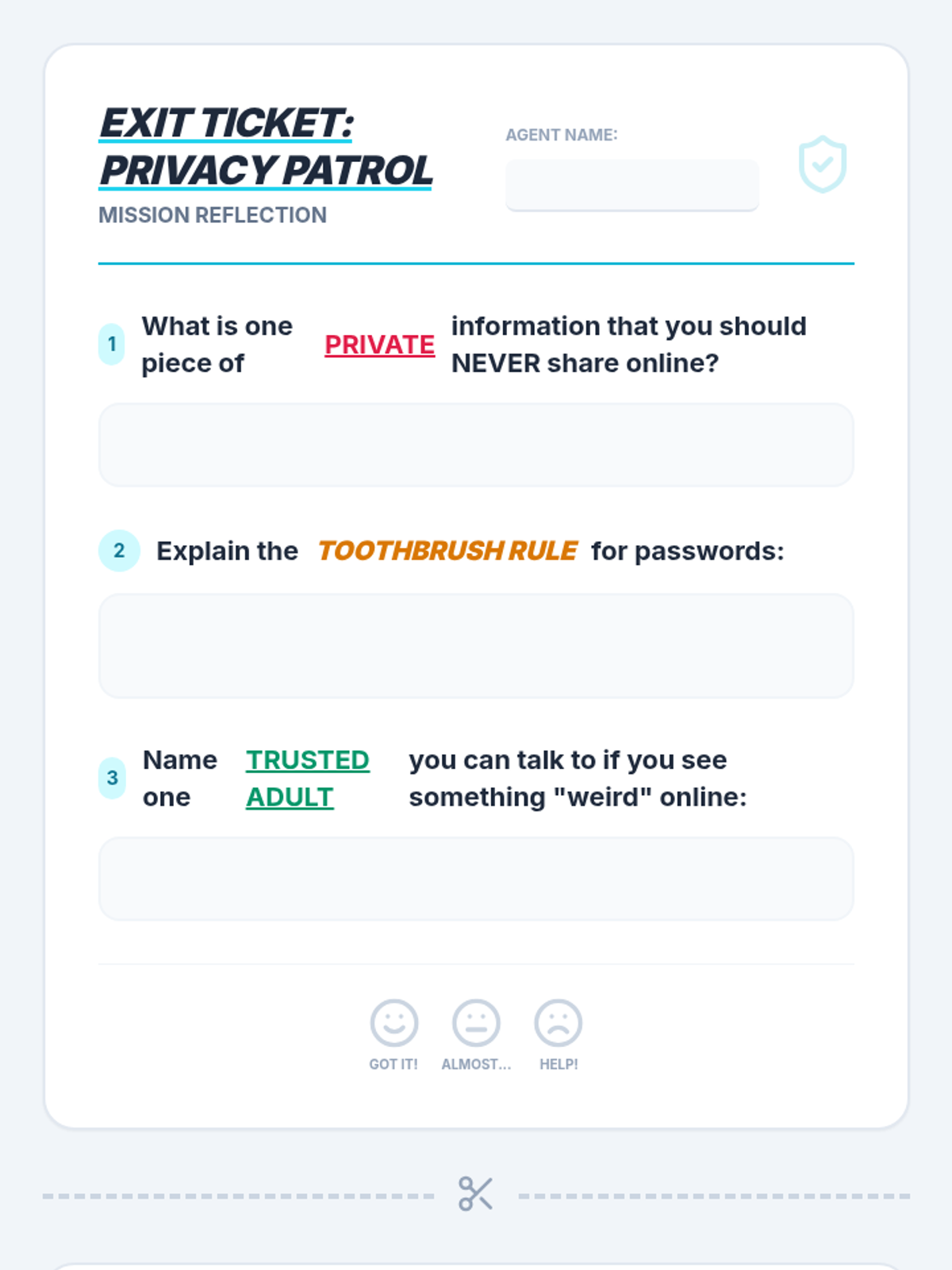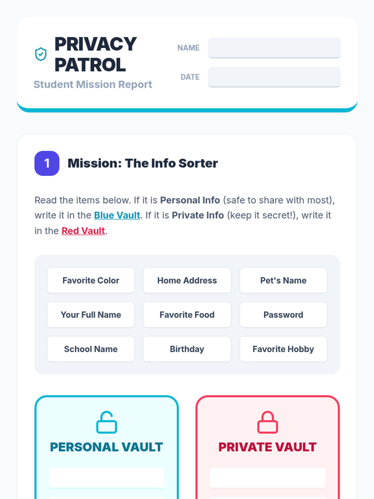 Introduces the concept of private vs. public information, teaching students what is safe to share online and what must stay secret.
