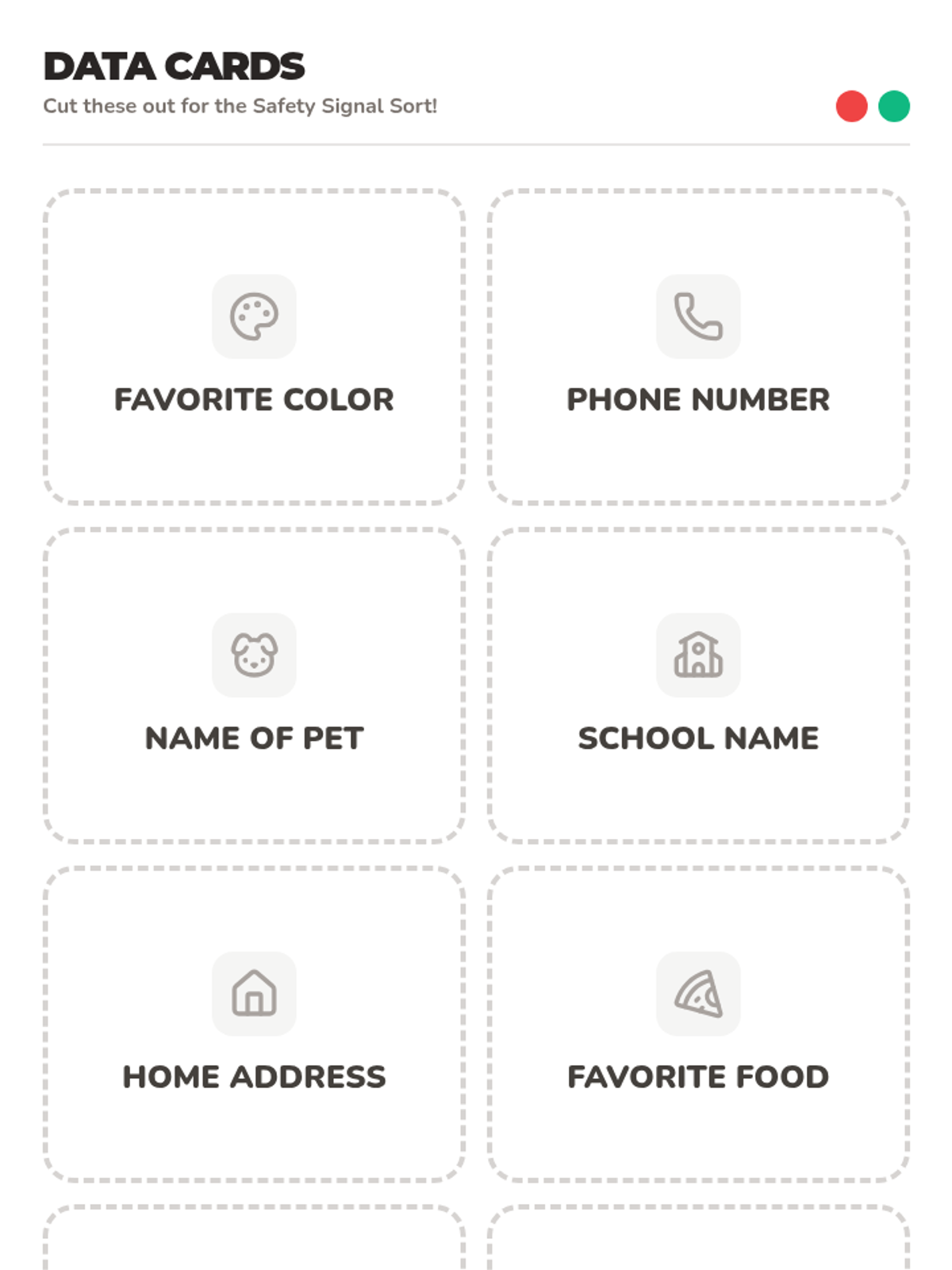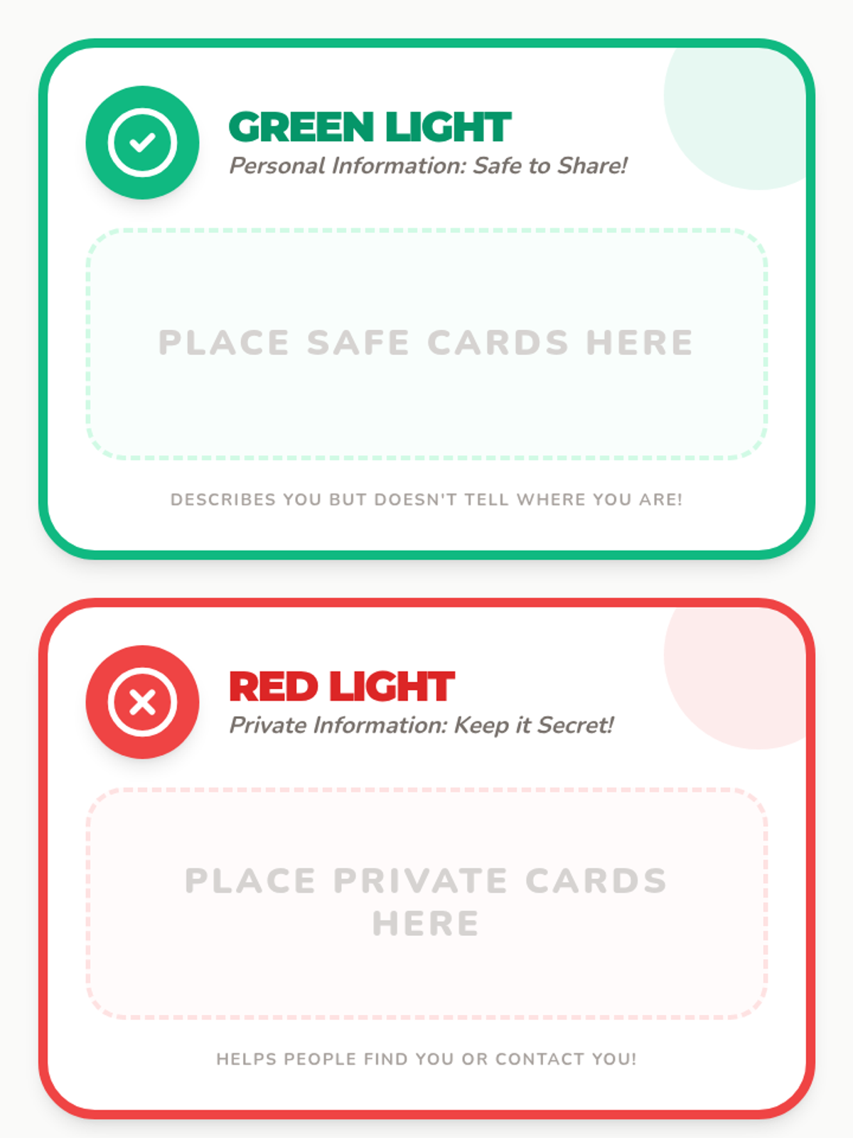 Students learn to distinguish between personal information that is safe to share and private information that should be kept secret to stay safe online through a traffic light sorting activity and video discussion.