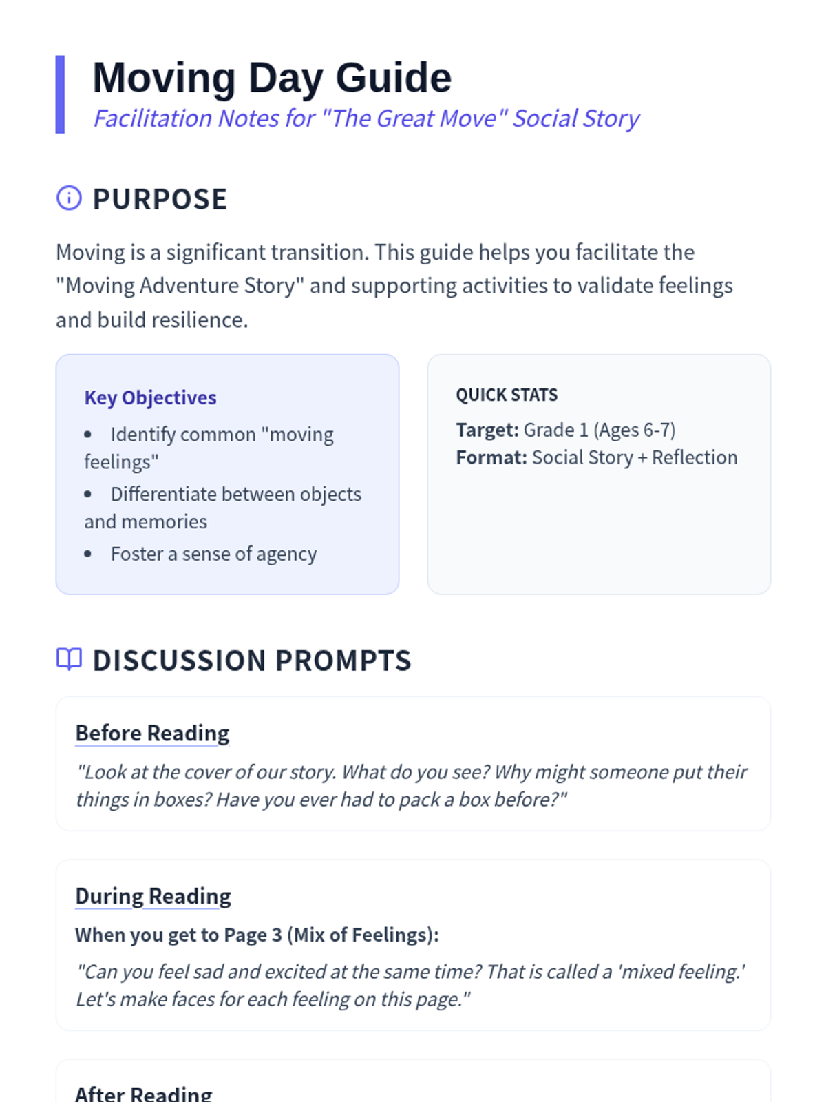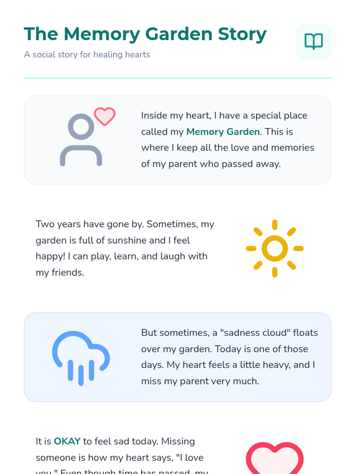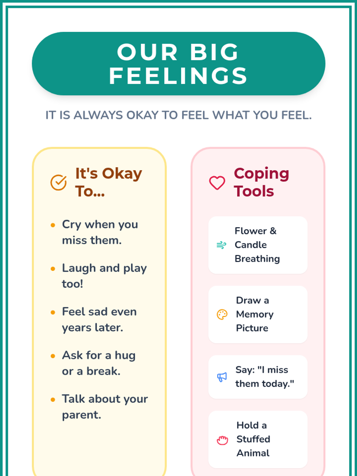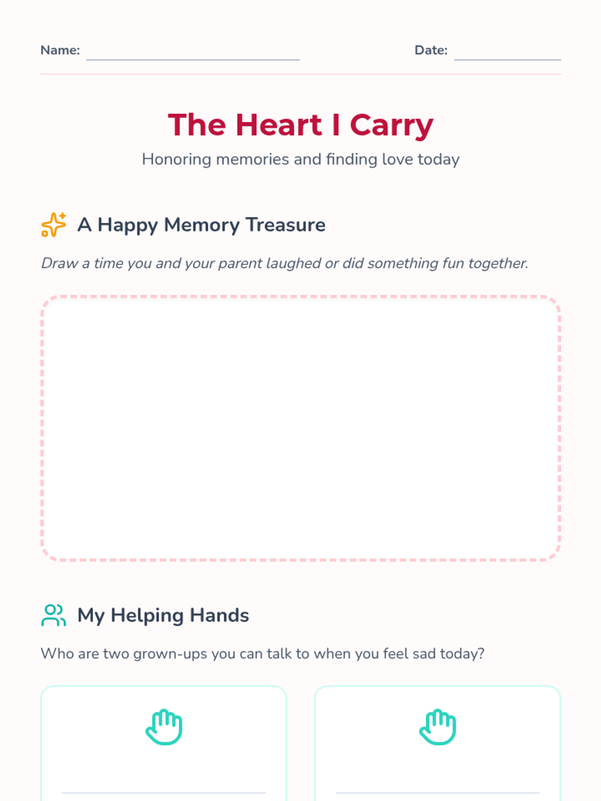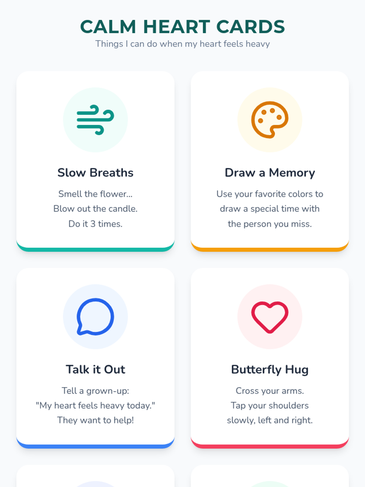 Identification of anxiety and depression symptoms alongside practical management strategies like progressive muscle relaxation and behavioral activation. Addresses the stages of grief through creative expression and routine-building to support emotional resilience.