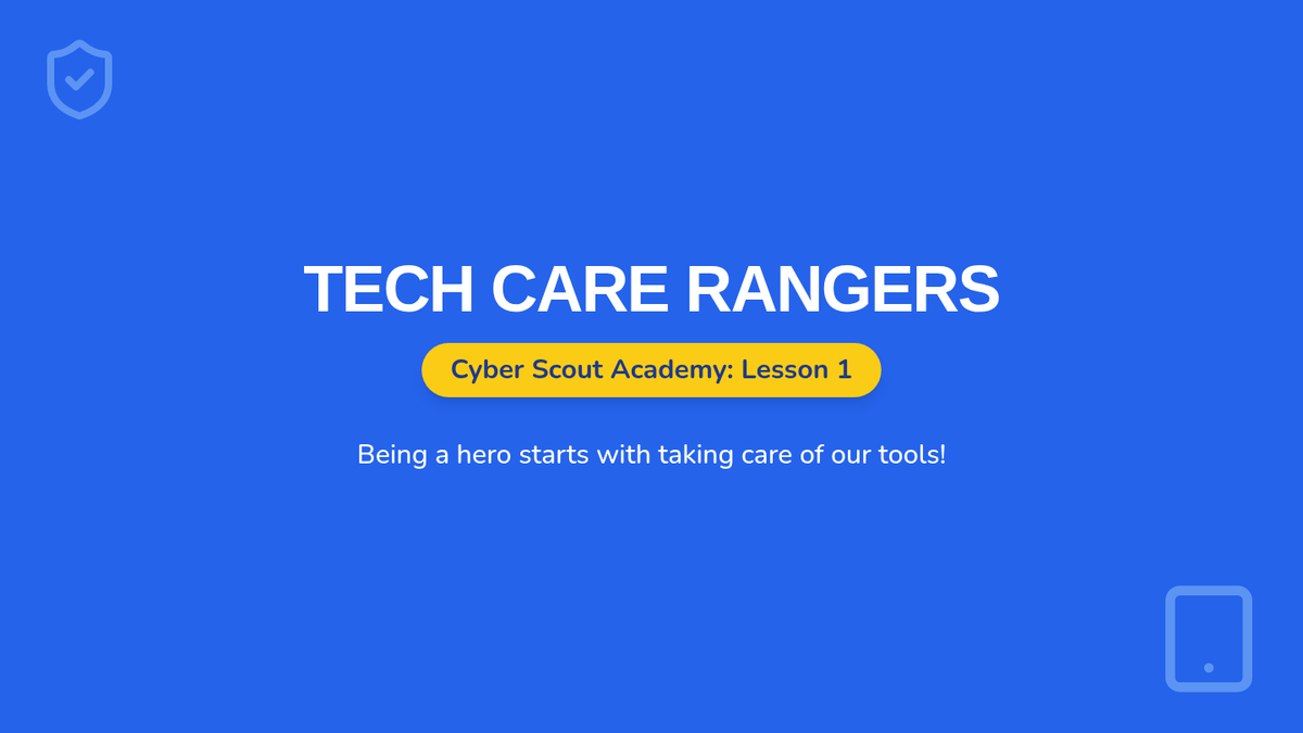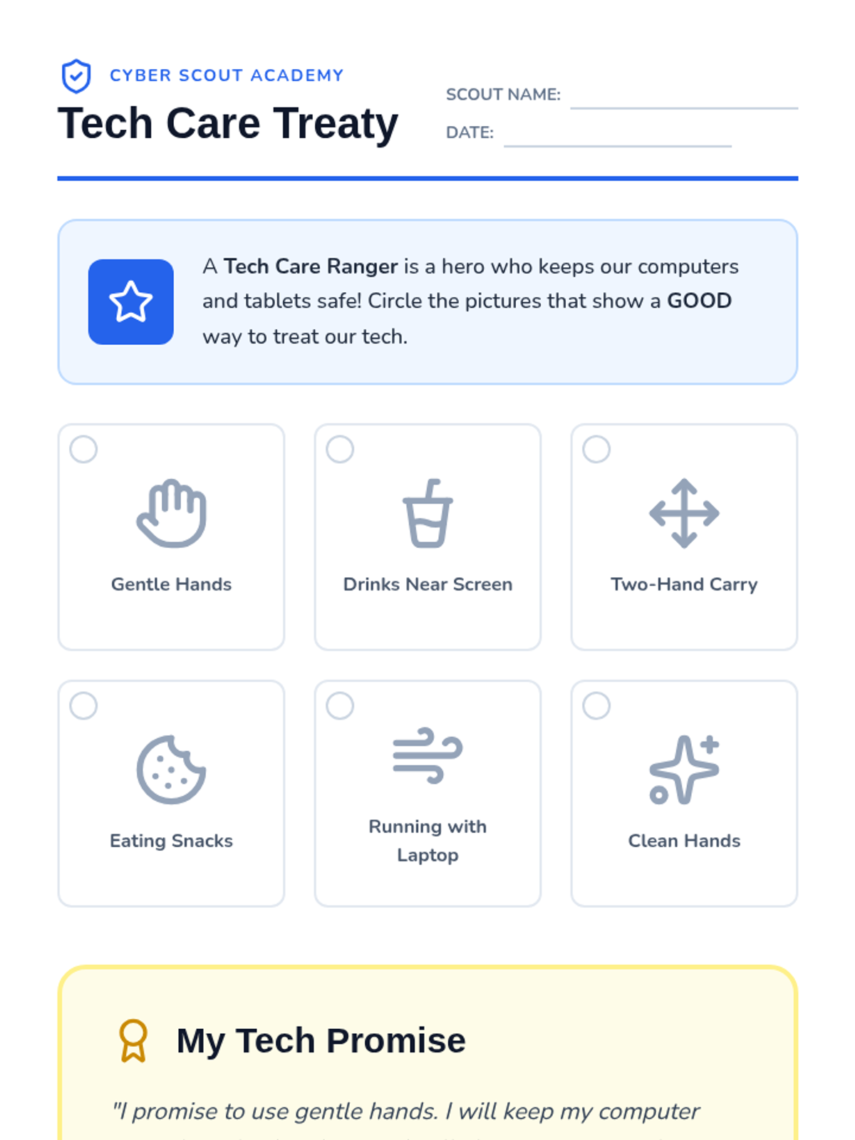 Students learn the physical responsibilities of using technology, including proper handling, environment rules (no food/drink), and creating a collective 'Tech Treaty'.