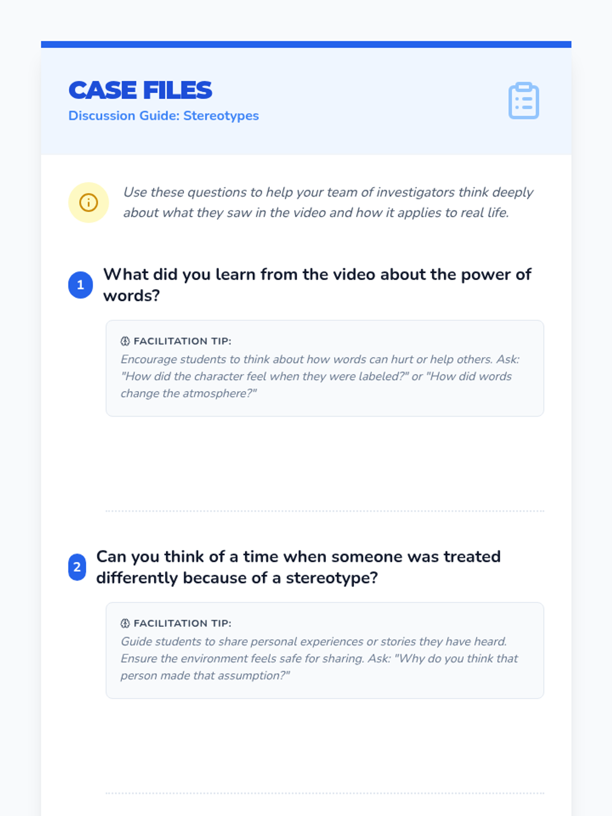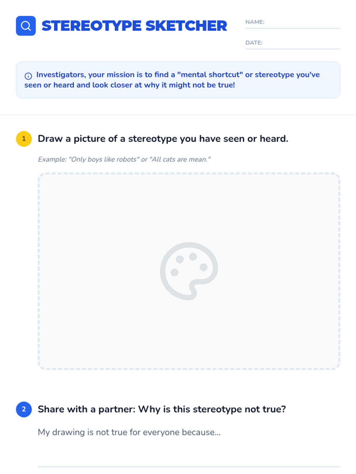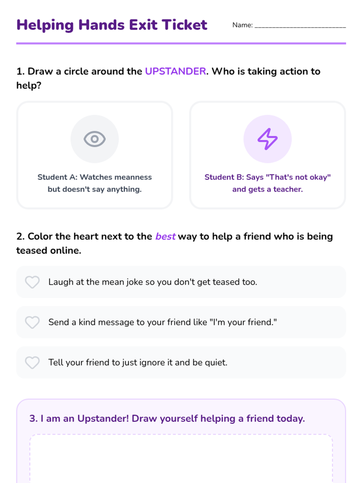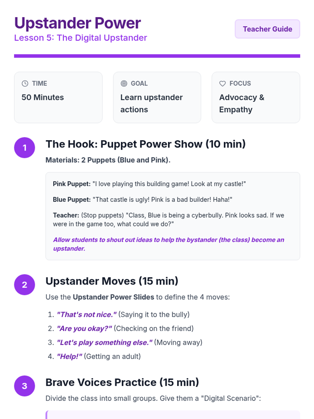 Students learn and practice specific upstander phrases to respond to unfair comments and stereotypes in a safe, structured environment.