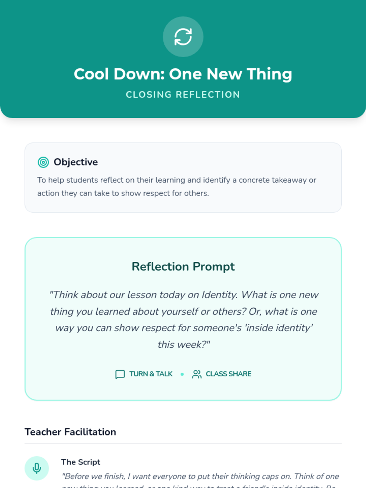 This lesson addresses the autonomy needs and social sensitivities of adolescents by focusing on self-monitoring, discreet feedback, and student-led goal setting.