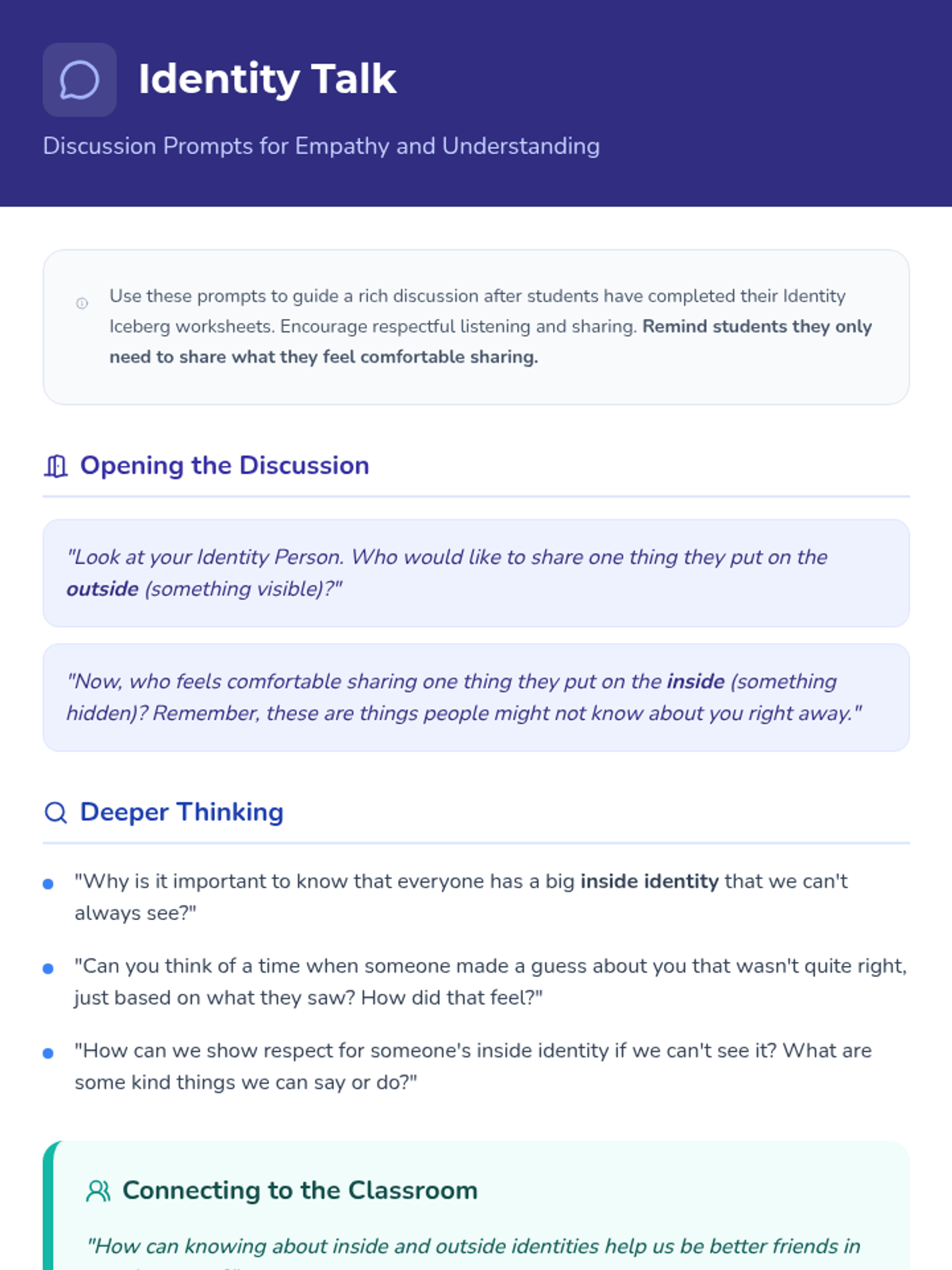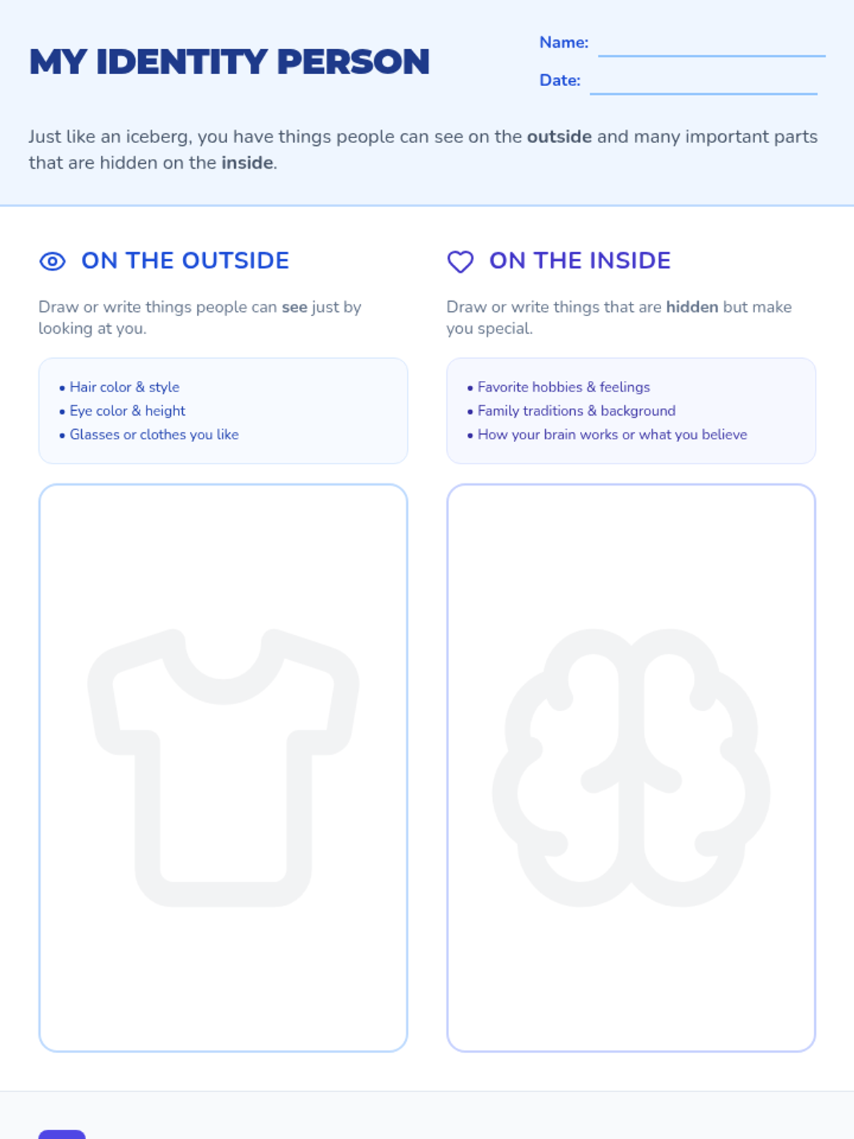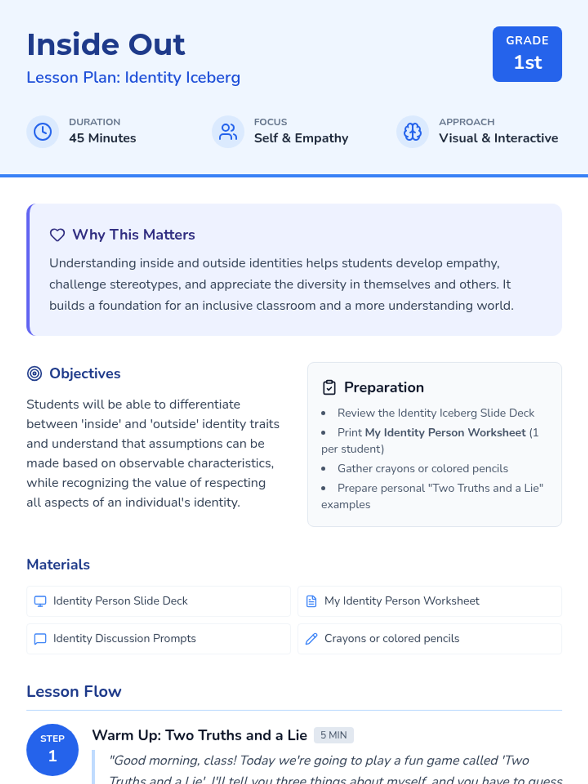 A 45-minute lesson for 1st-grade students to explore 'inside' and 'outside' identities using an iceberg metaphor. Students will learn about visible traits versus hidden qualities like neurodivergence, ethnicity, and feelings to build empathy and respect.