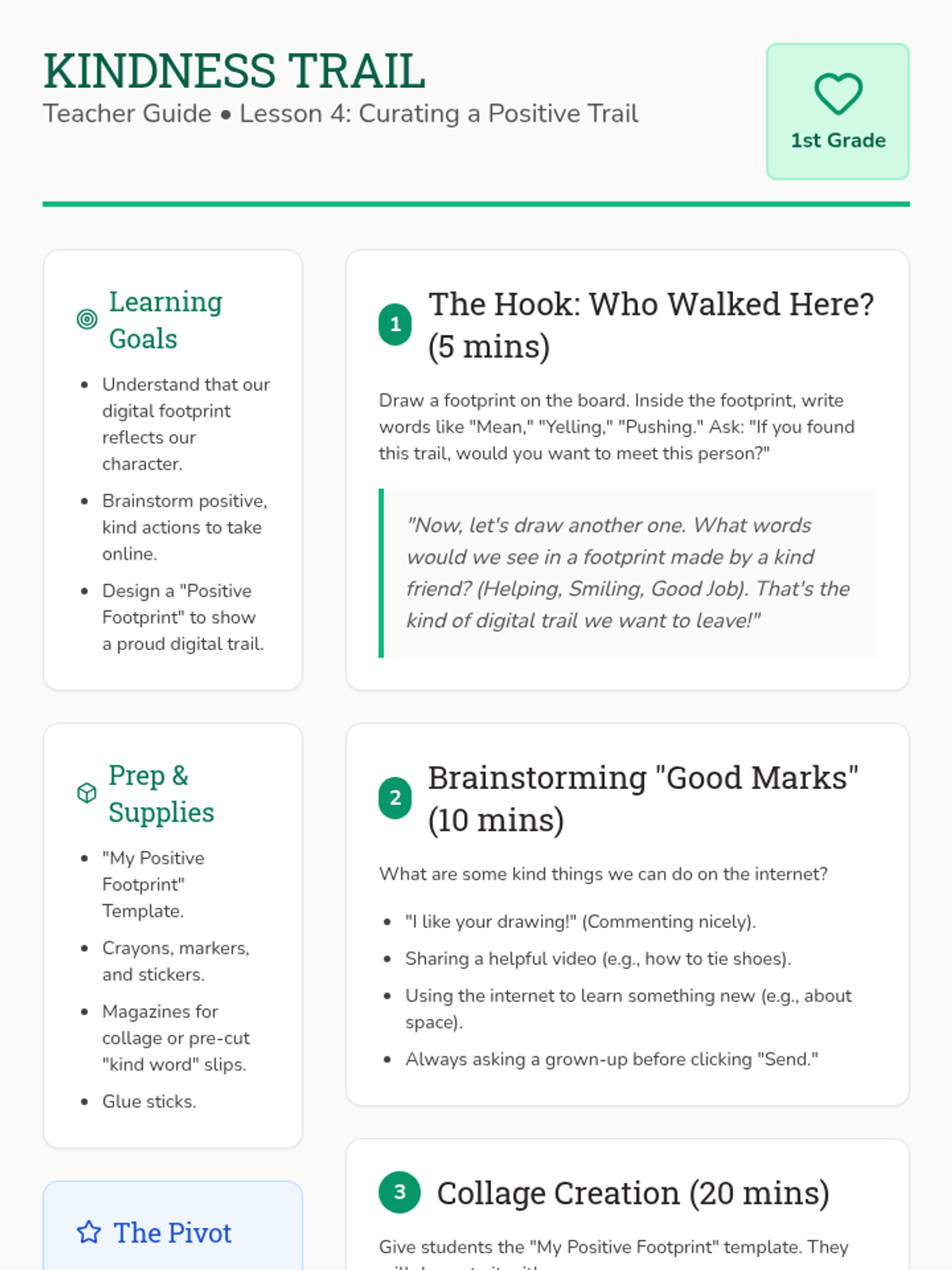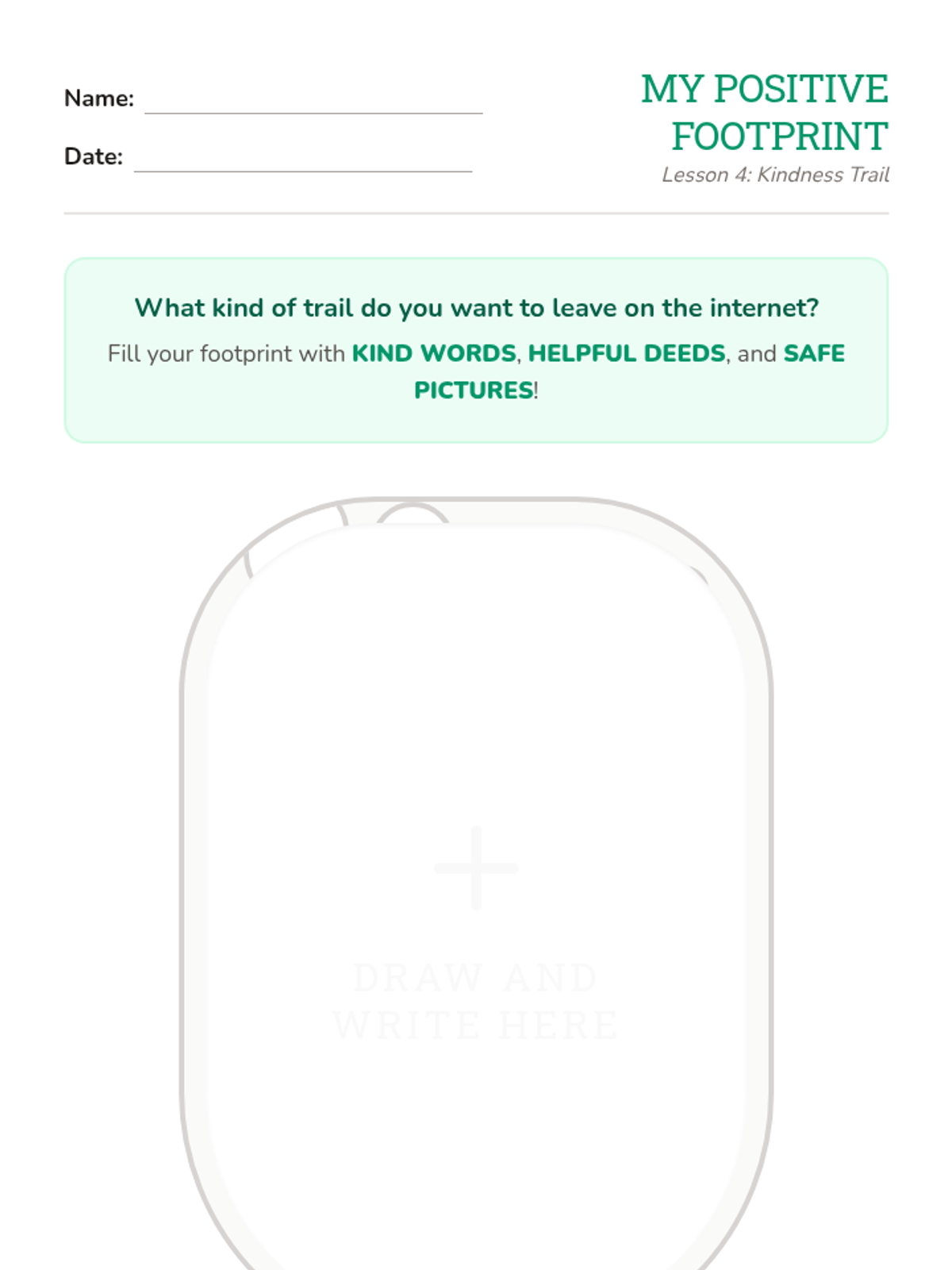 Students focus on positive digital citizenship by creating a 'good footprint' collage of kind words and helpful actions.