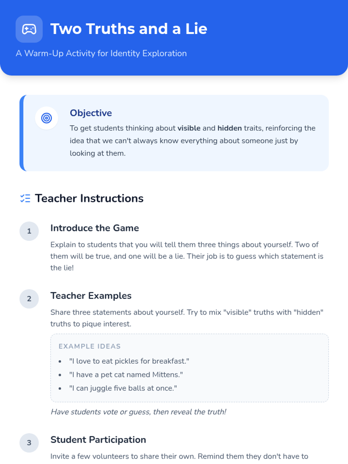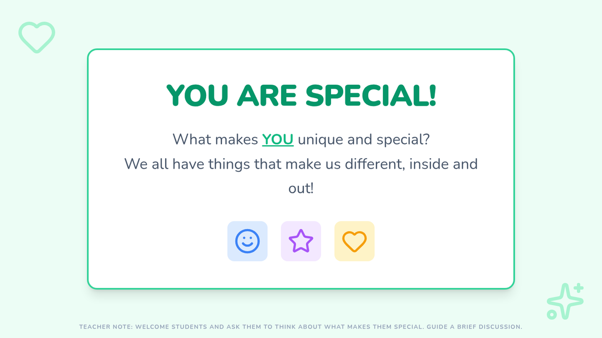 Students learn the difference between a fact (what we know for sure) and a guess (an assumption) using a Mystery Box activity. They connect this to how looking at someone's outside doesn't tell us everything about their inside.
