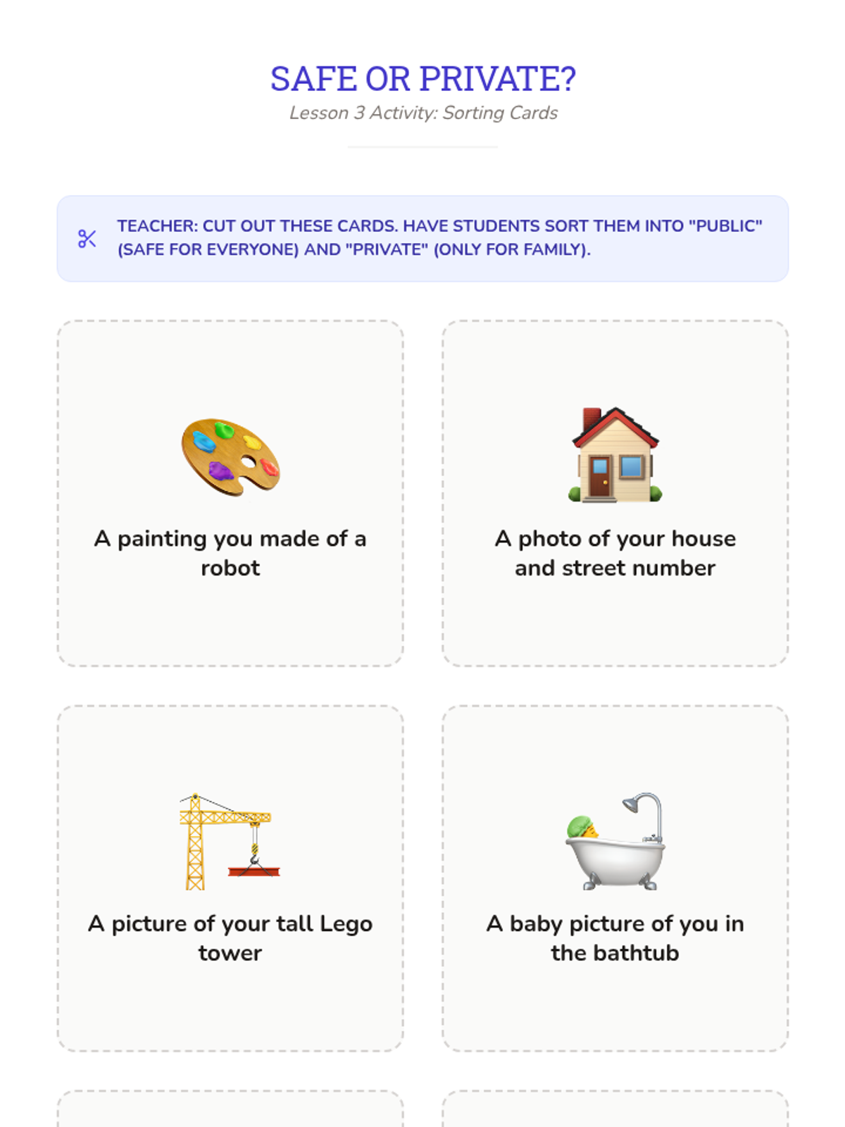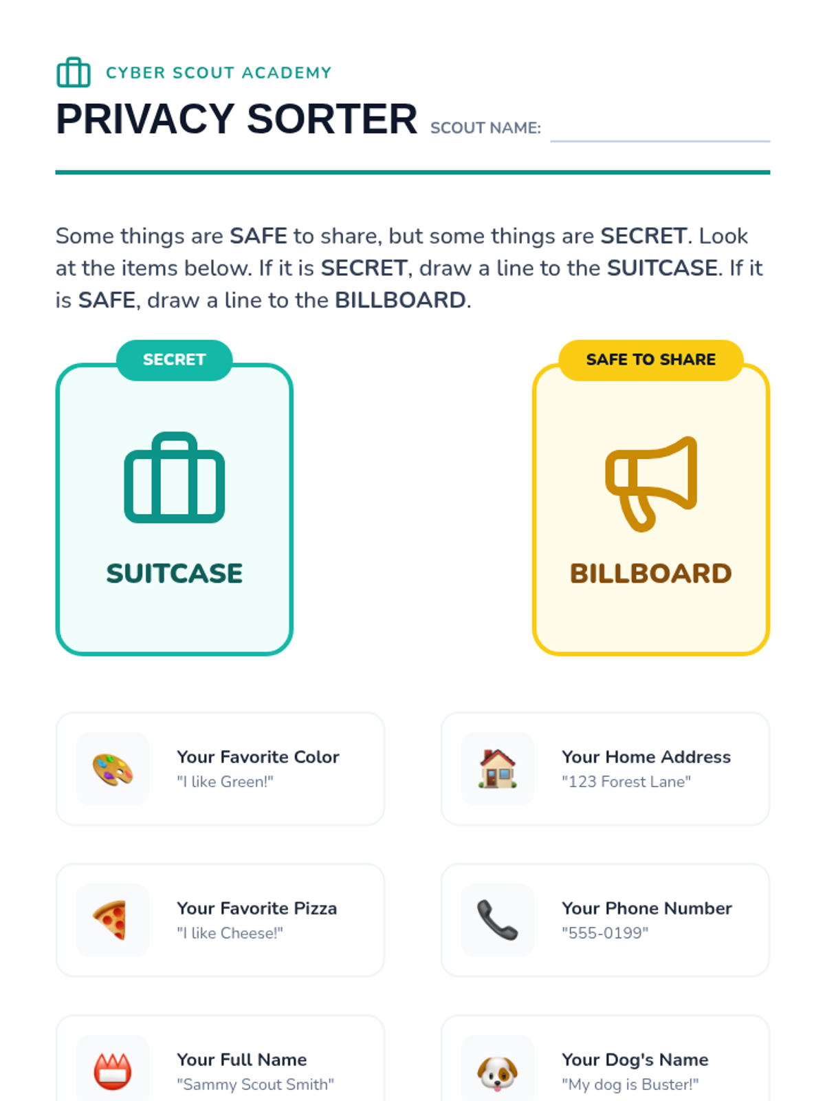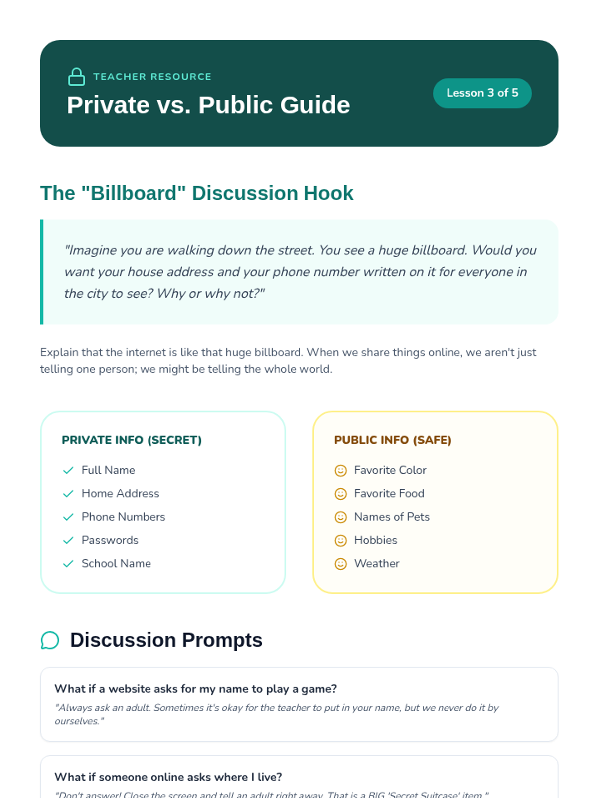 Introduces the concept of private vs. public information, teaching students what is safe to share online and what must stay secret.