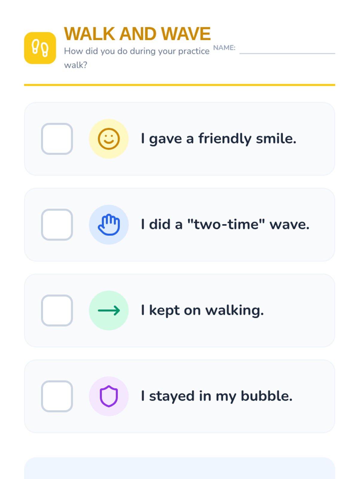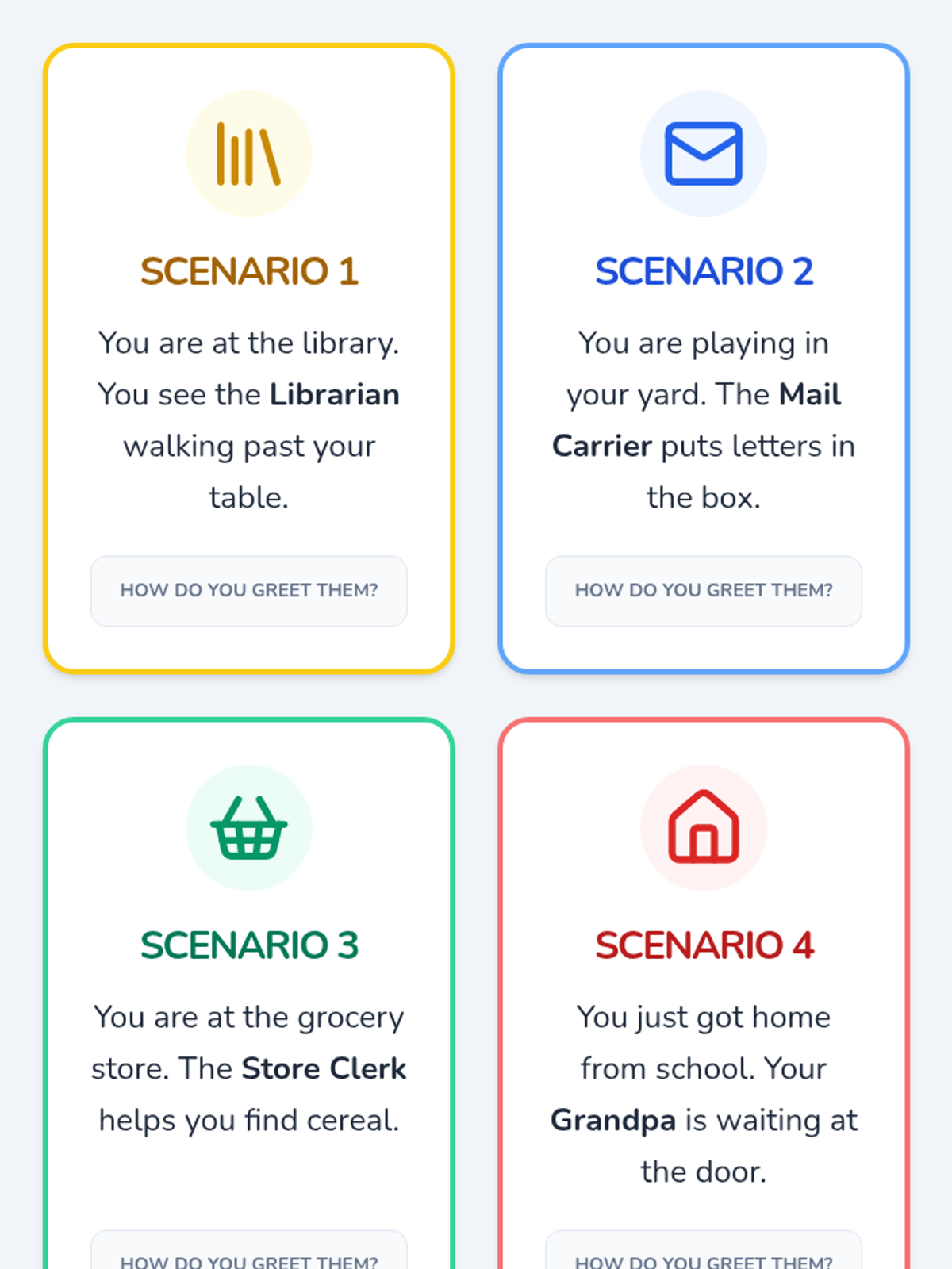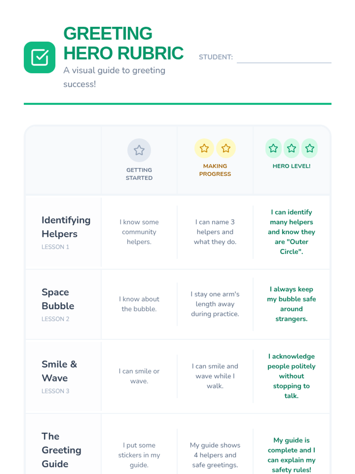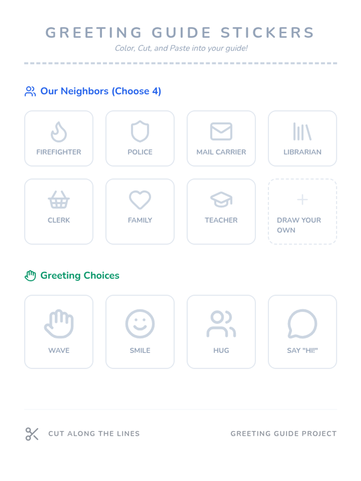 Students assemble their 'Community Greeting Guide' by matching community members with appropriate safety-first greetings.