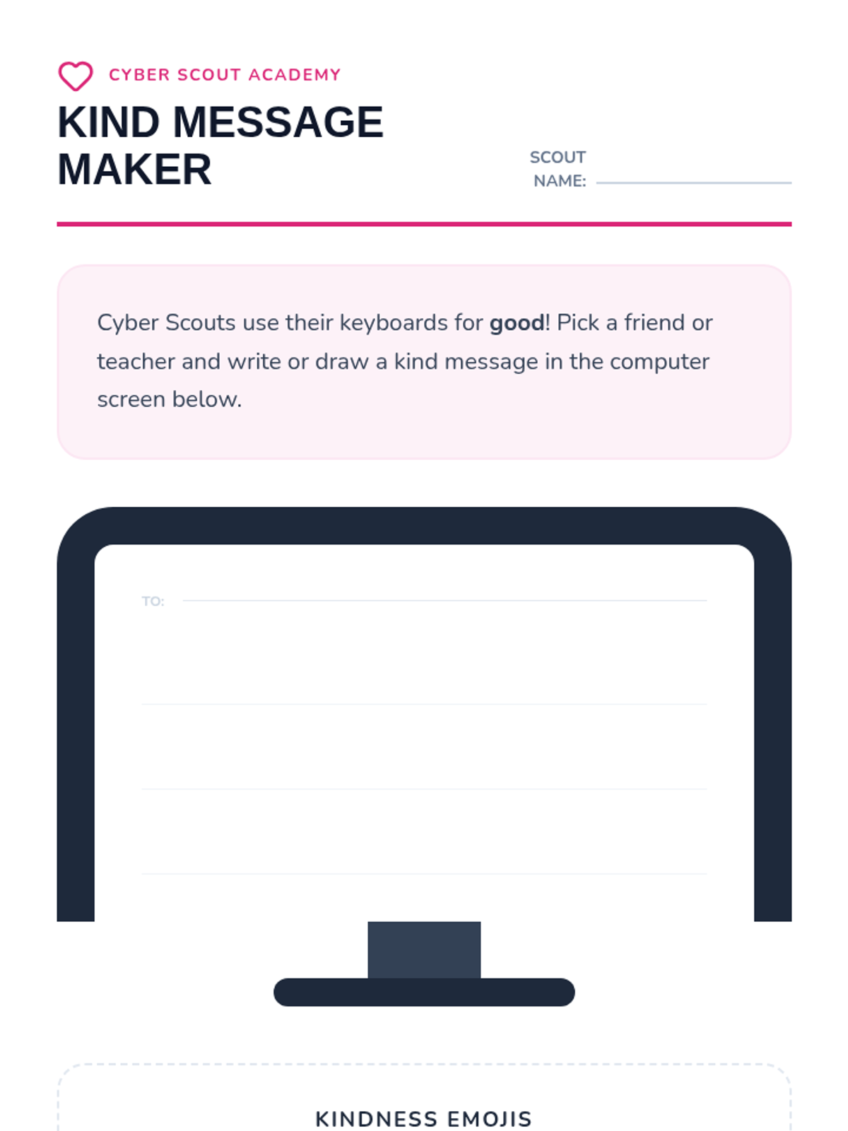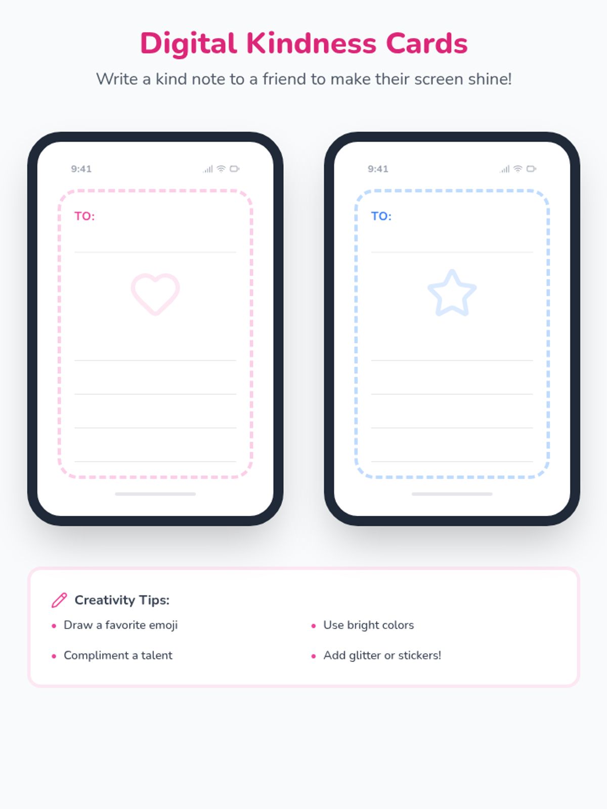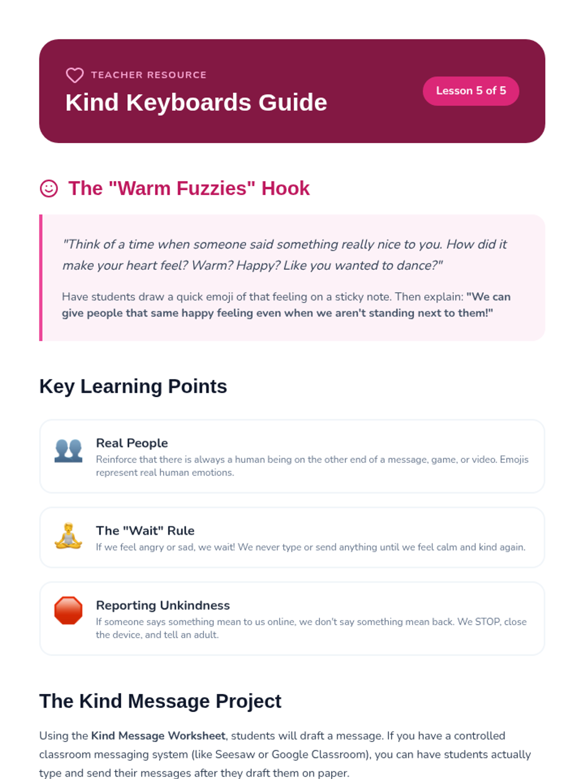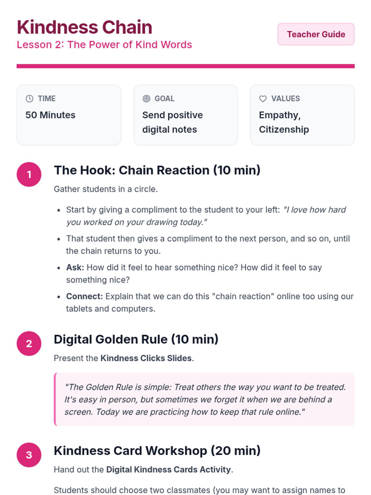 Students practice sending 'digital kindness' by writing nice notes or drawing pictures for classmates. They learn the Golden Rule applies to tablets and computers too.