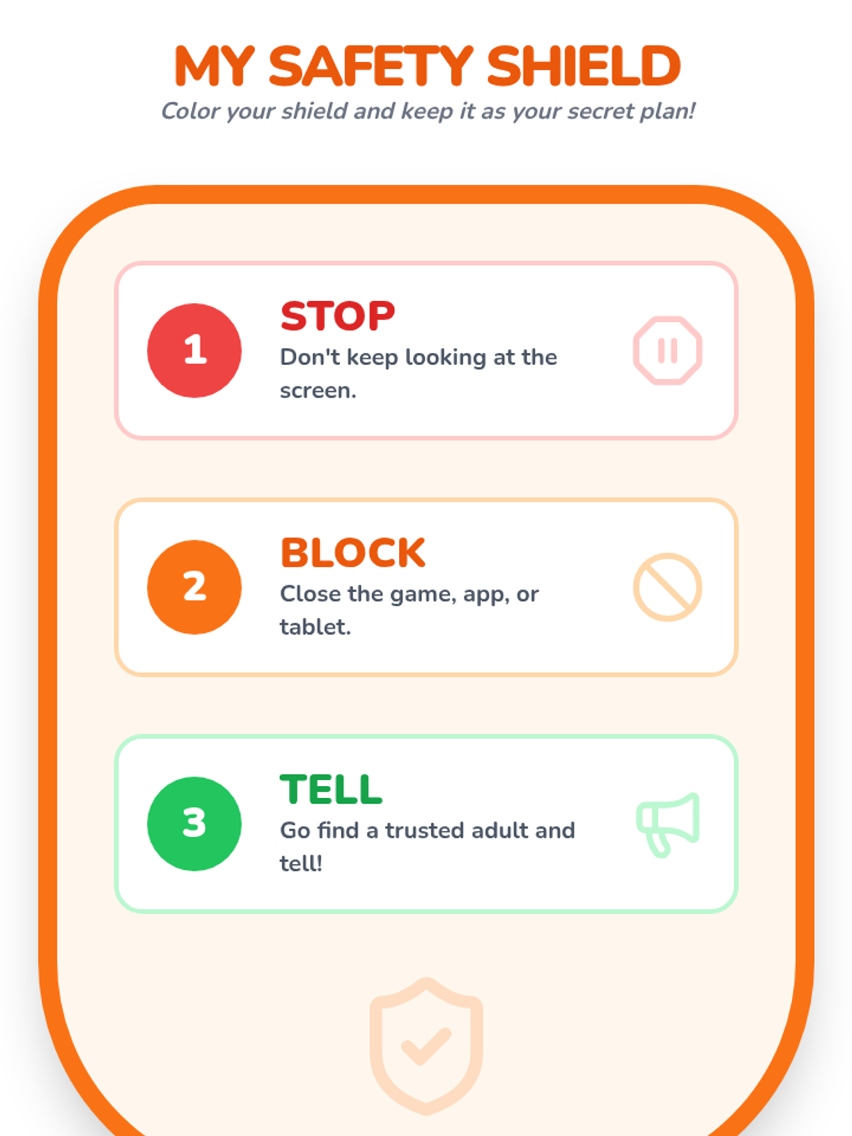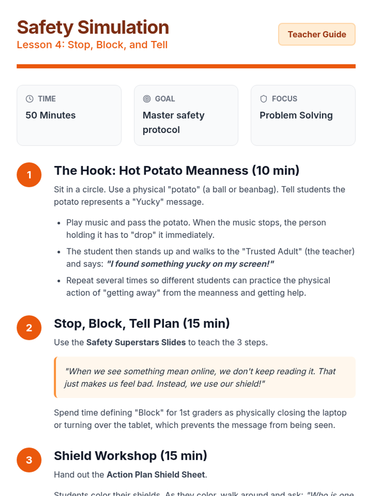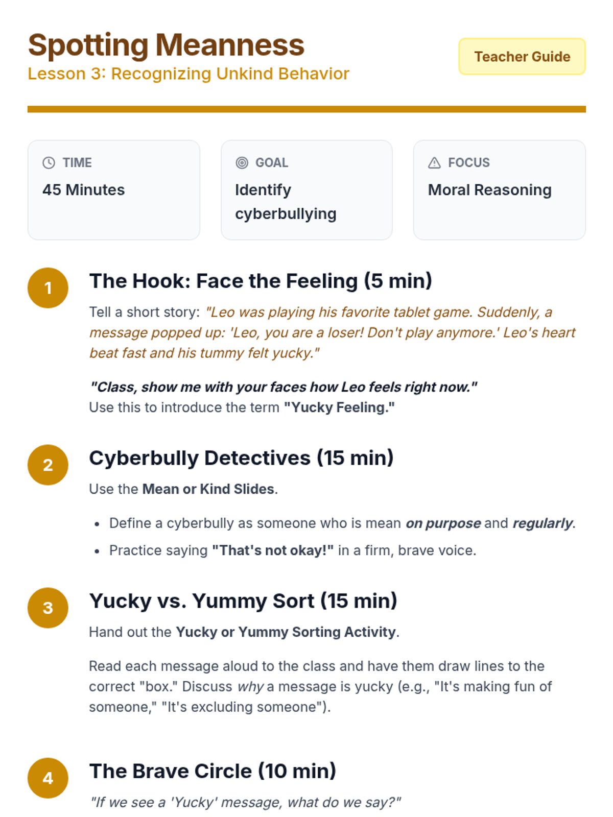 Students learn the specific action plan for when they encounter meanness: Stop looking, Block the person (or close the device), and Tell a trusted adult immediately.