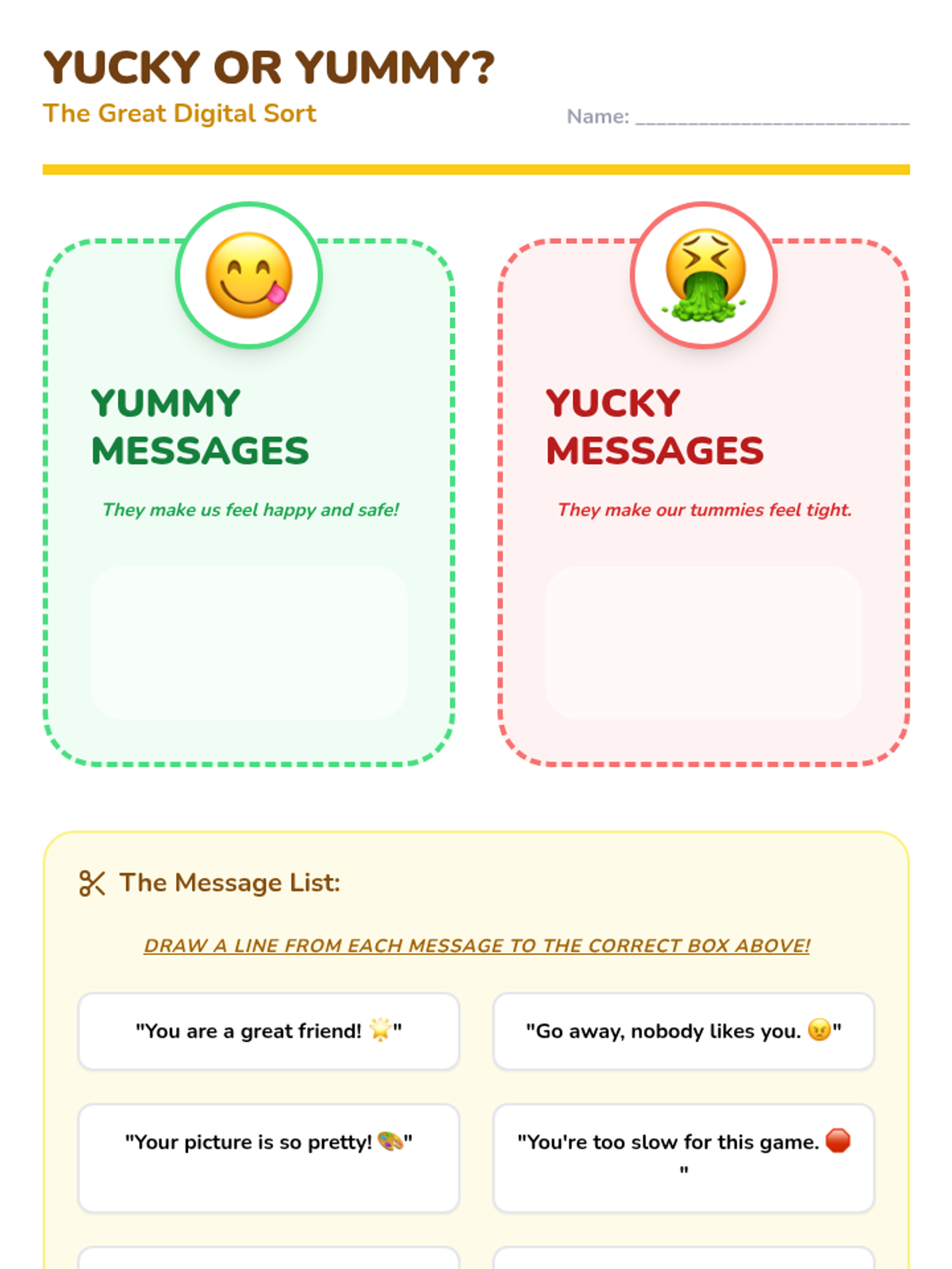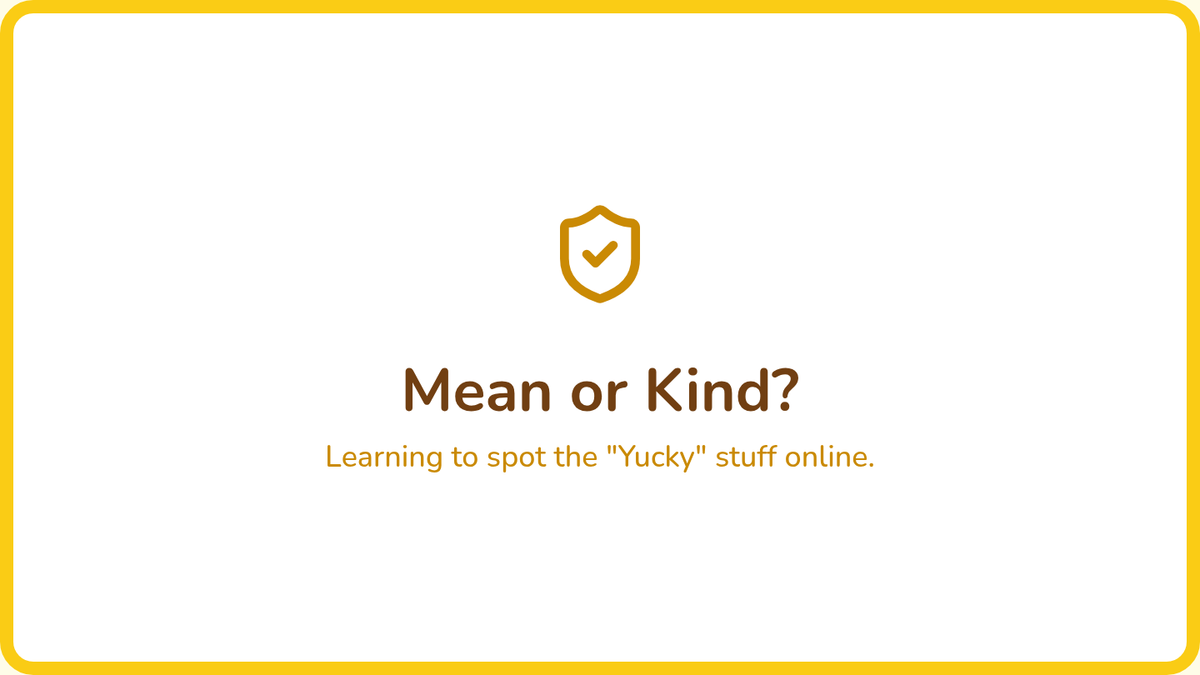Through simple storybooks or scenarios, students identify when a character is being a 'cyberbully' (mean online). They practice naming the behavior as 'not okay.'
