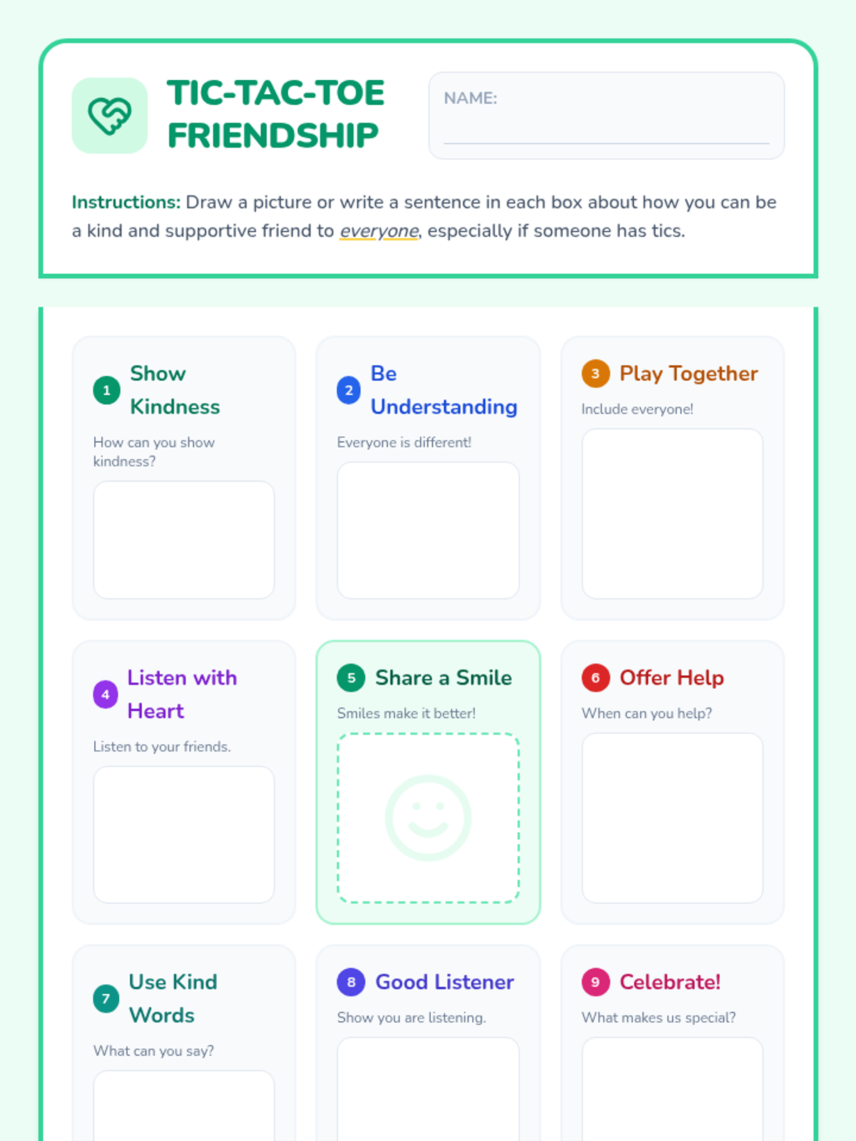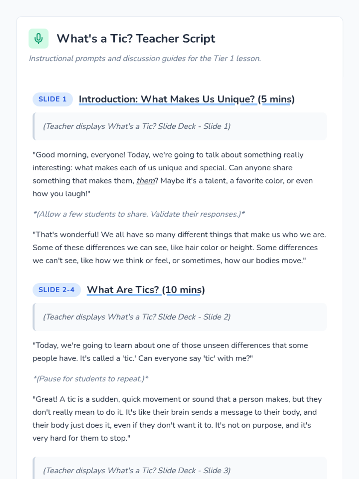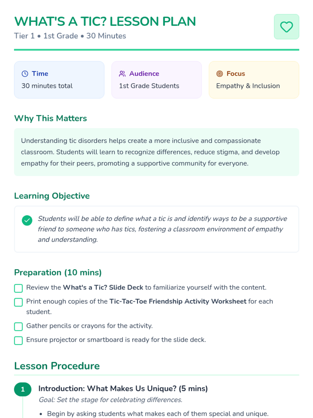 This lesson introduces 1st-grade students to tic disorders, fostering empathy and understanding. Through discussion and activities, students will learn what tics are and how to be a supportive friend. One 30-minute session for elementary school students.