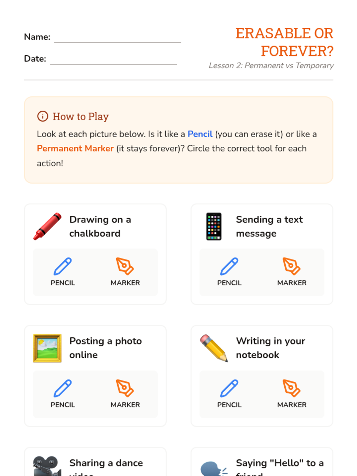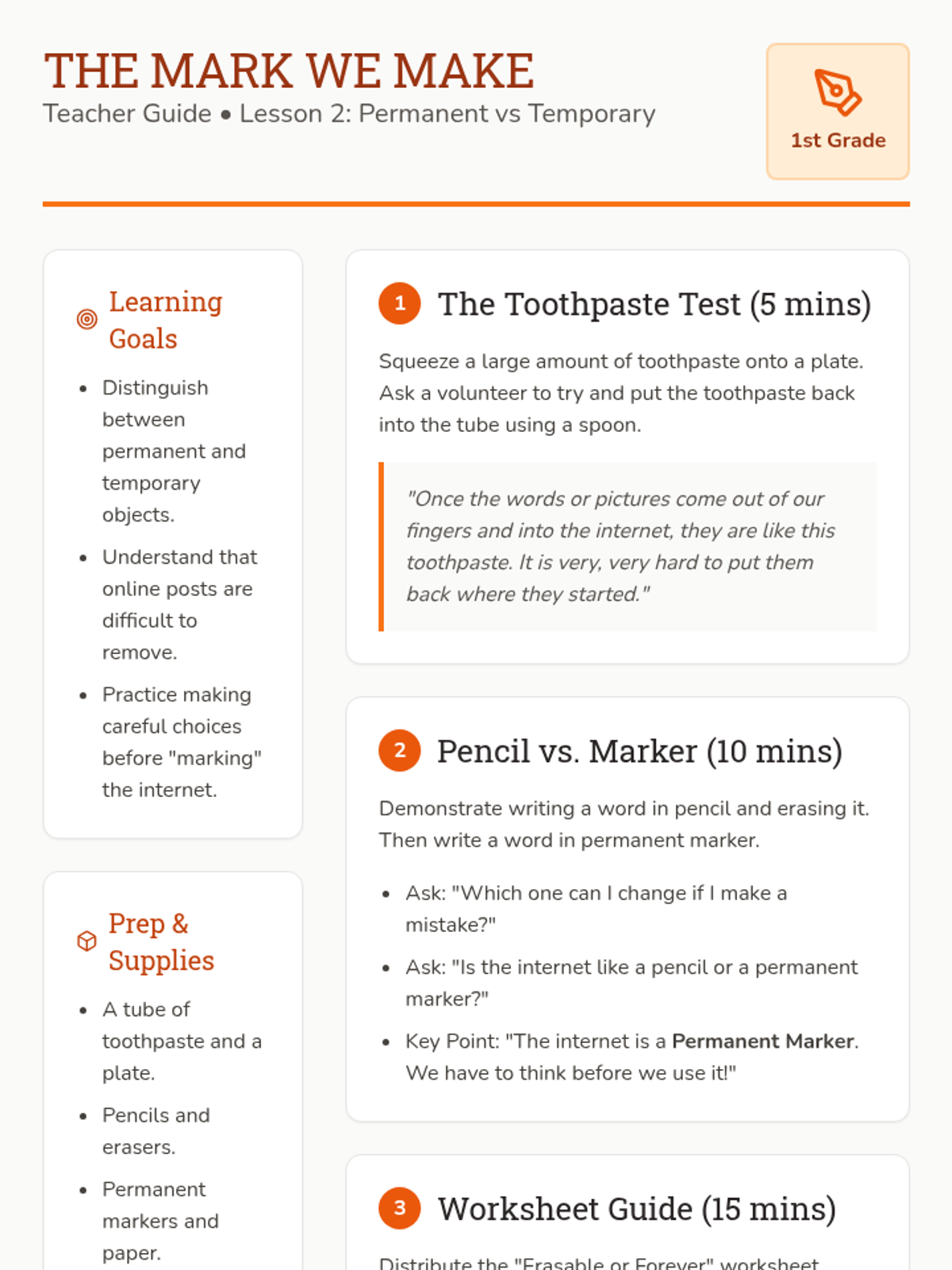 Using the toothpaste and marker metaphors, students distinguish between things that can be erased and things that stay forever online.