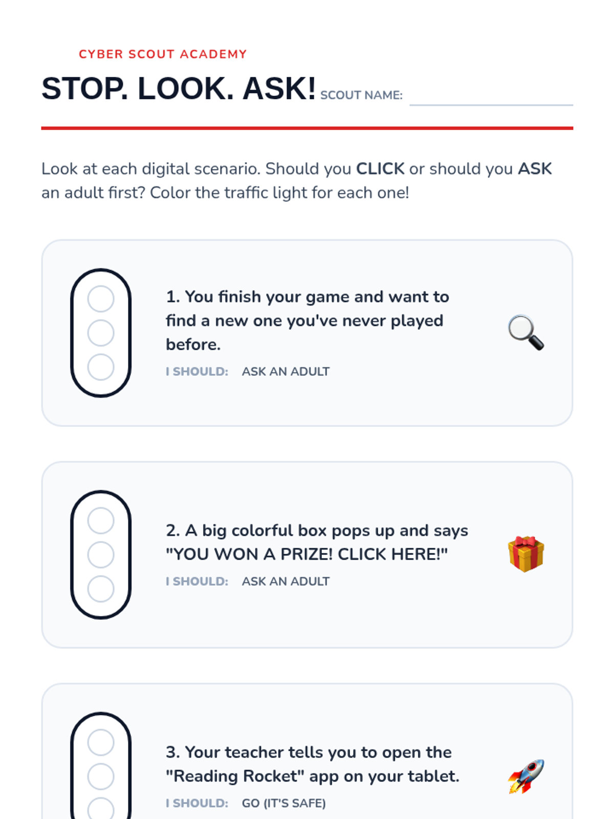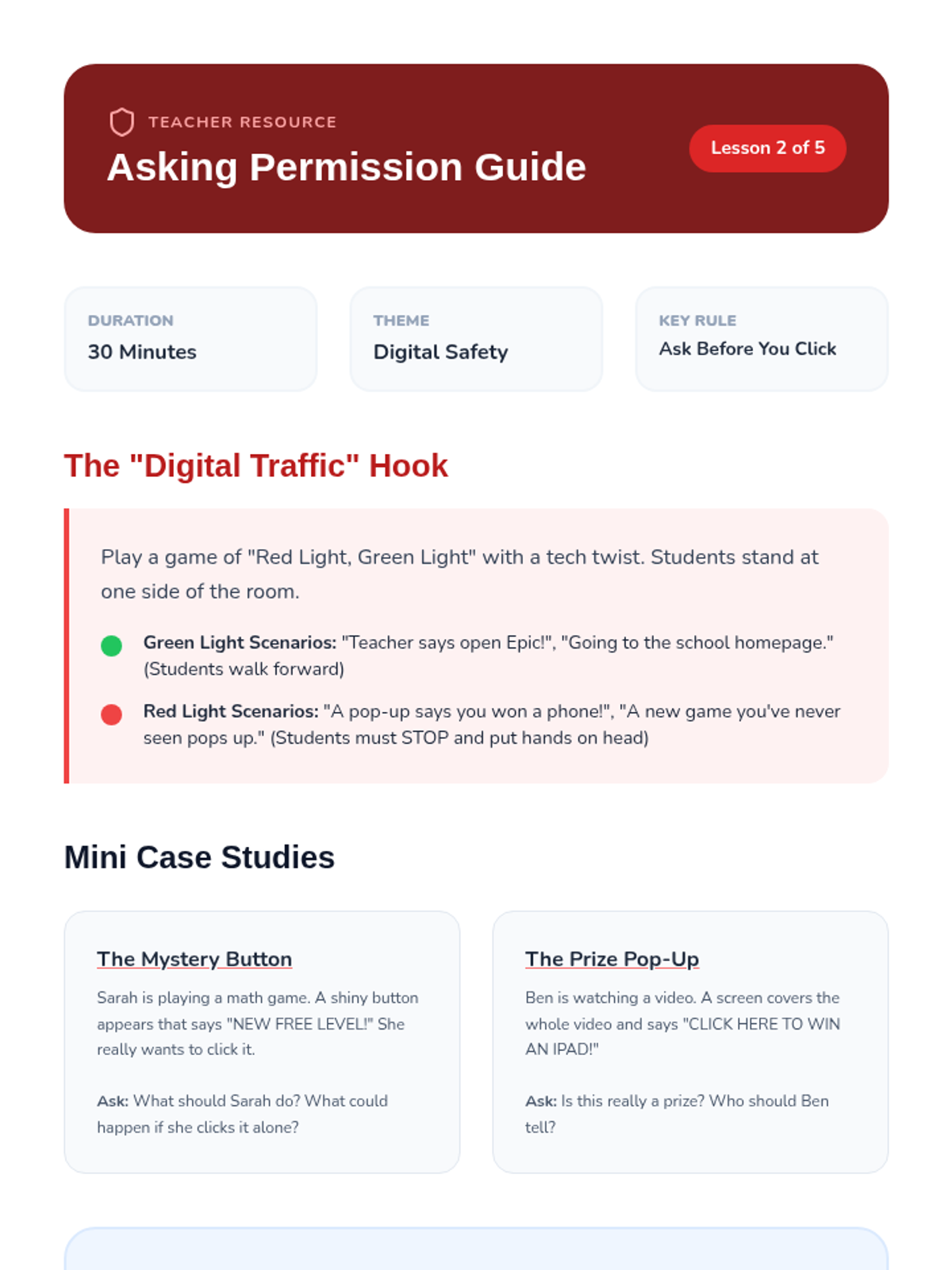 Focuses on the essential safety rule of asking a trusted adult for permission before going online, downloading apps, or clicking new links.