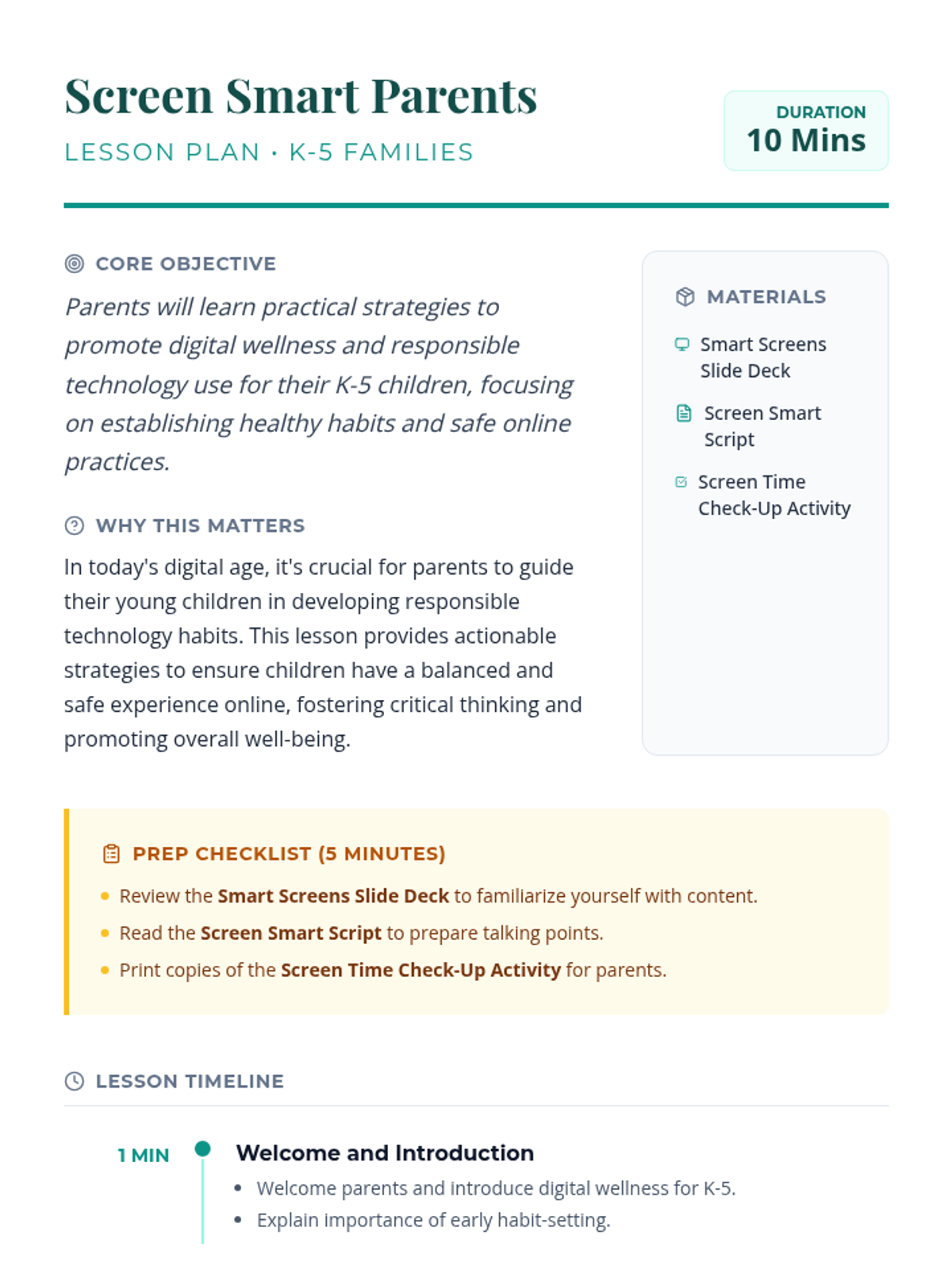 This 10-minute lesson provides K-5 parents with essential strategies for fostering digital wellness and responsible technology usage in their children, focusing on balanced screen time and safety.