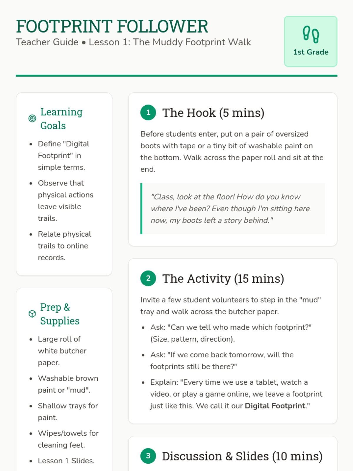 Students explore the concept of a 'trail' using physical footprints to understand how actions online leave a record of where they have been.