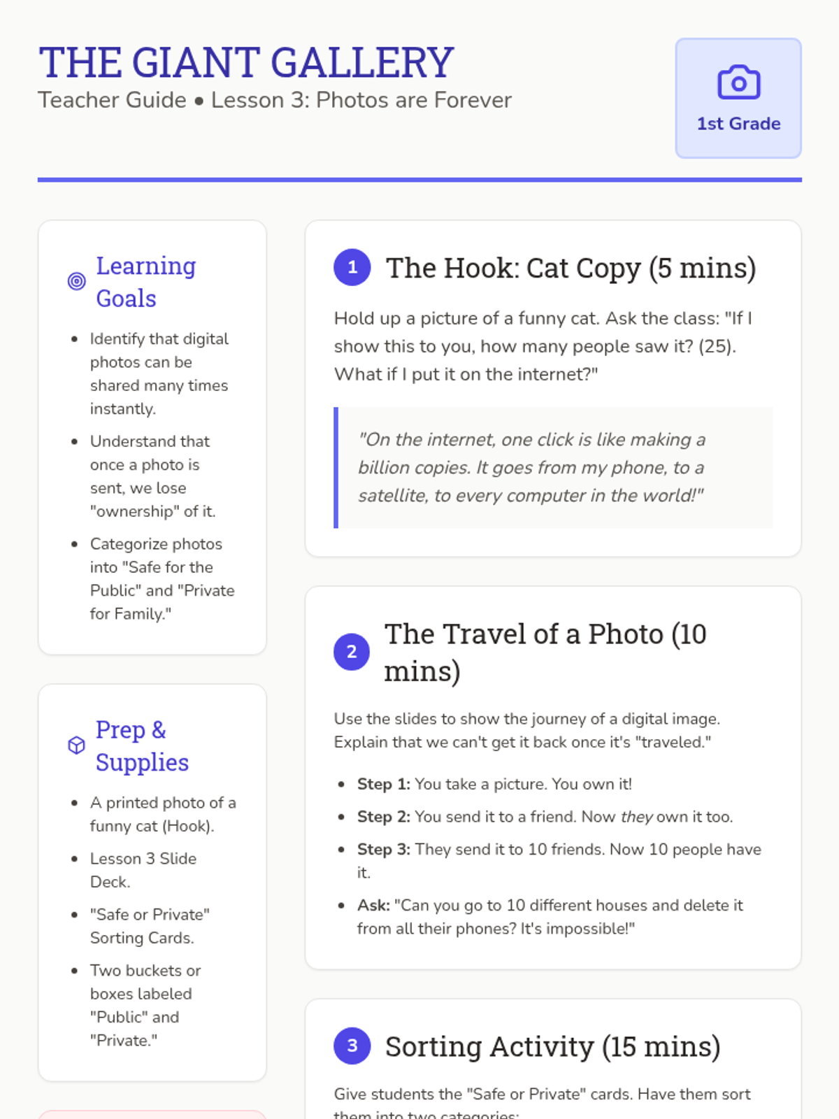 Students learn about photo sharing and the lack of control once an image is online, practicing safe vs. private photo choices.