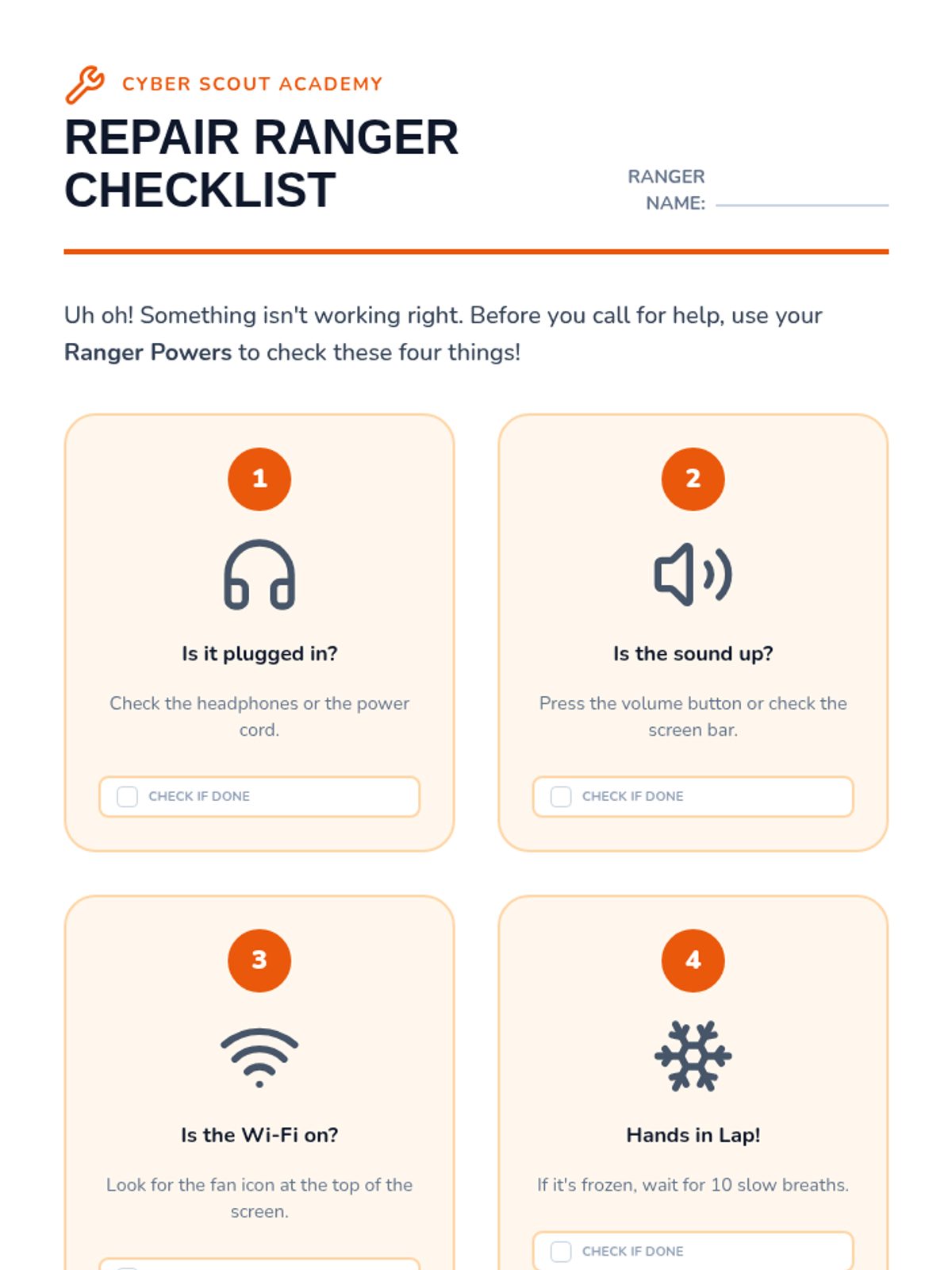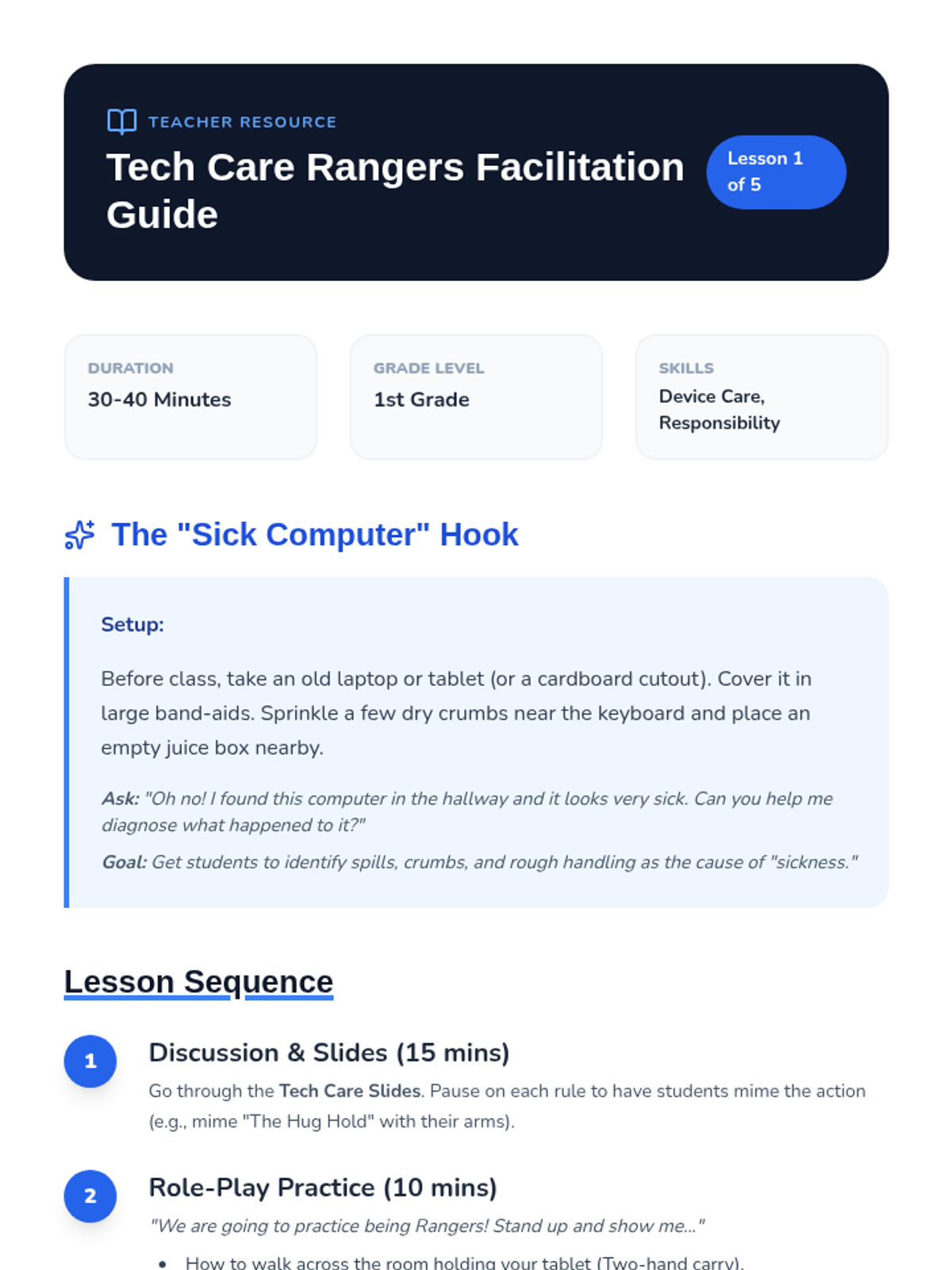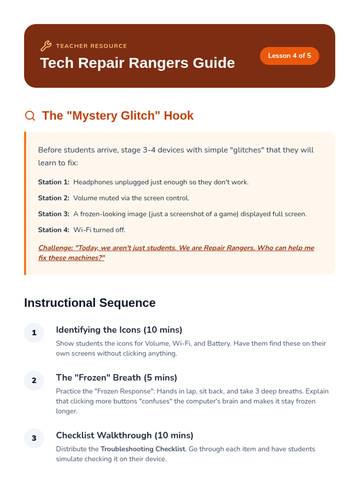 Empowers students with basic troubleshooting steps for common tech issues like sound, internet connection, and frozen screens.