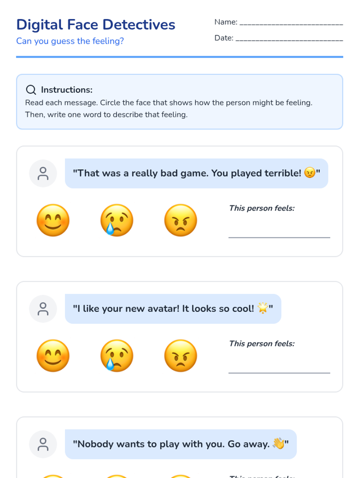 Students look at emojis and text messages to determine the emotion behind them. They discuss how it is harder to tell if someone is joking or being mean when you can't see their face.