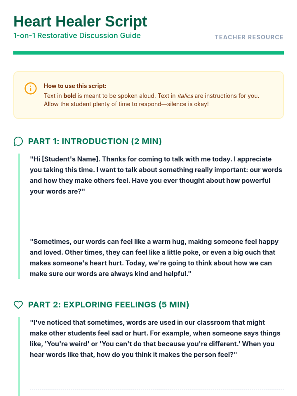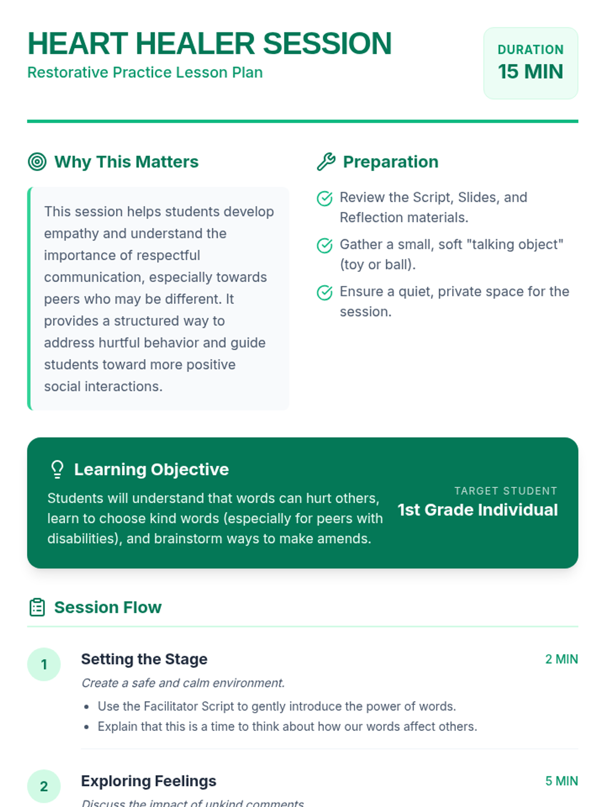 A 15-minute one-on-one restorative practice session designed for a 1st-grade student to build empathy, understand the impact of hurtful words, and make amends after an incident involving a peer with a disability.