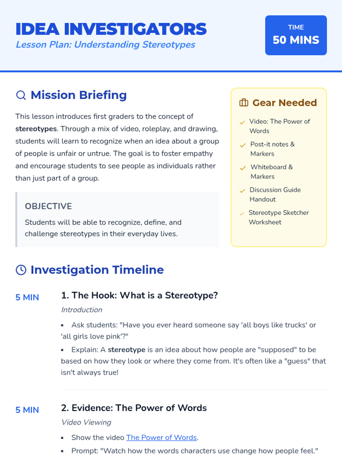 This lesson introduces first graders to the concept of stereotypes, helping them recognize and challenge preconceived notions through video, discussion, and hands-on activities. Students will explore how words affect others and learn to appreciate individuality over generalizations.