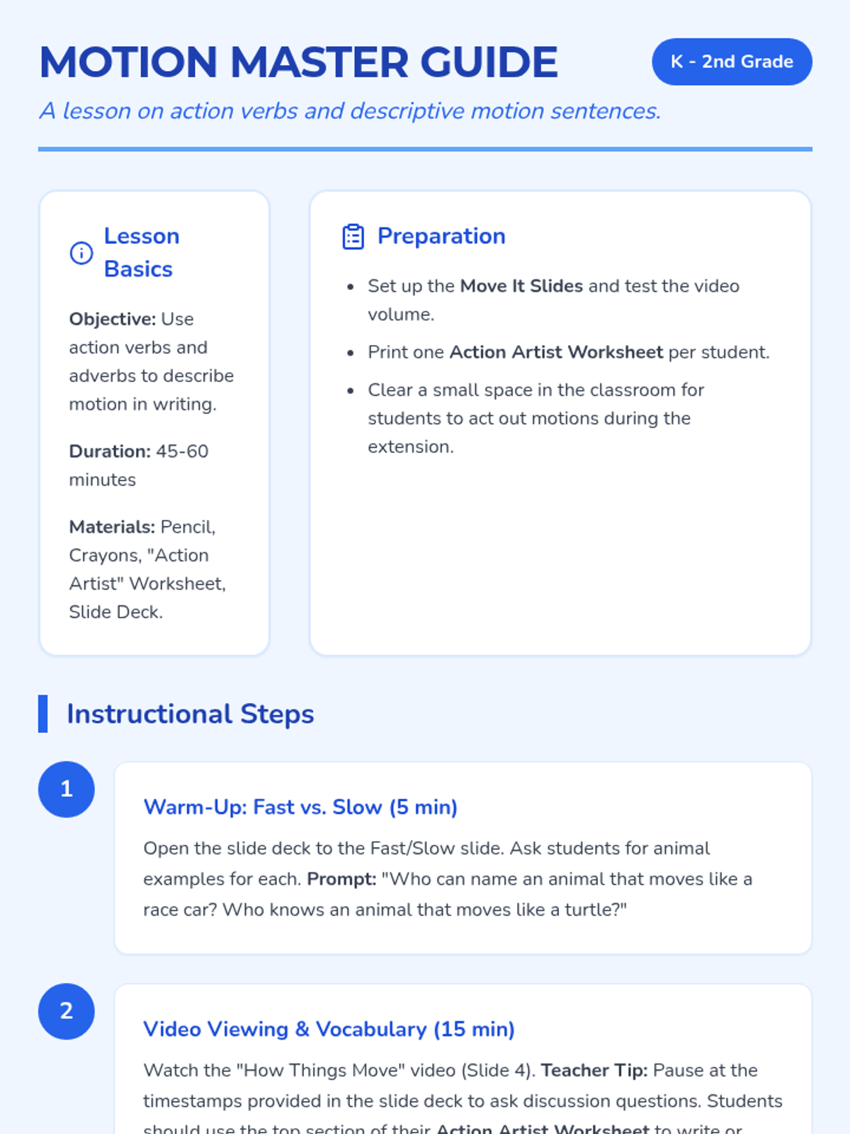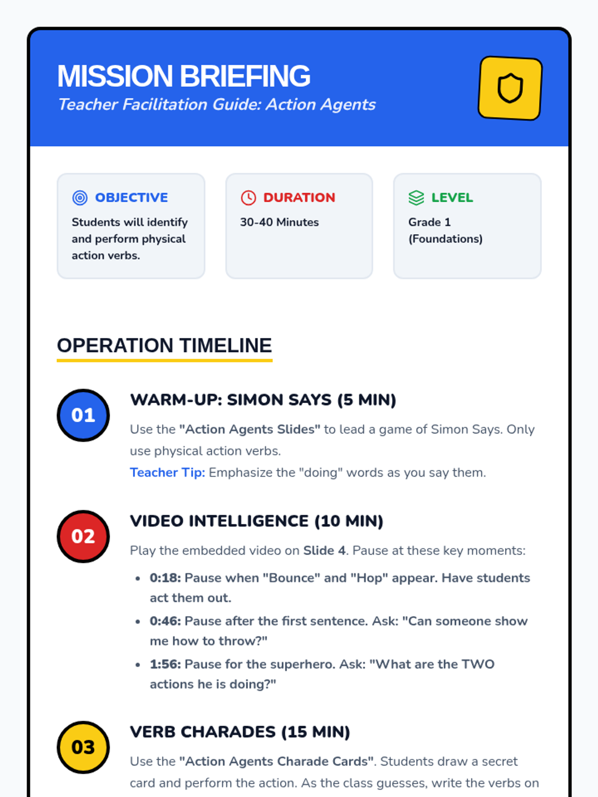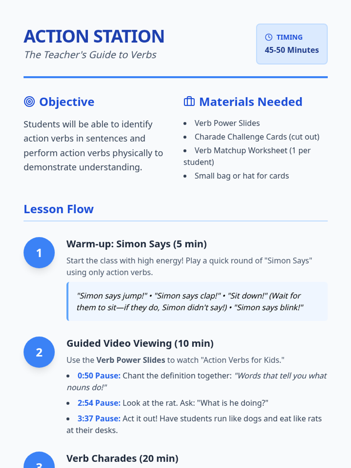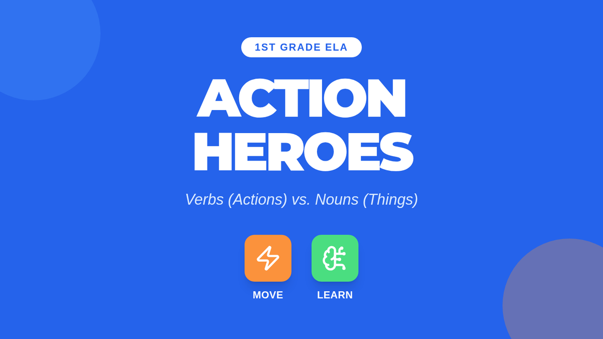 A high-energy lesson introducing 1st graders to action verbs through movement, a guided video viewing, and a hands-on charades game. Students will learn that verbs are words that tell us what nouns do.