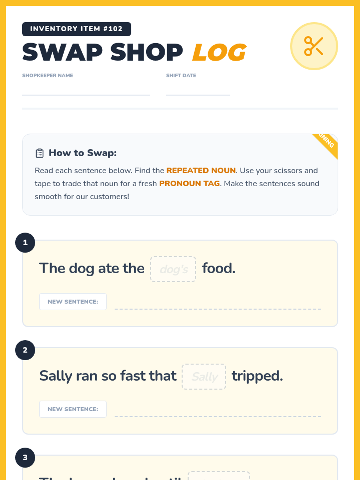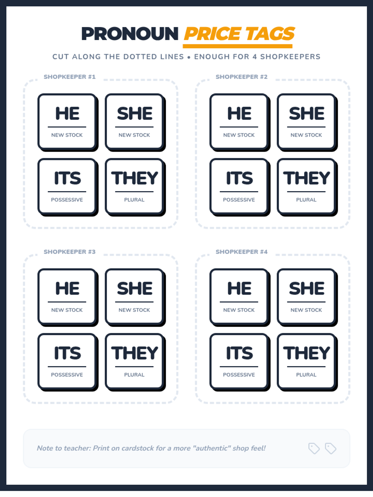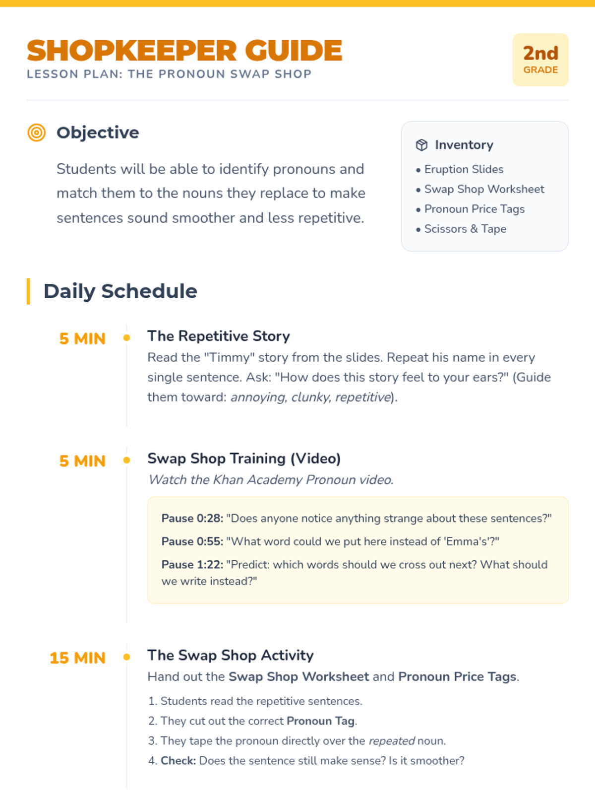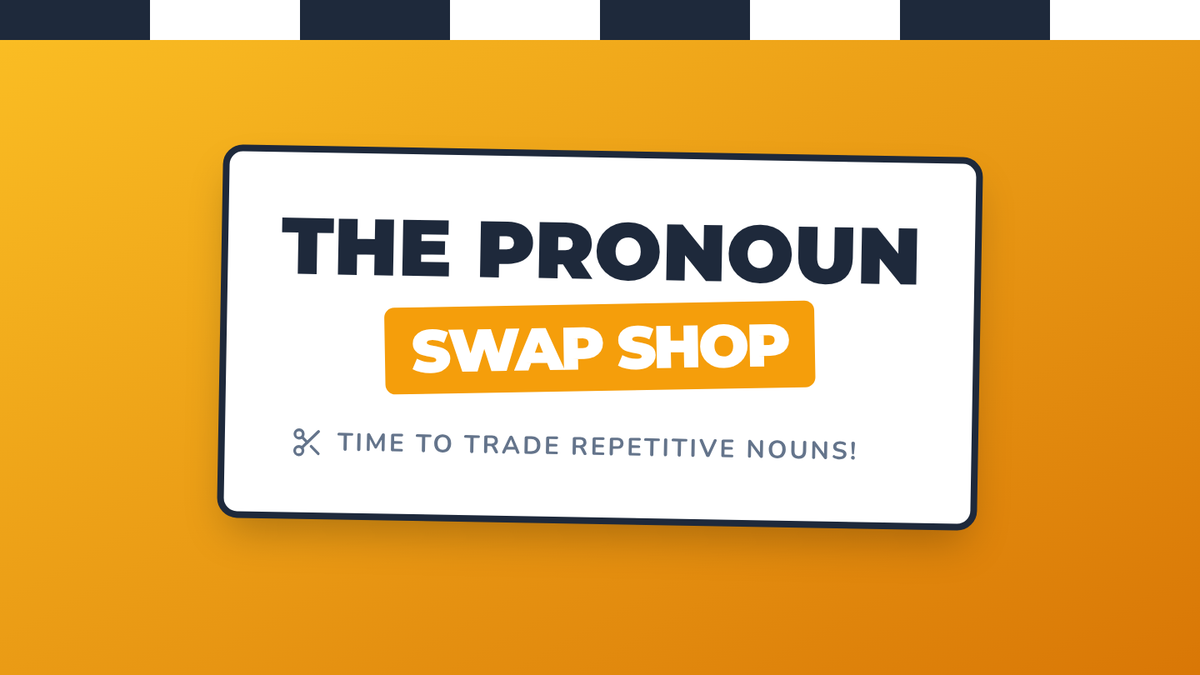 A fun, hands-on grammar lesson where students act as 'shopkeepers' to swap out repetitive nouns for helpful pronouns. Includes a video-guided discussion, a physical 'cut-and-tape' activity, and an interactive guessing game.