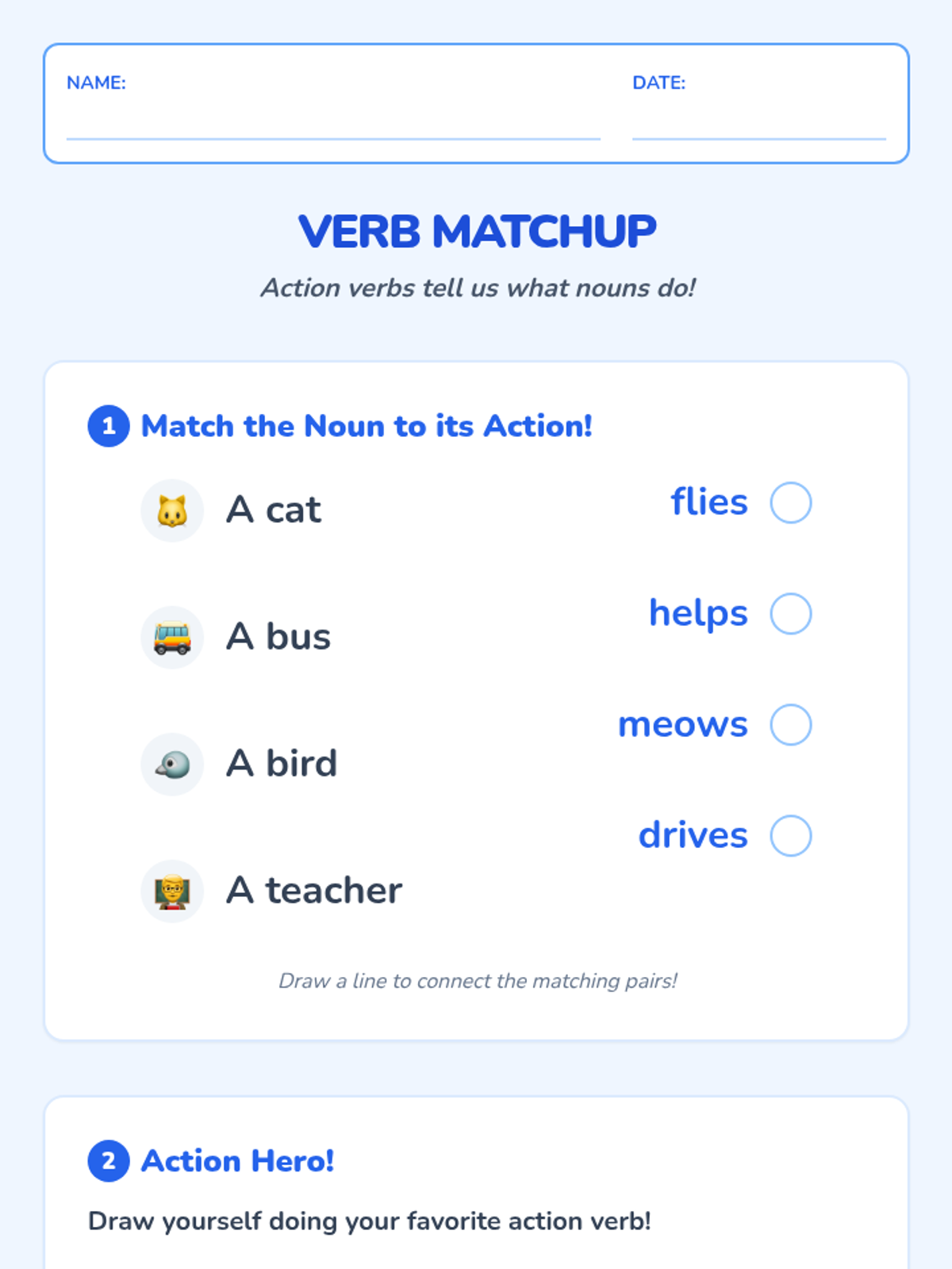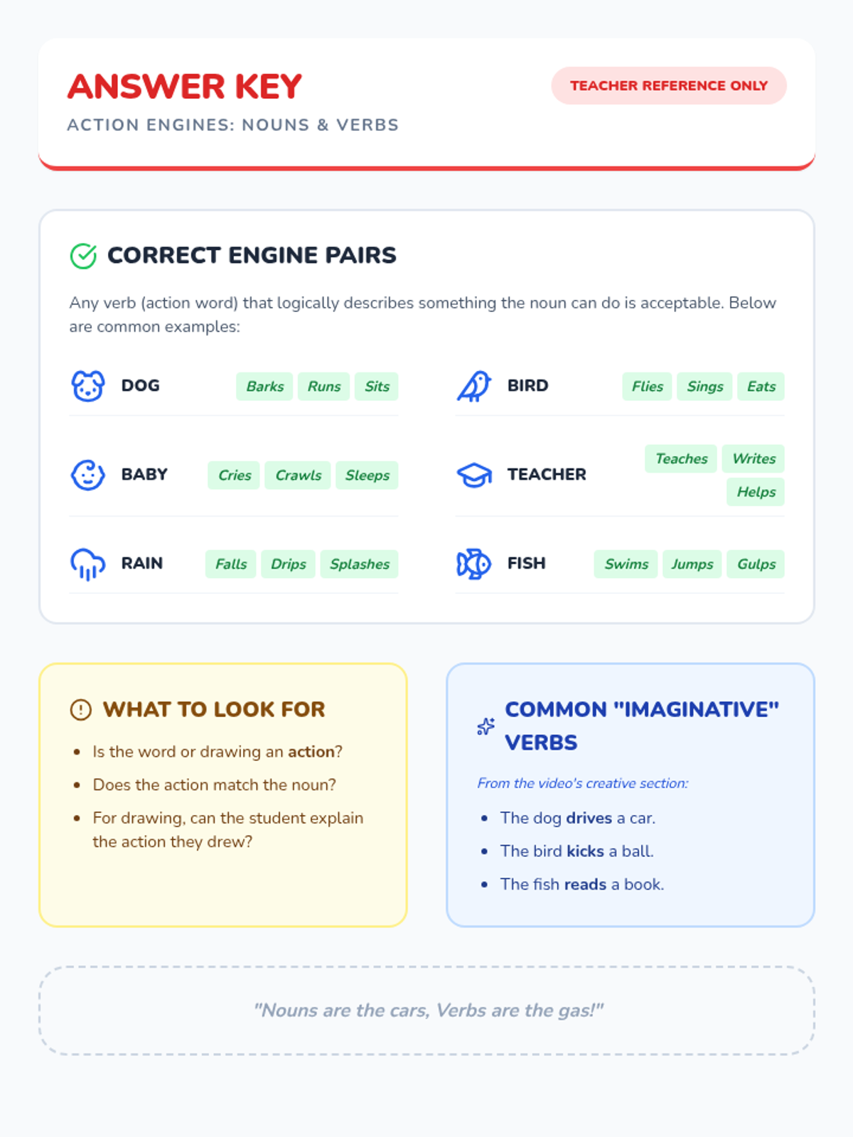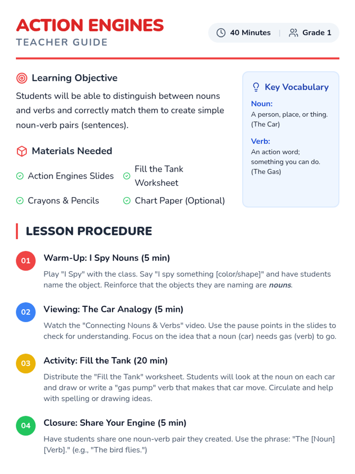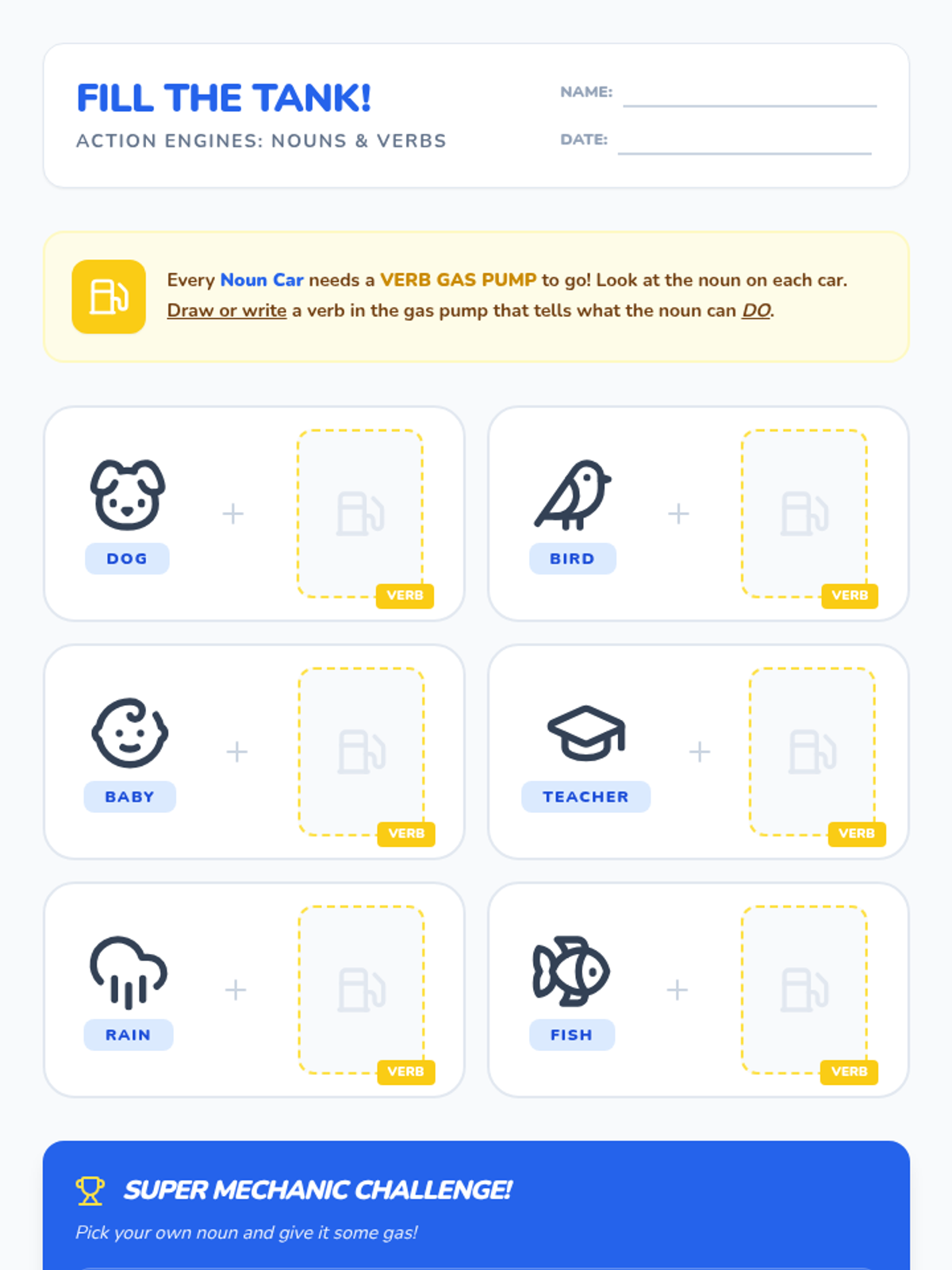 Students will explore the relationship between nouns (people, places, things) and verbs (actions) using the analogy of a car needing gas to move. Through a video, discussion, and a creative drawing activity, they will learn to pair nouns with appropriate action words.