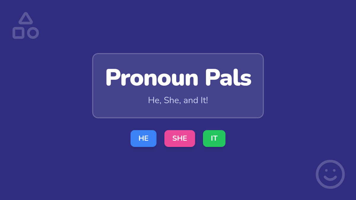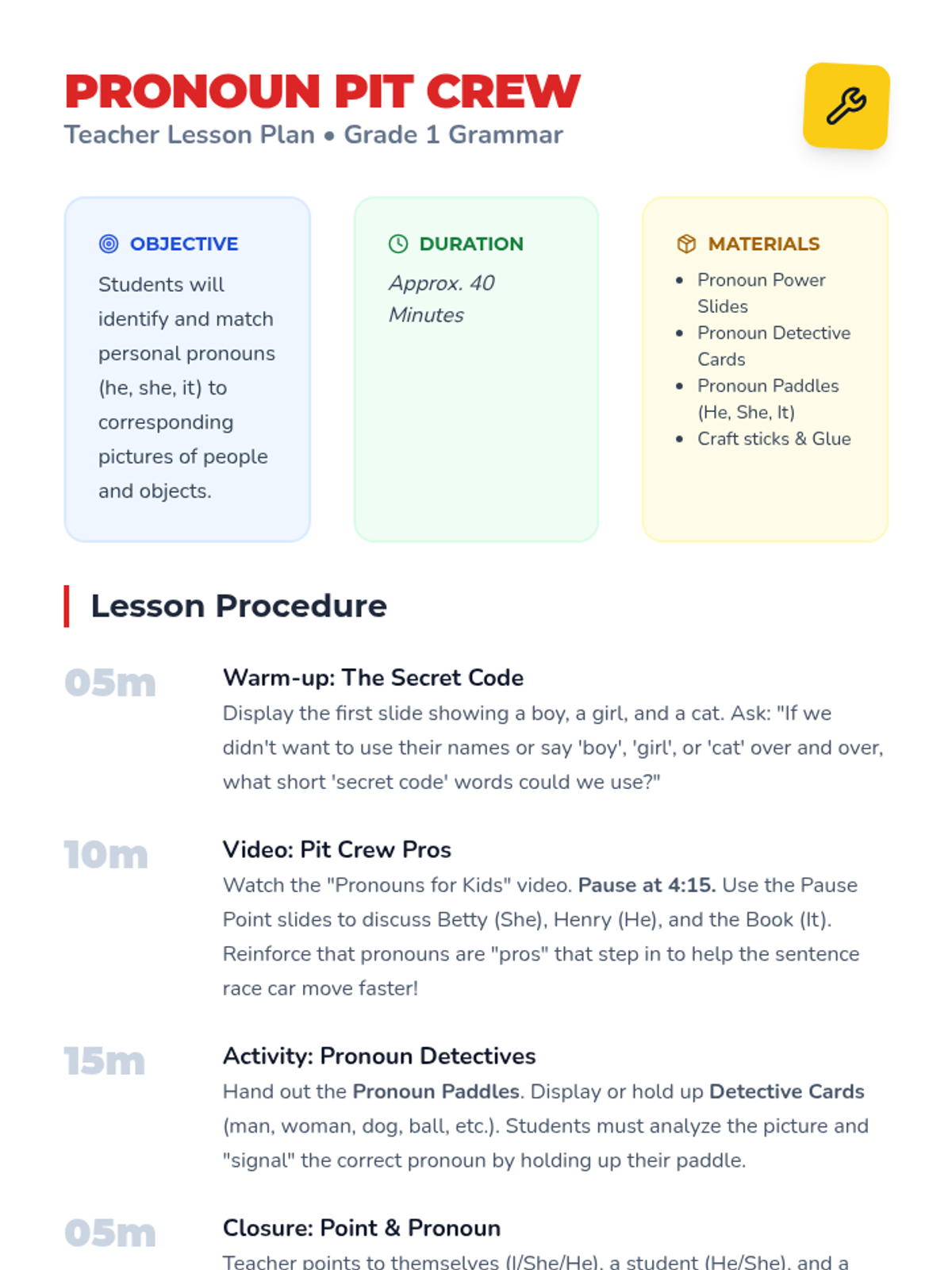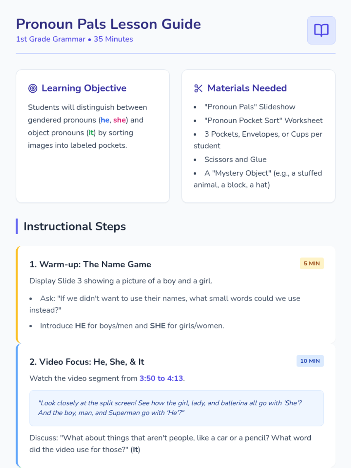 In this hands-on lesson, first-grade students learn to distinguish between gendered pronouns (he, she) and object pronouns (it). They will engage with a short instructional video followed by a 'Pronoun Pocket Sort' activity where they categorize images into designated 'He', 'She', and 'It' containers.