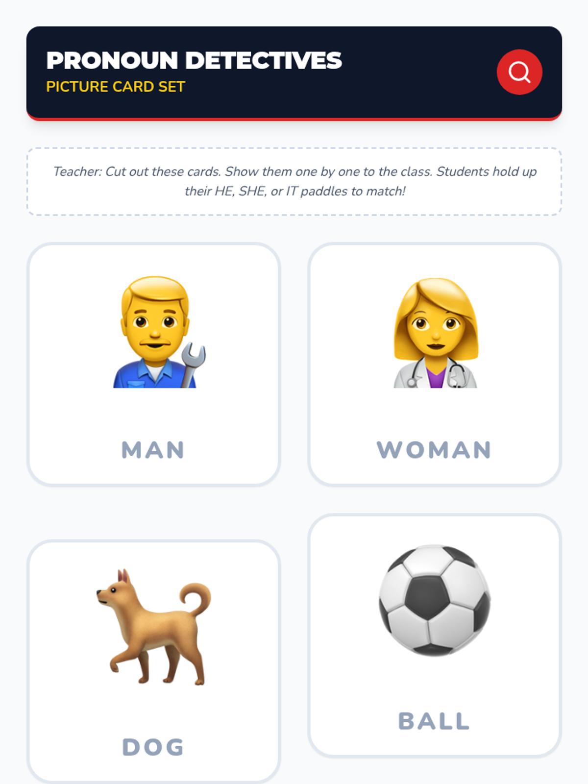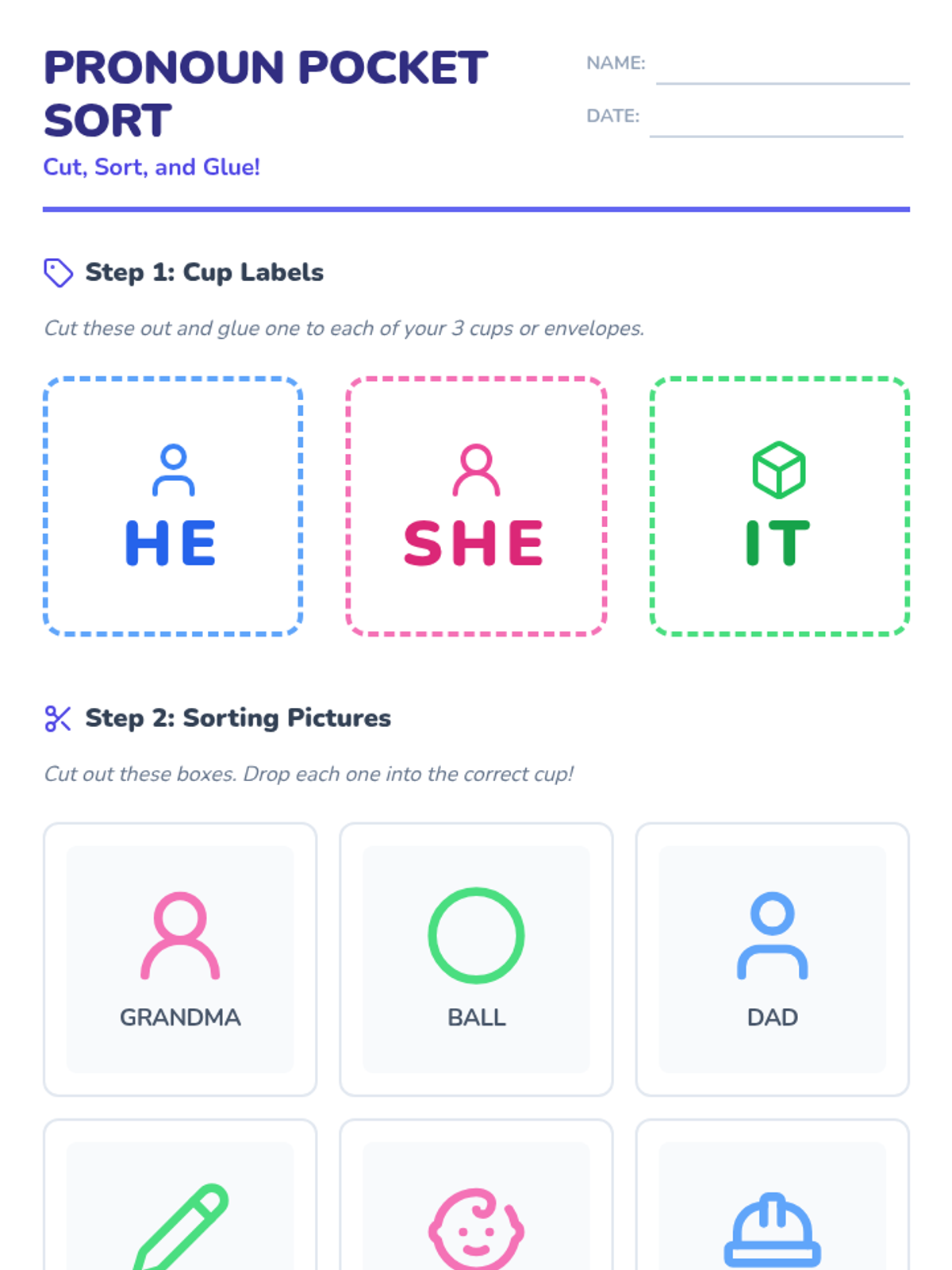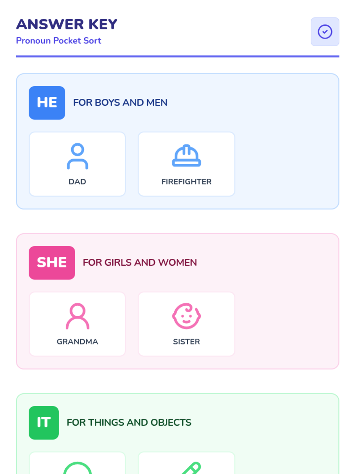 In this hands-on lesson, first-grade students learn to distinguish between gendered pronouns (he, she) and object pronouns (it). They will engage with a short instructional video followed by a 'Pronoun Pocket Sort' activity where they categorize images into designated 'He', 'She', and 'It' containers.