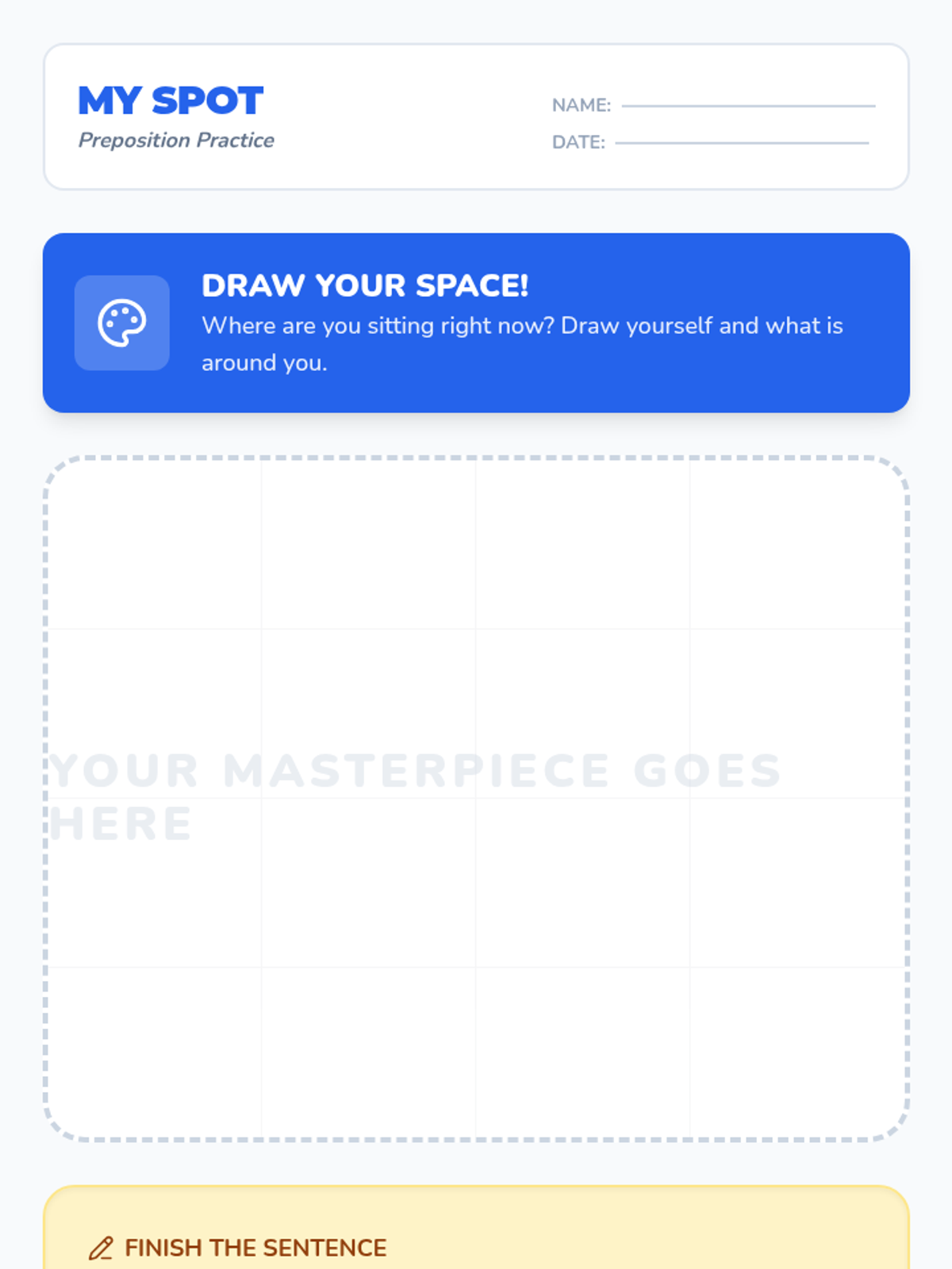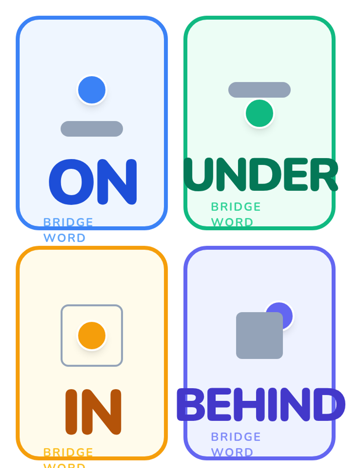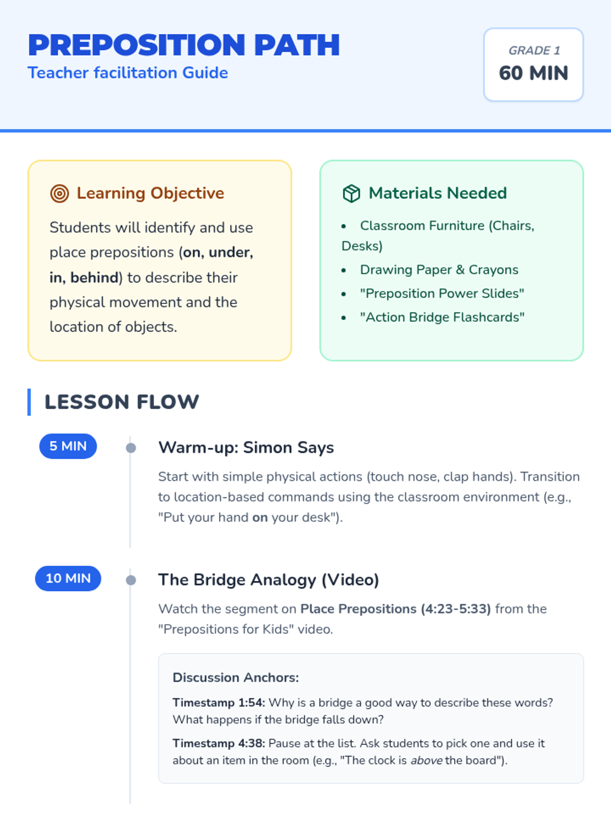 A 1st Grade lesson exploring place prepositions through the 'bridge' analogy, physical movement in an obstacle course, and creative drawing. Students will learn how prepositions connect words and describe where objects are located.