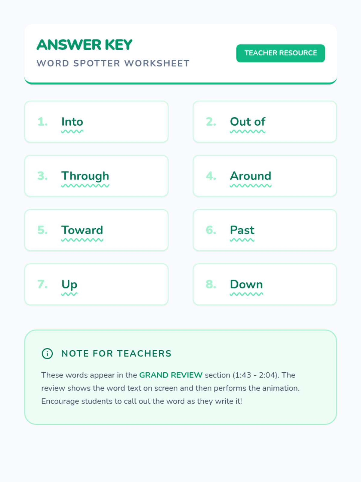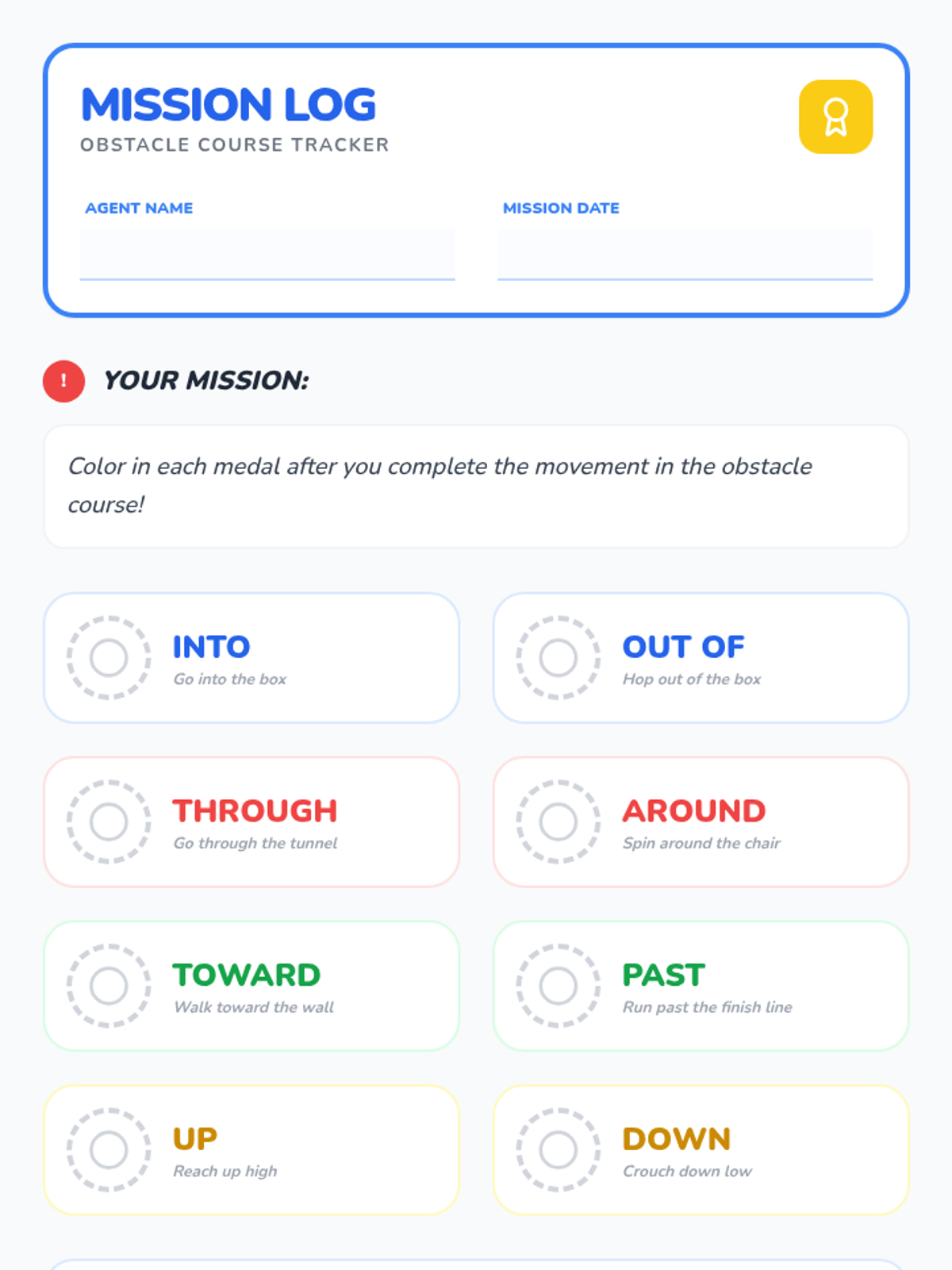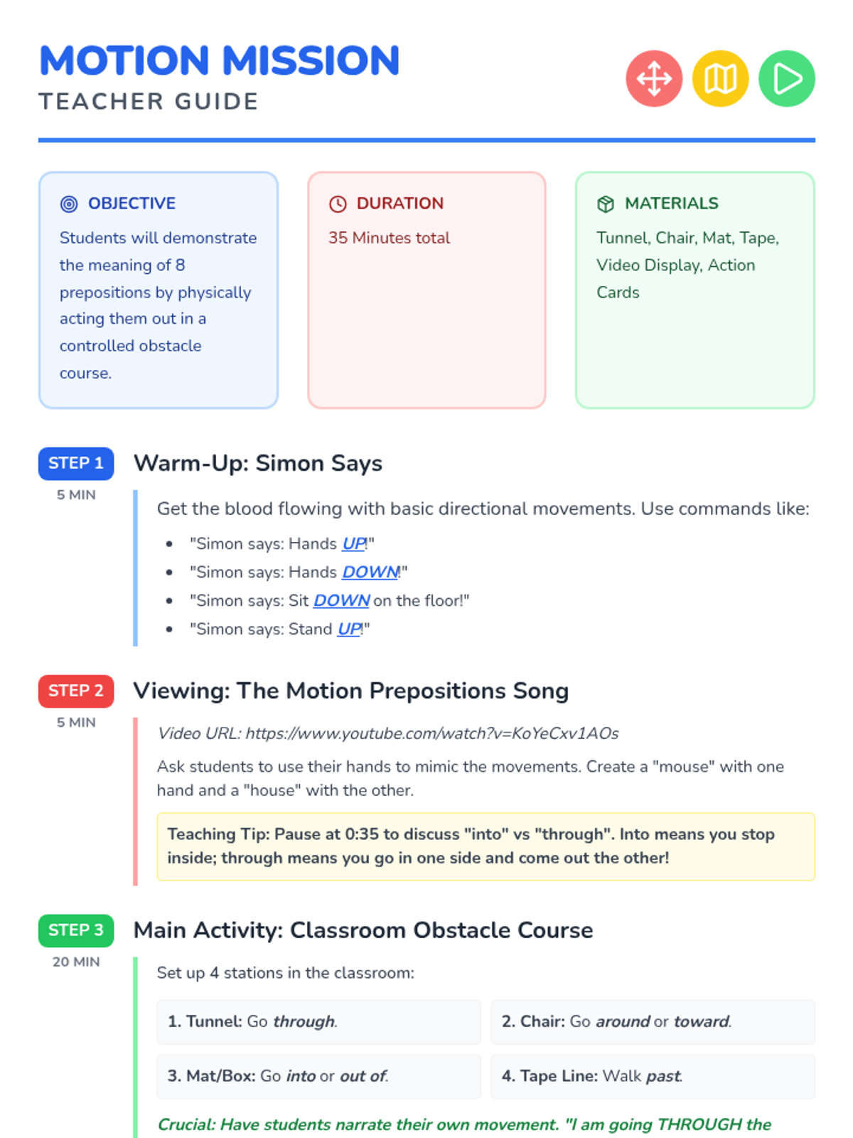 A high-energy, kinesthetic lesson for K-1 students to learn eight prepositions of movement through song, hand motions, and a classroom obstacle course. Students practice "into, out of, through, around, toward, past, up, and down" by physically navigating their environment.