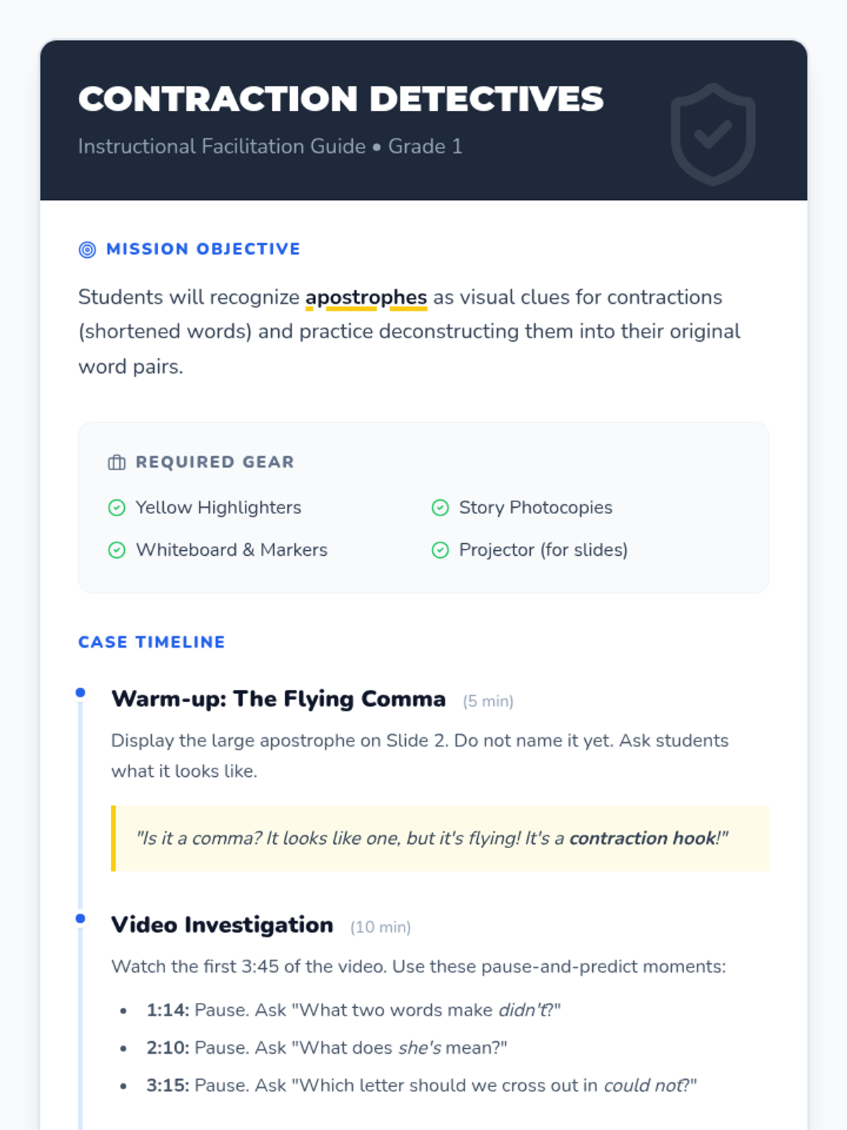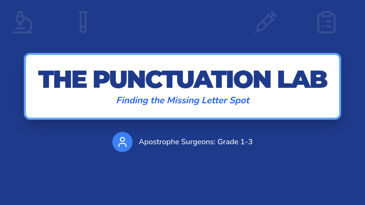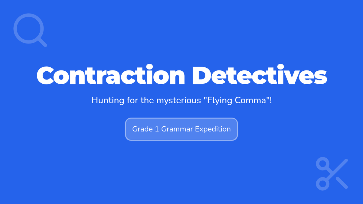 A 1st-grade introduction to contractions using the concept of 'clues' and the 'flying comma' (apostrophe) to decode shortened words. Students will watch a guided video, hunt for apostrophes in a story, and practice forming their own contractions.