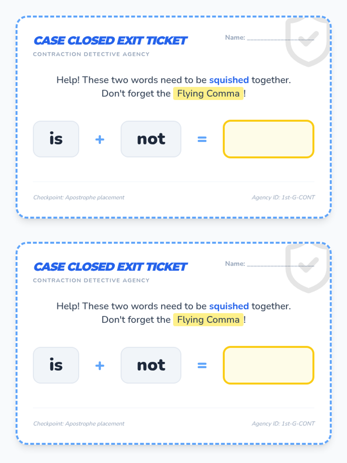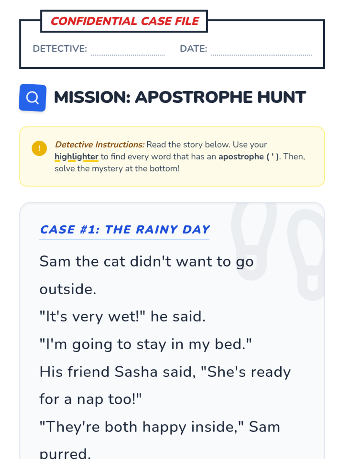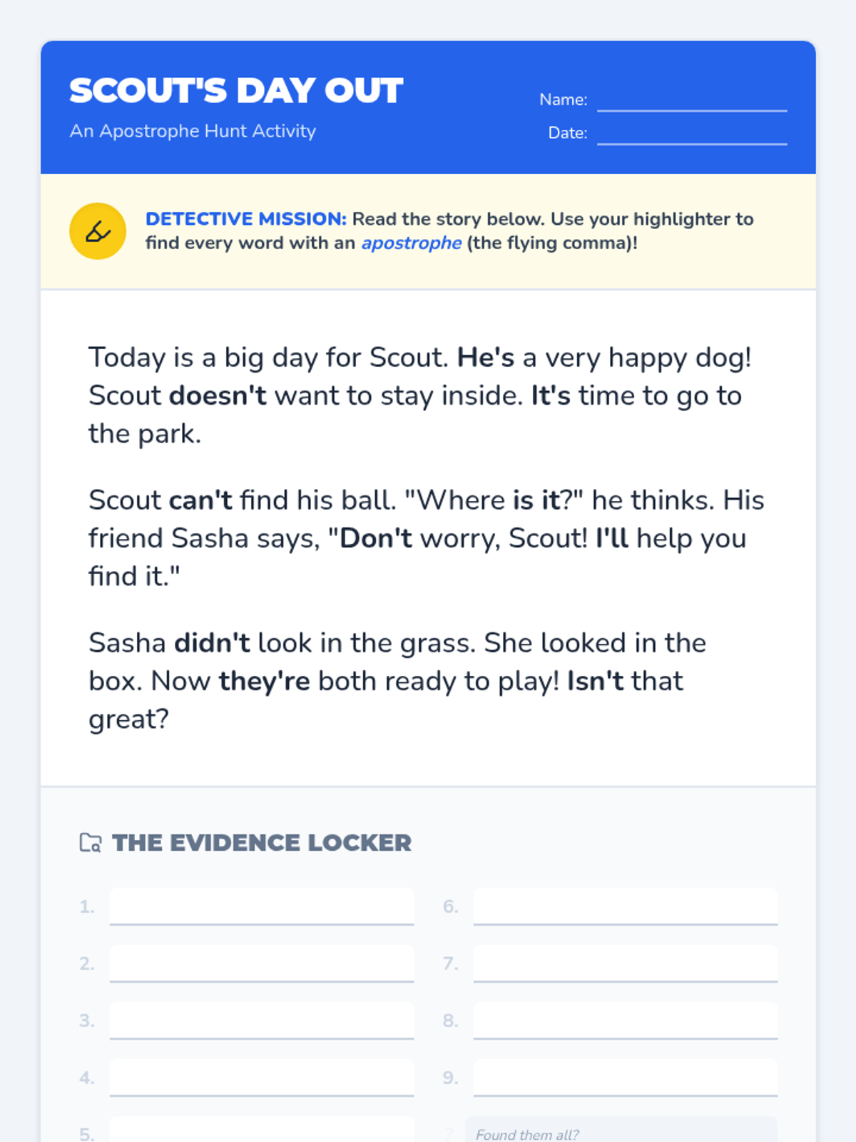 A 1st-grade introduction to contractions using the concept of 'clues' and the 'flying comma' (apostrophe) to decode shortened words. Students will watch a guided video, hunt for apostrophes in a story, and practice forming their own contractions.