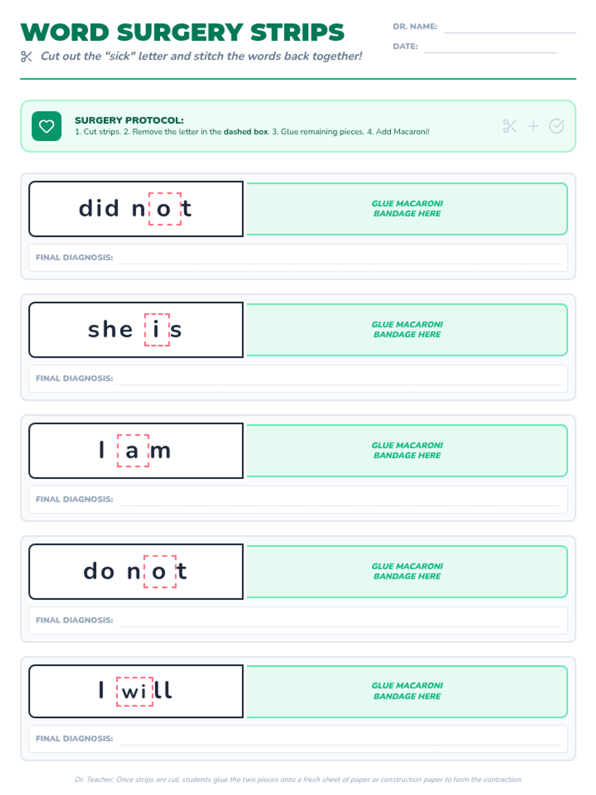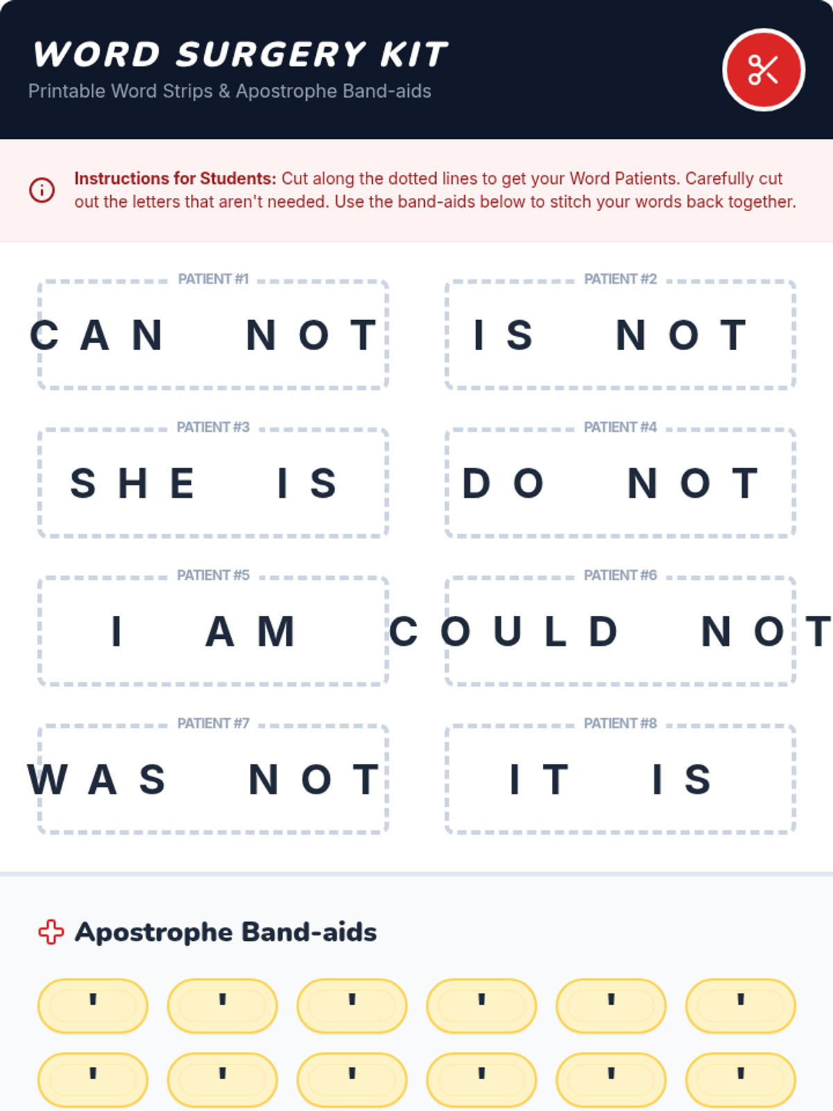 A hands-on ELA lesson where 1st grade students act as 'word surgeons' to create contractions by removing letters and applying 'band-aid' apostrophes. Includes a guided video analysis and a physical cutting and pasting activity.