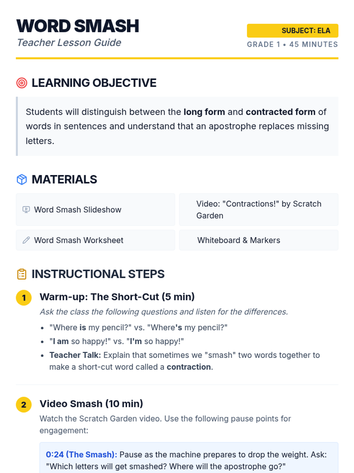 A 1st-grade introduction to contractions where students learn how two words 'squeeze' together and use an apostrophe as a placeholder for missing letters. The lesson includes a warm-up game, an interactive video viewing, and a hands-on memory matching activity.