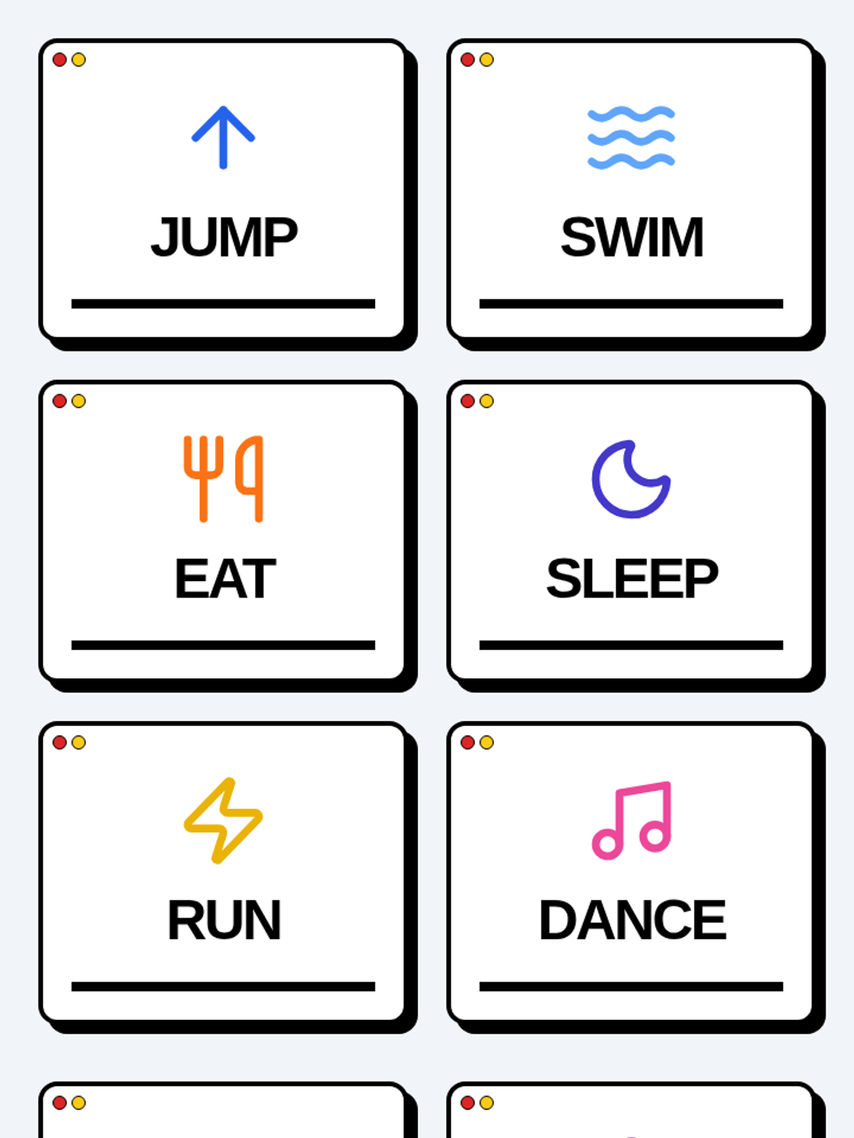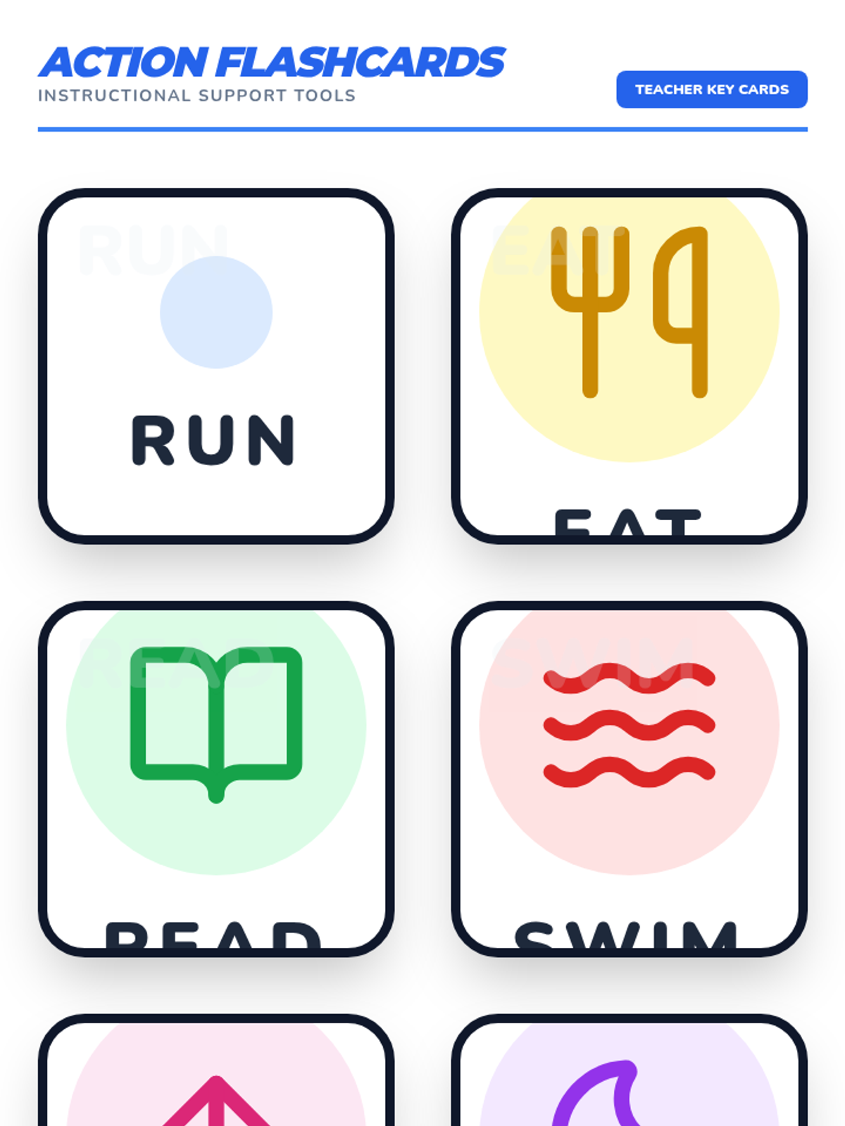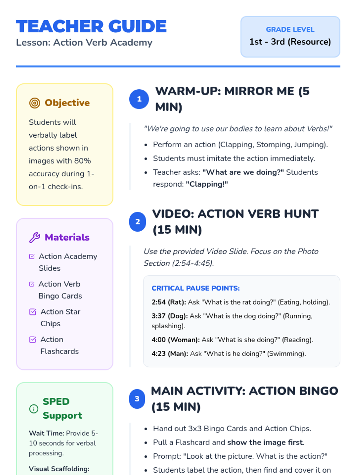A high-energy lesson for 1st-3rd grade Resource Room students focused on identifying and labeling action verbs through physical imitation, video modeling, and a movement-themed bingo game.