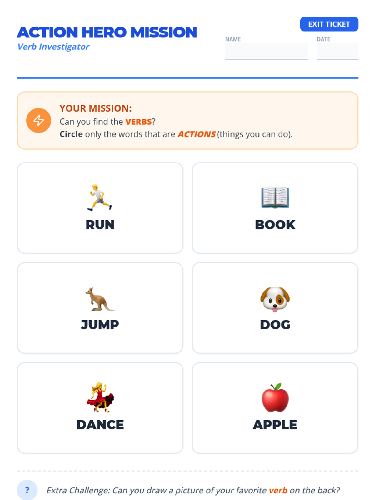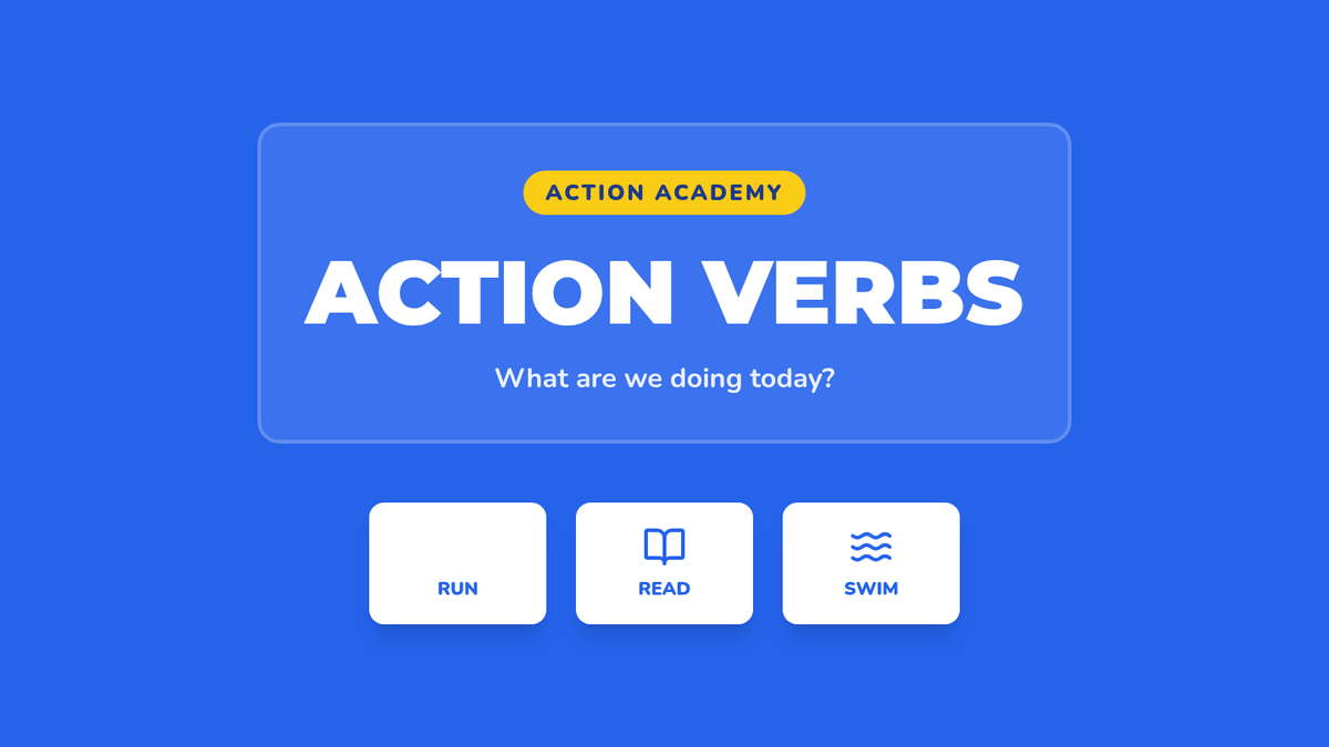 A high-energy 1st-grade lesson introducing physical action verbs through movement, video analysis, and interactive games. Students will learn to identify 'doing' words and express them through drawing and performance.