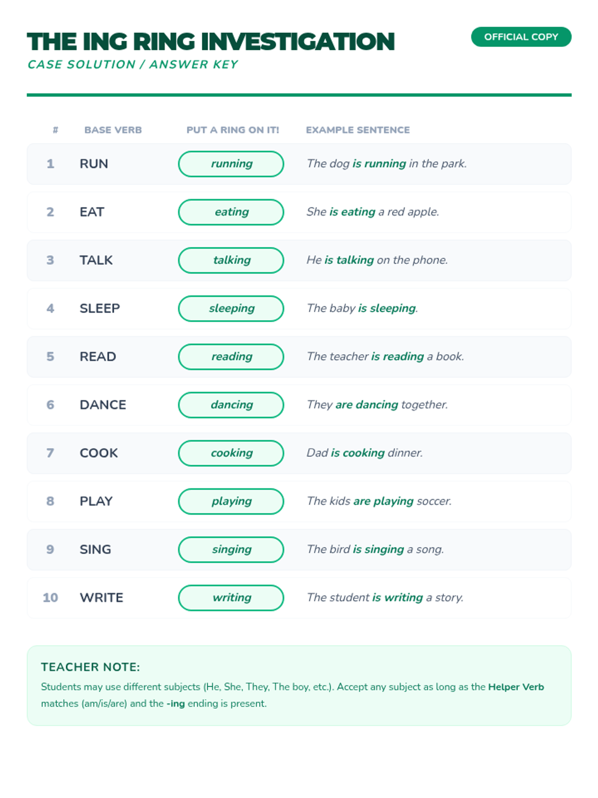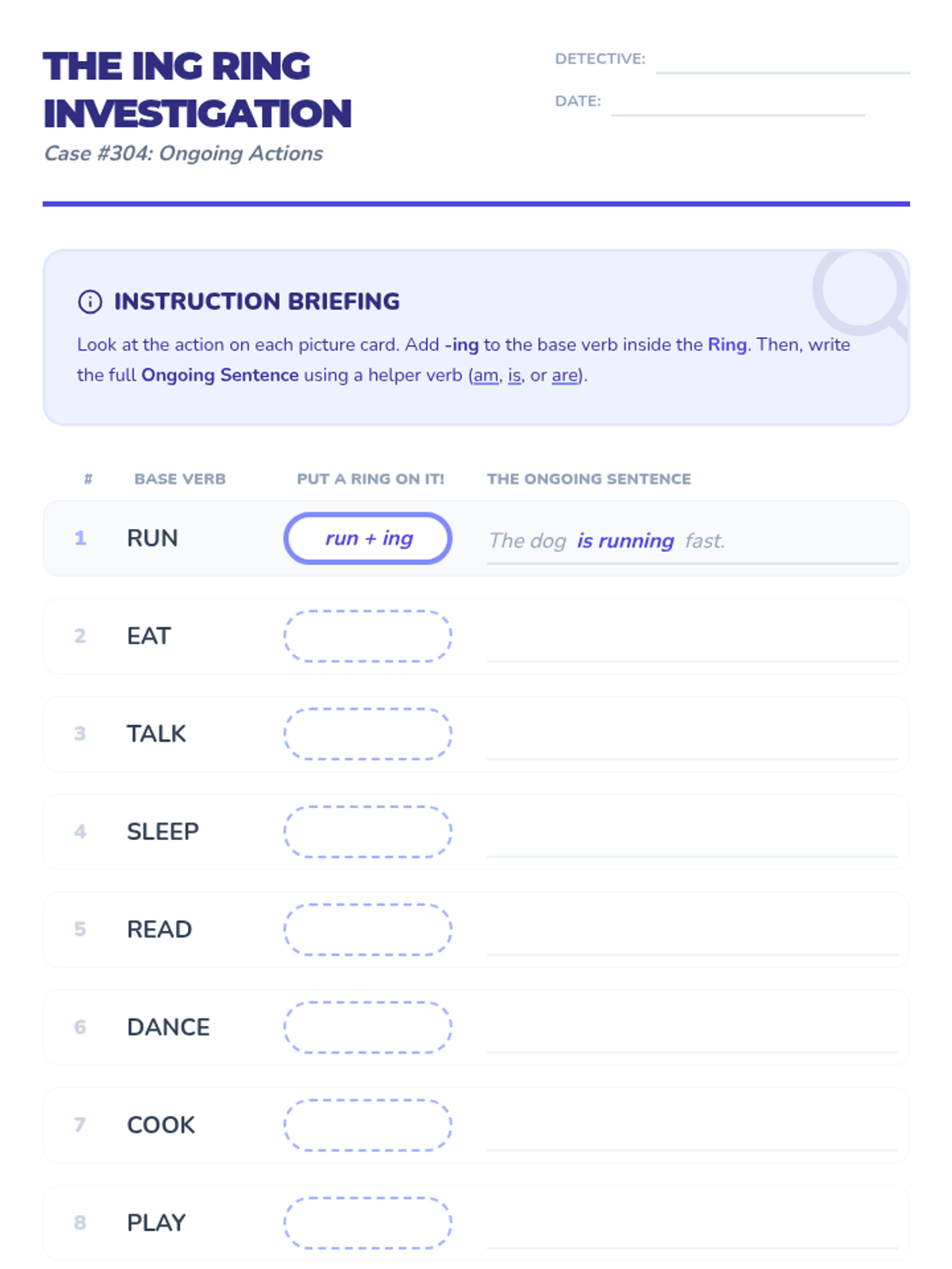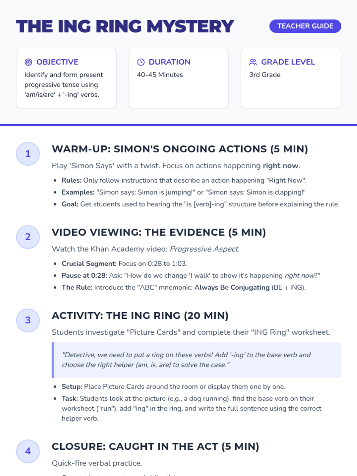 Students will investigate the 'ongoing' world of present progressive verbs. Through a 'Simon Says' warm-up, a video breakdown, and a 'put a ring on it' activity, students will master the use of 'am/is/are' plus '-ing' verbs to describe actions happening right now.
