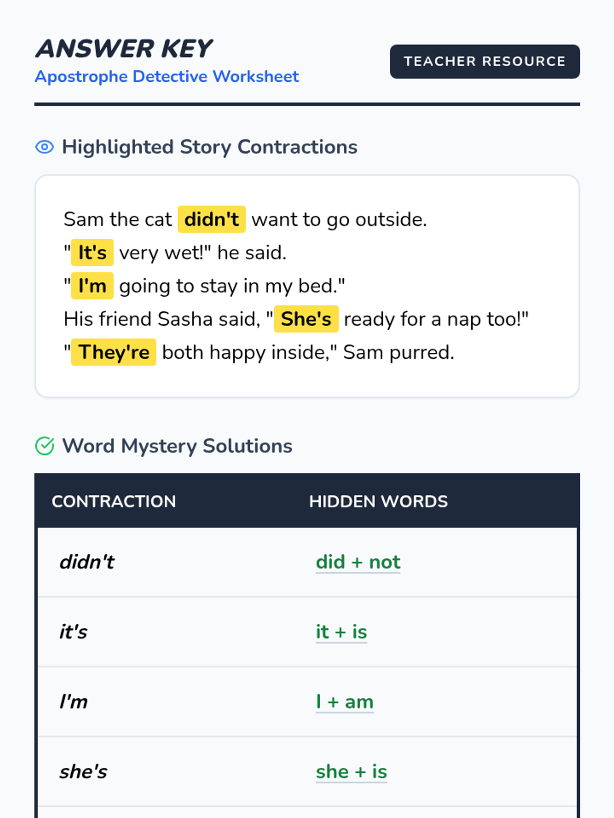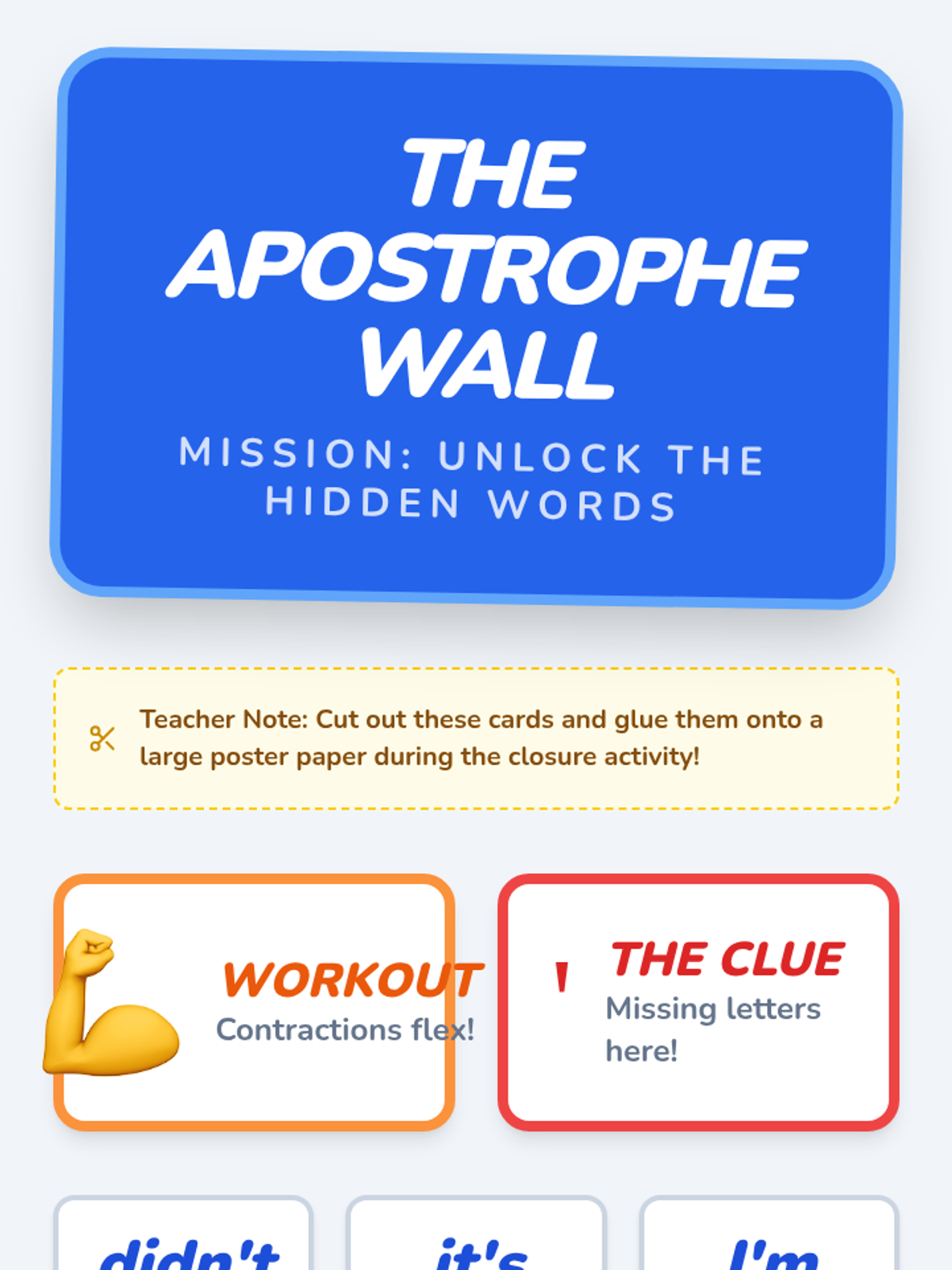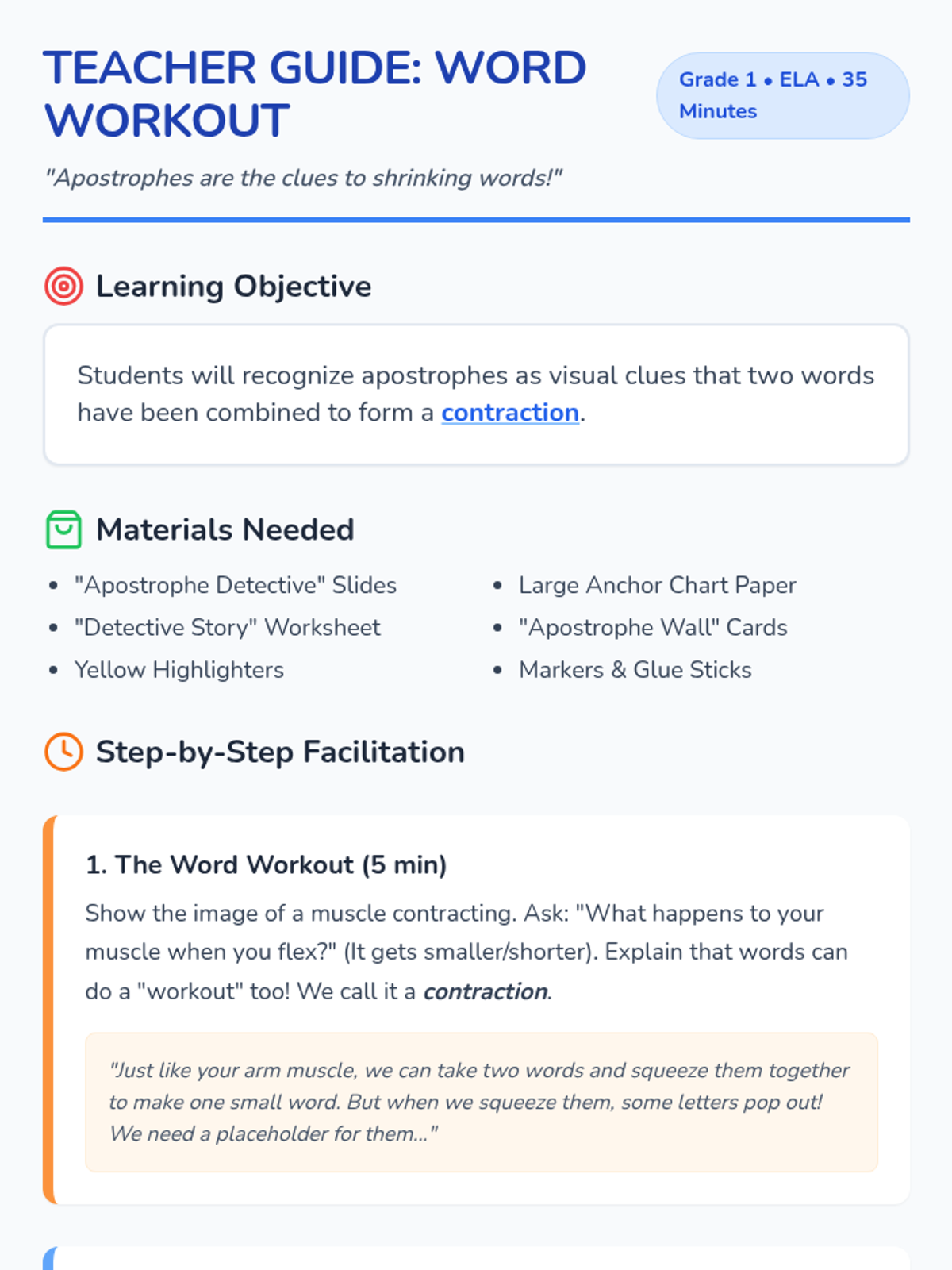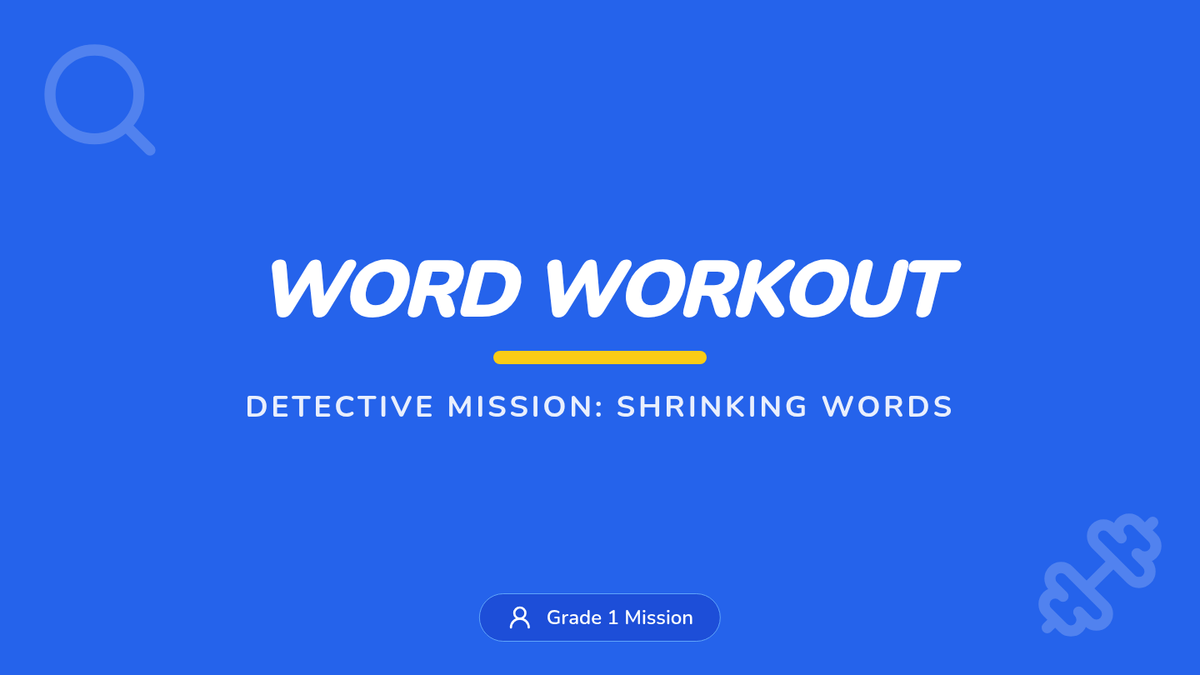 A 1st-grade lesson where students use their 'detective skills' to find apostrophes and uncover the hidden words that form contractions. The lesson features a 'Word Workout' theme, connecting the physical concept of muscles contracting to how words shrink in English.
